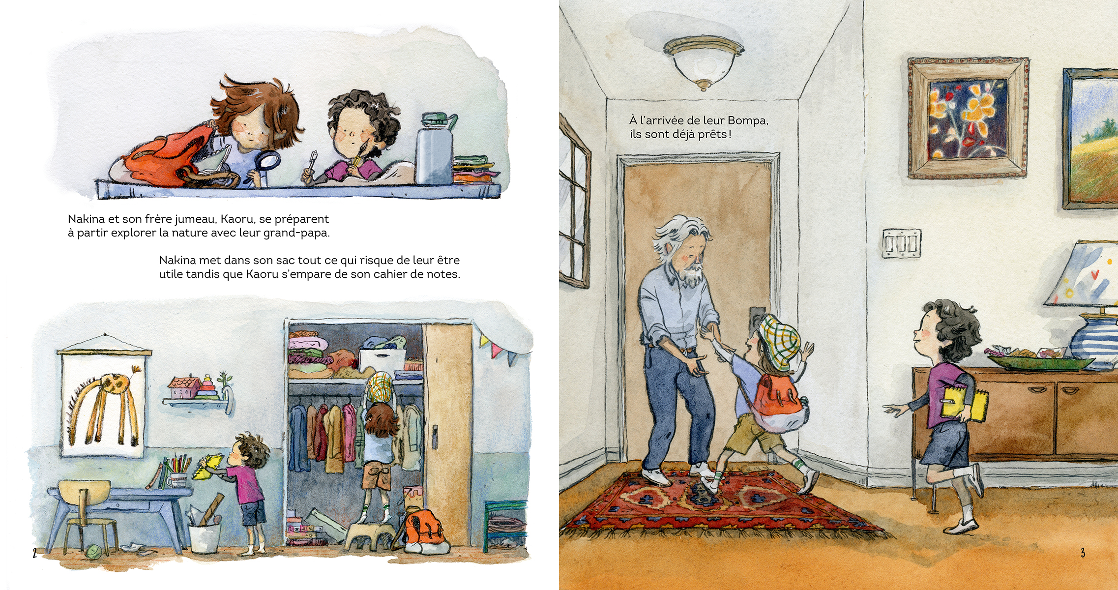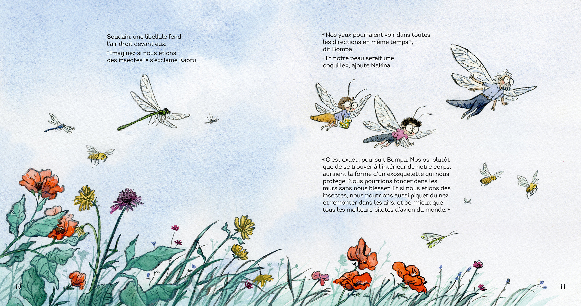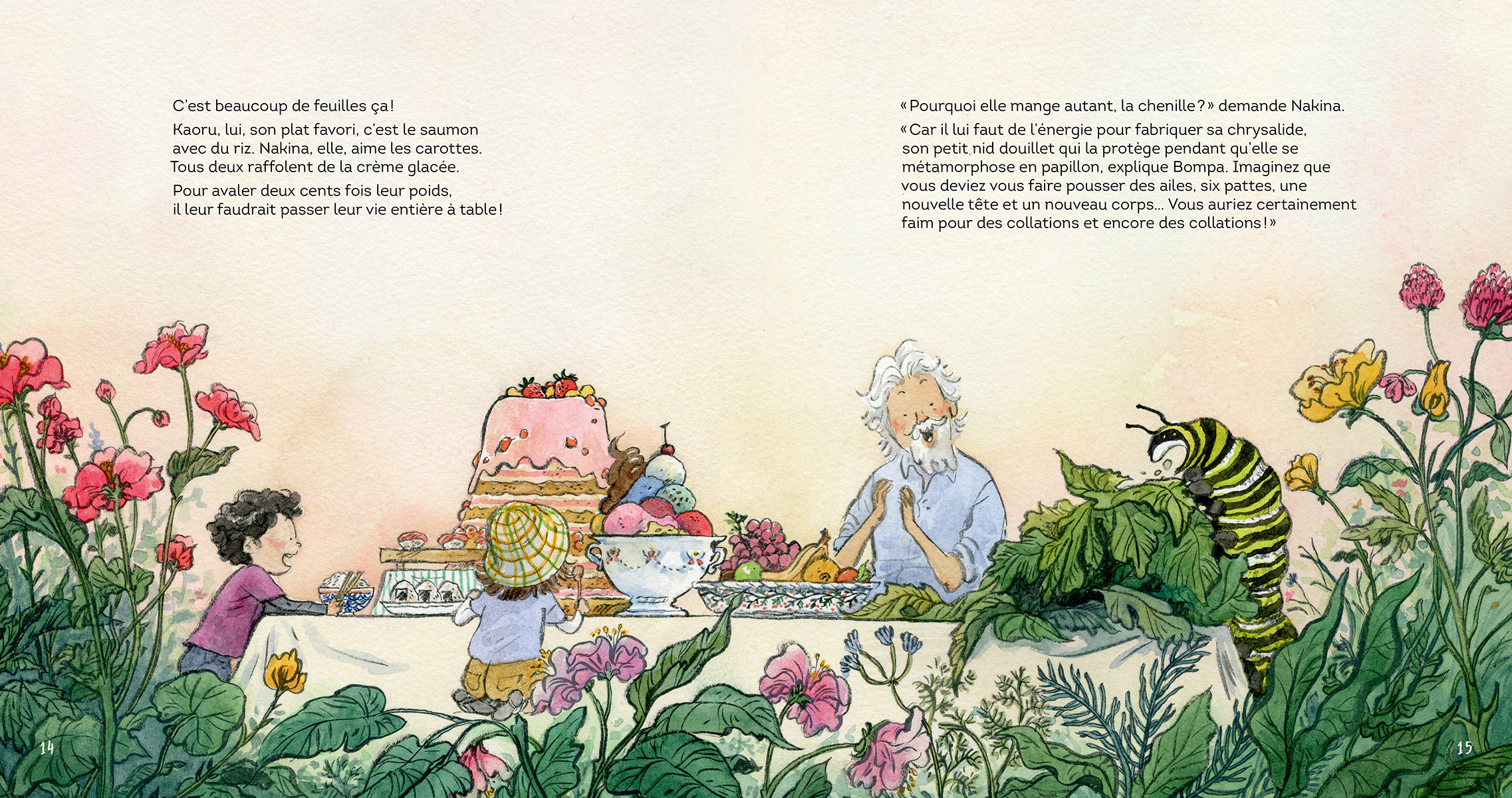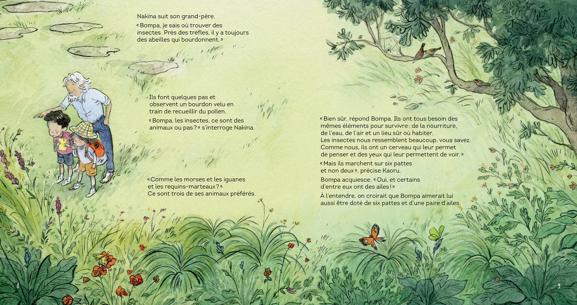 Les jumeaux partent explorer la nature avec leur Bompa. Quel endroit merveilleux découvriront-ils cette fois? Des flaques d’eau de mer à marée basse ou peut‑être iront-ils creux dans les bois? Mais non, apprennent‑ils, légèrement déçus, ils n’iront pas plus loin que dans le jardin. Pourtant, dès qu’ils se mettent à y chercher des insectes, ils découvrent des champions aériens, des mangeurs sans fond et de vraies forces de la nature. À la découverte des insectes avec Bompa, coécrit par David Suzuki et Tanya Lloyd Kyi, est sublimement illustré par Qin Leng et traduit par Gabrielle Filteau‑Chiba. Une promenade luxuriante et colorée à travers un jardin secret…qui nous pend au bout du nez !