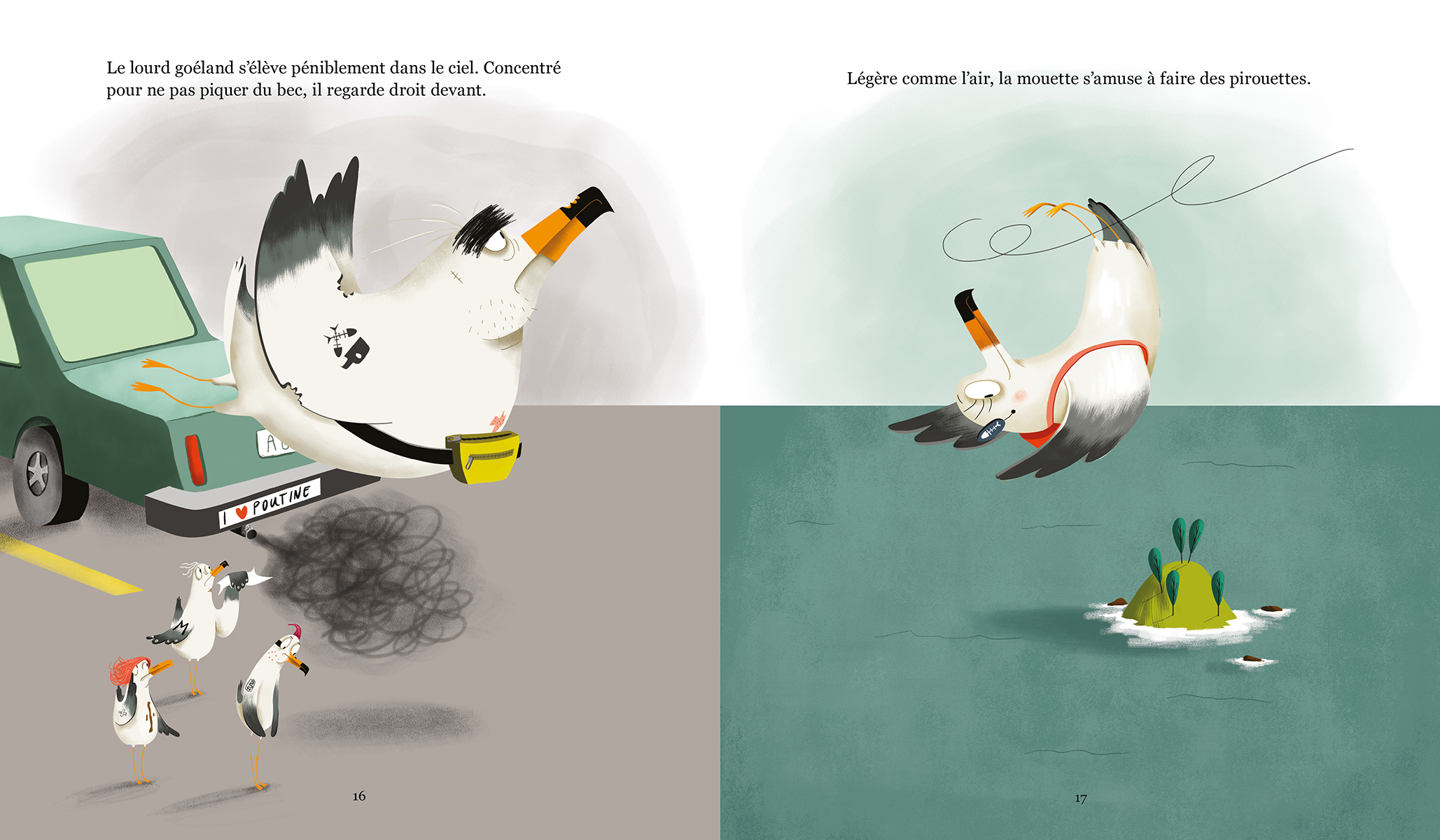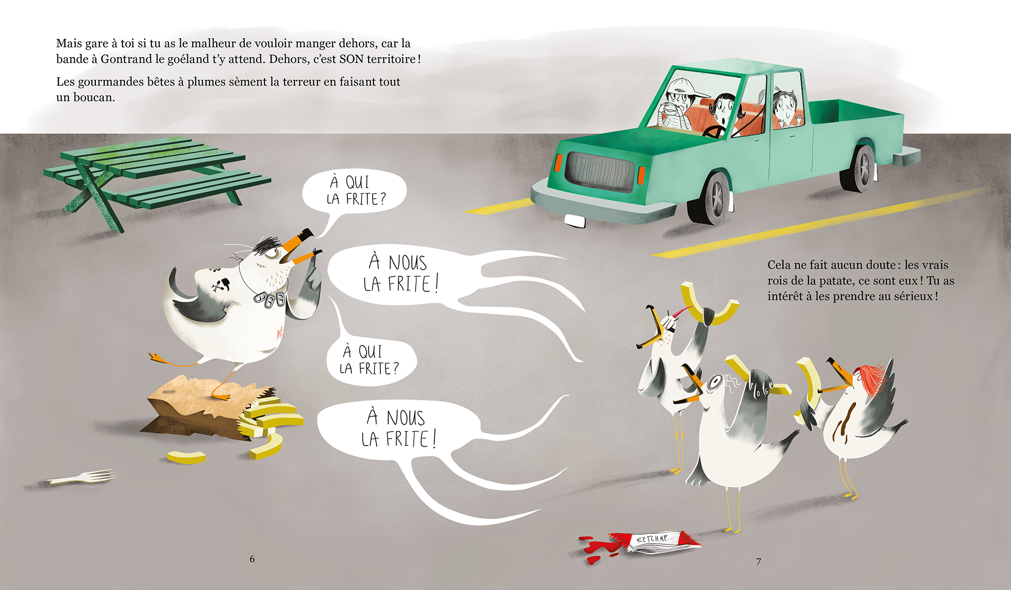À qui la frite ? est une histoire pleine d’humour qui plonge les lecteurs dans une ambiance estivale et décontractée. Légère et enjouée, la narration aborde aussi des thèmes comme les réseaux sociaux et l’envie. Sur la plateforme Facebec, Mariette et Gontrand partagent des tranches de leur quotidien. Le goéland jalouse la vie apparemment insouciante de sa cousine sur sa plage de galets, où elle règne en reine, tandis que lui doit gérer une bande de mouettes écervelées et tapageuses. Ce qu’il ignore, c’est que le sentiment est réciproque : Mariette envie secrètement ses amitiés et son régime à base de friture.