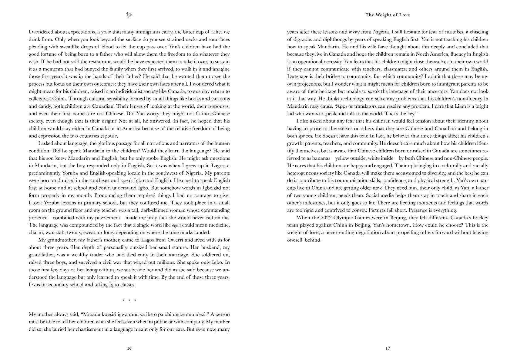 Ije: An Immigrant’s Voyage into Prince Edward Island Life takes its meaning from the Igbo word for journey, and spotlights the narratives of immigrants to Prince Edward Island, shining light on their individual experiences. This collection of personal reflections, interviews, photo essays, and works of art explores the concepts of belonging, imposed and realized identities, cultural traditions, culinary symbols, and living the contradictions of social norms. From chefs to hairdressers, academics to entrepreneurs, Ije encompasses the resilience of a people inspired to innovate their own community-driven solutions.