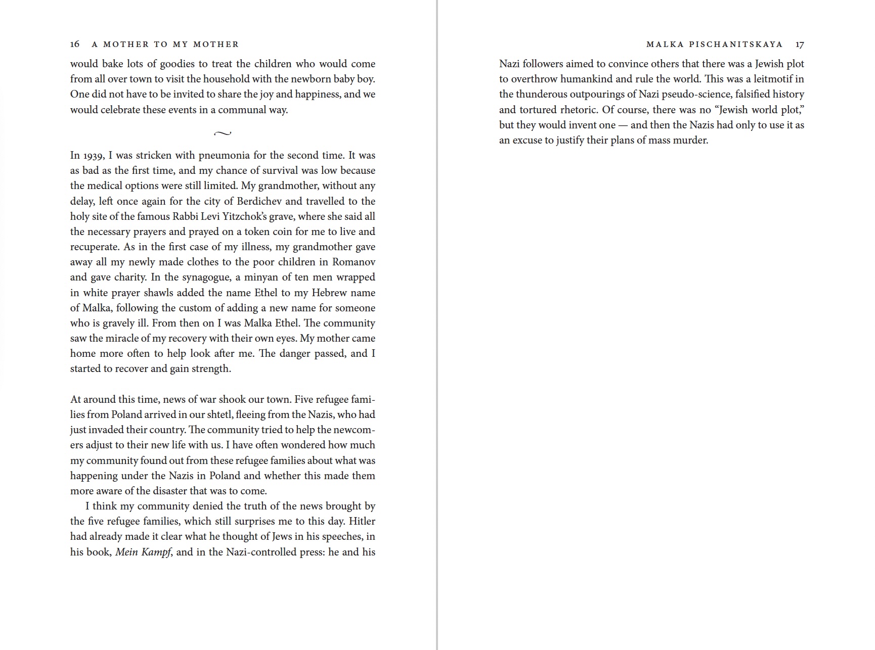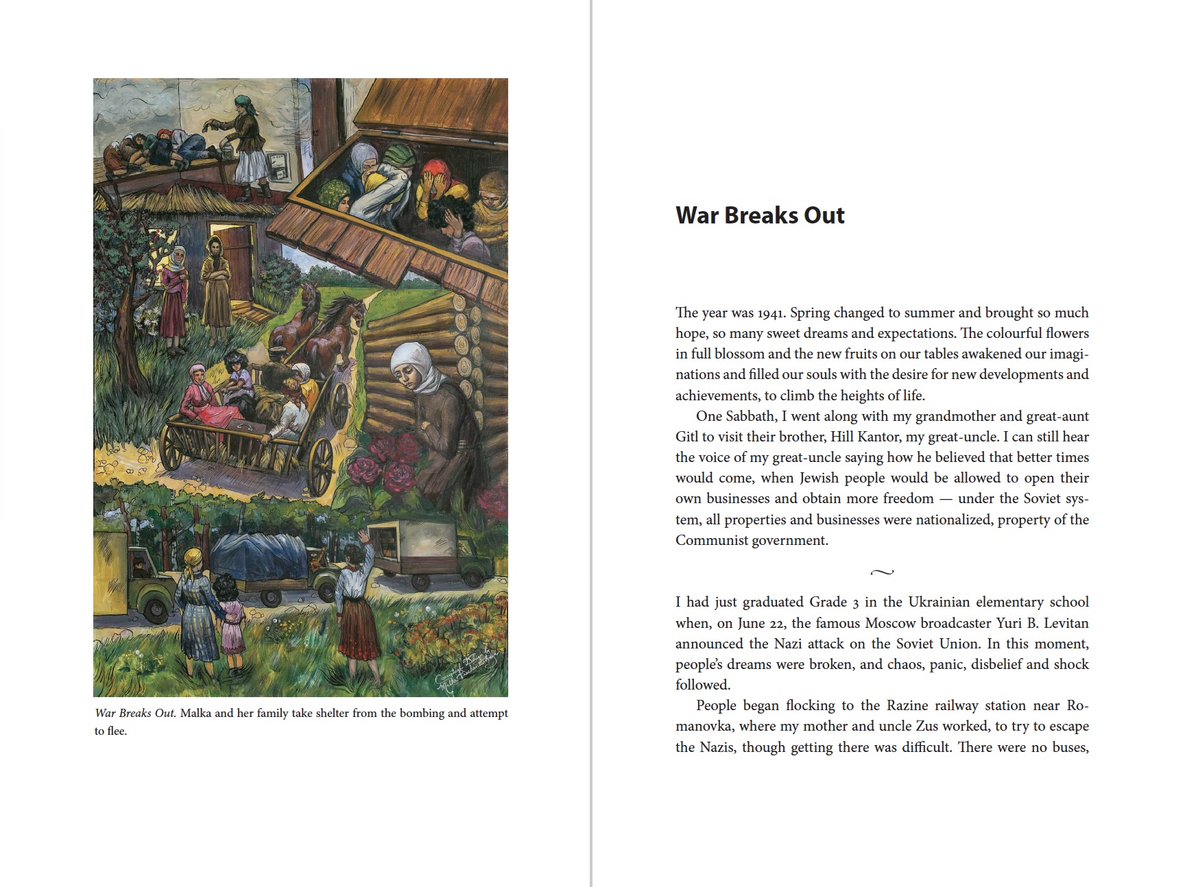 It is the summer of 1941, and Malka is ten years old. Her small town of Romanov, Ukraine, has just been occupied by the Nazis, and Malka’s Jewish traditions, culture and community are under attack. Malka and her mother manage to escape, hiding in fields, forests and haylofts as danger forces them to continue moving. As Malka relies on her faith and instincts to keep herself and her mother alive, she finds them refuge with strangers who become like family along the way.
