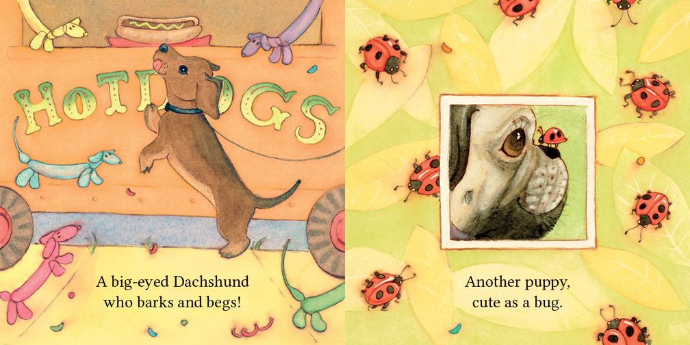 In this follow-up to A Carnival of Cats, babies, toddlers and dog-lovers alike will enjoy discovering and guessing what breed of puppy is hiding on the next page.