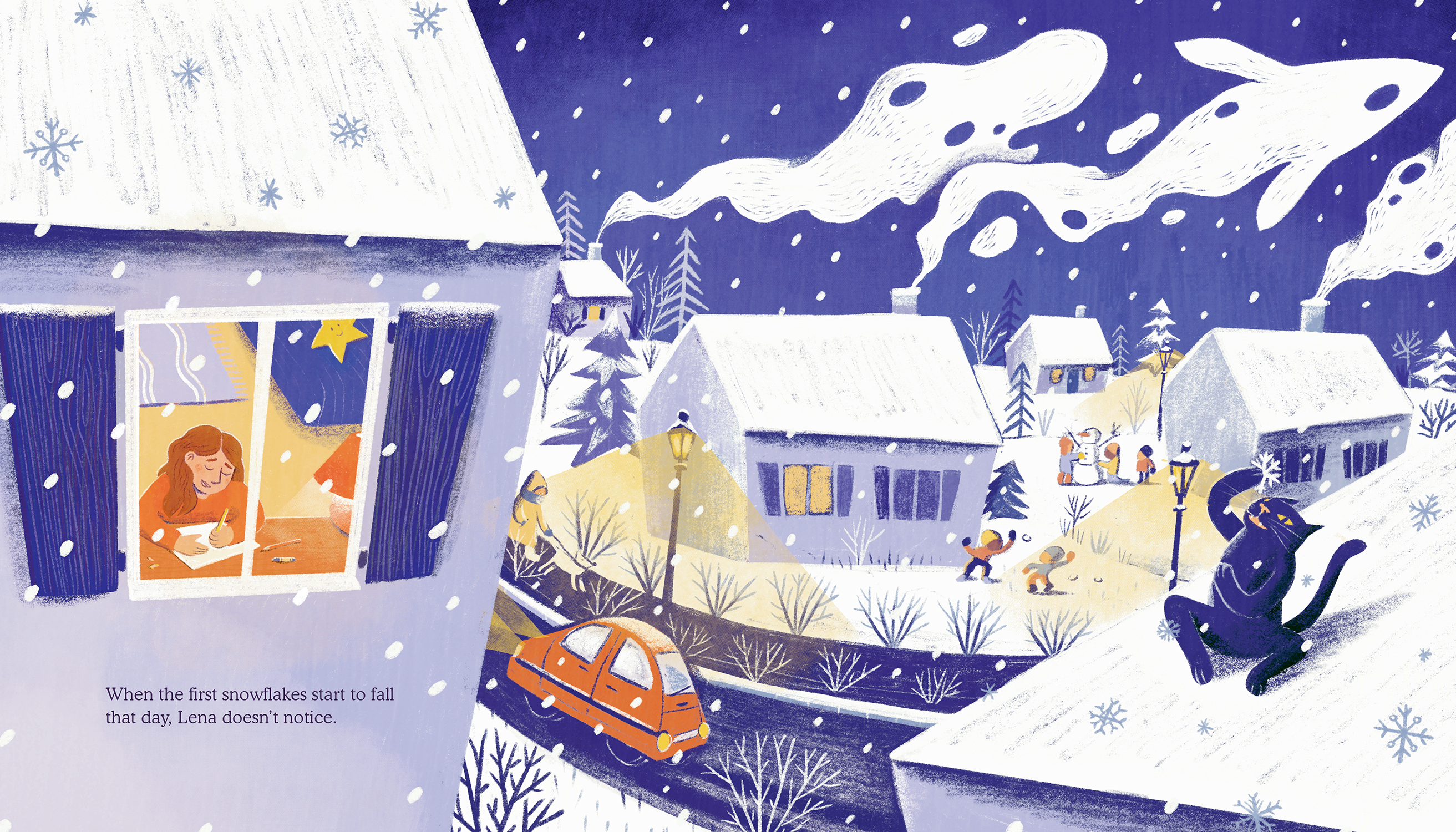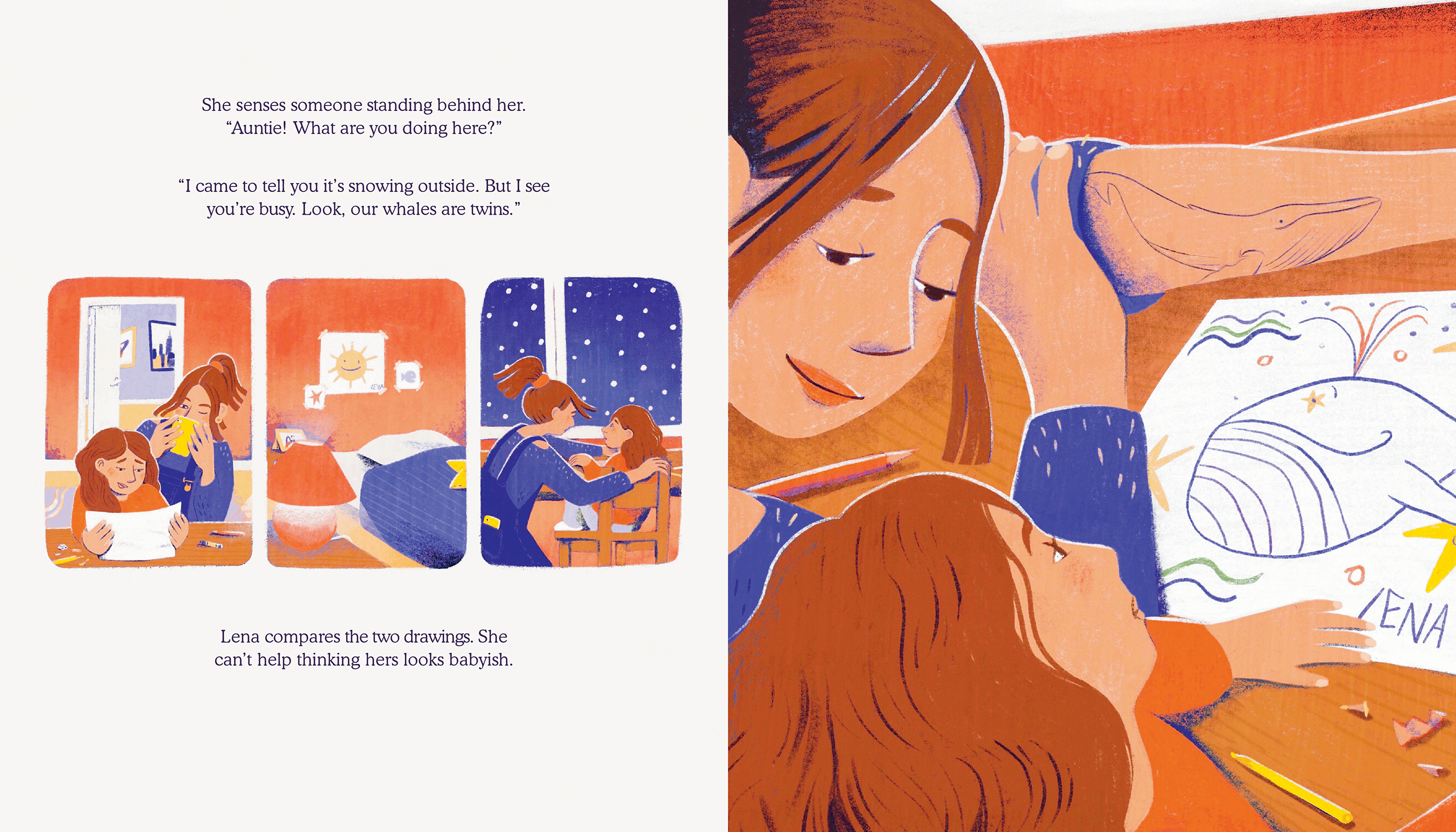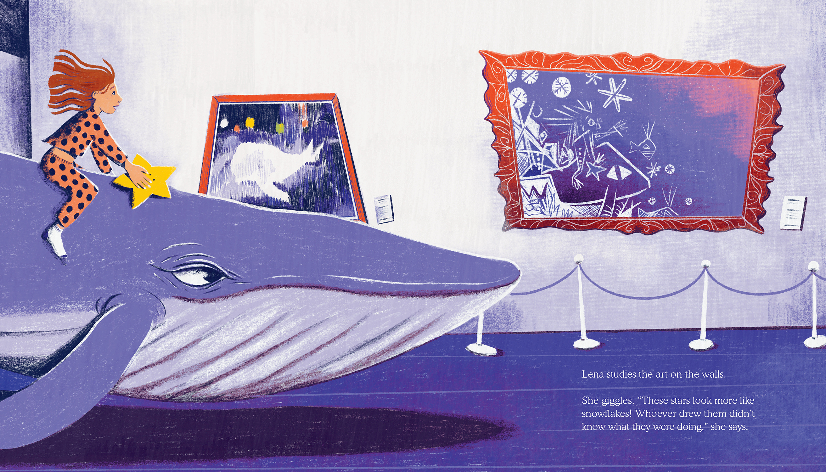 That night in her dreams, Lena soars through the skies on a whale's back. The whale takes her to a museum, where they explore the works of great artists like Helen Frankenthaler, Vincent van Gogh and Pablo Picasso. Gradually, she begins to see that although these famous artists could paint or draw accurately if they wanted to, they chose to instead channel their inner child and carefree spirit. When Lena awakes, she understands that her drawing was a masterpiece of its own. Luckily, her aunt found a way to preserve it forever.