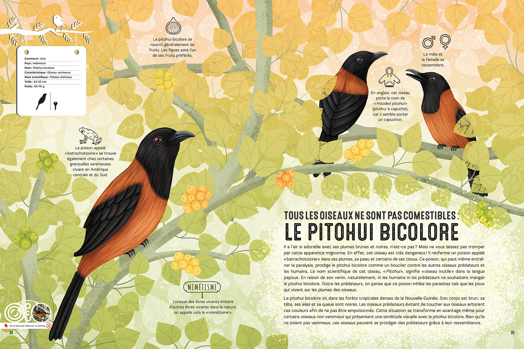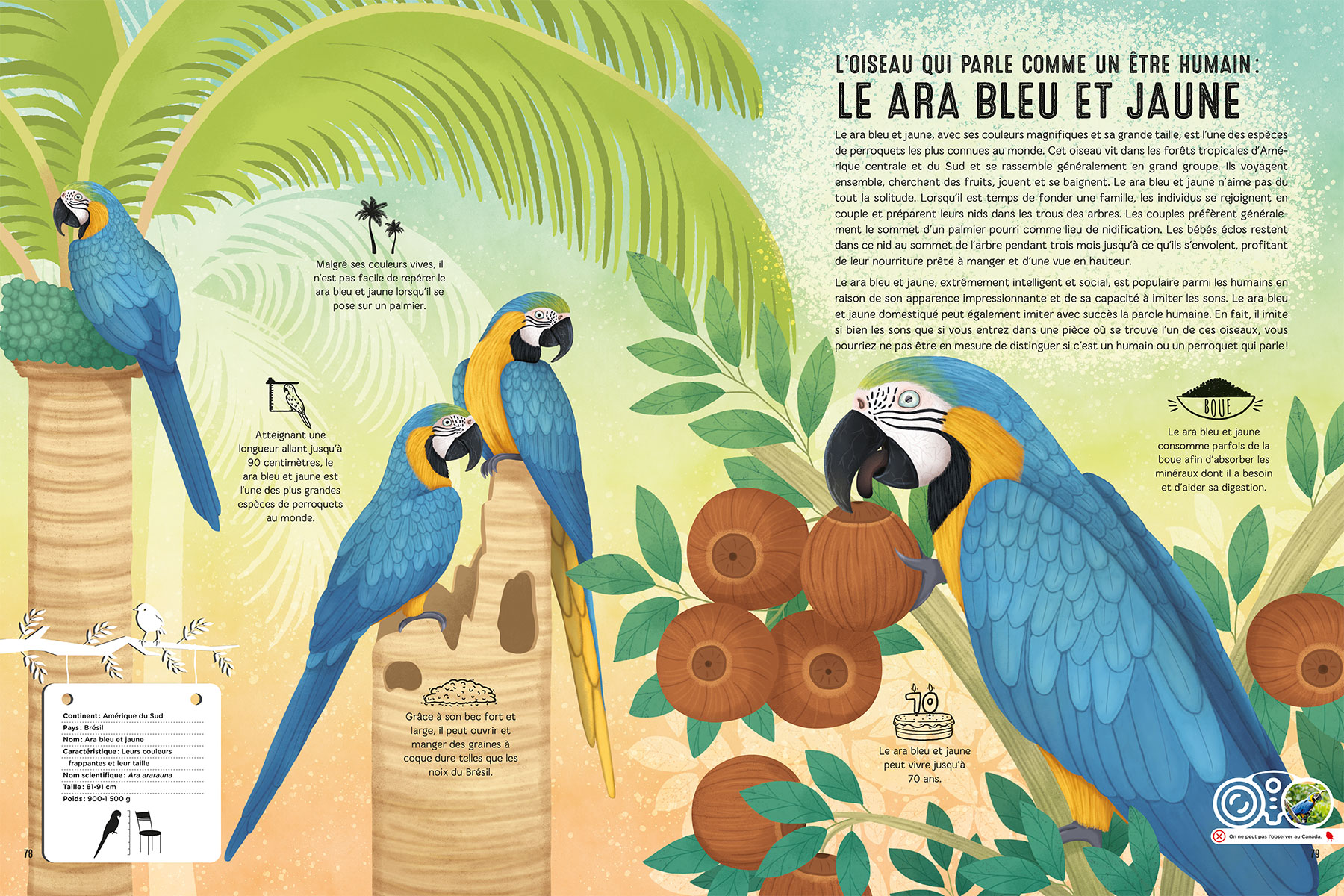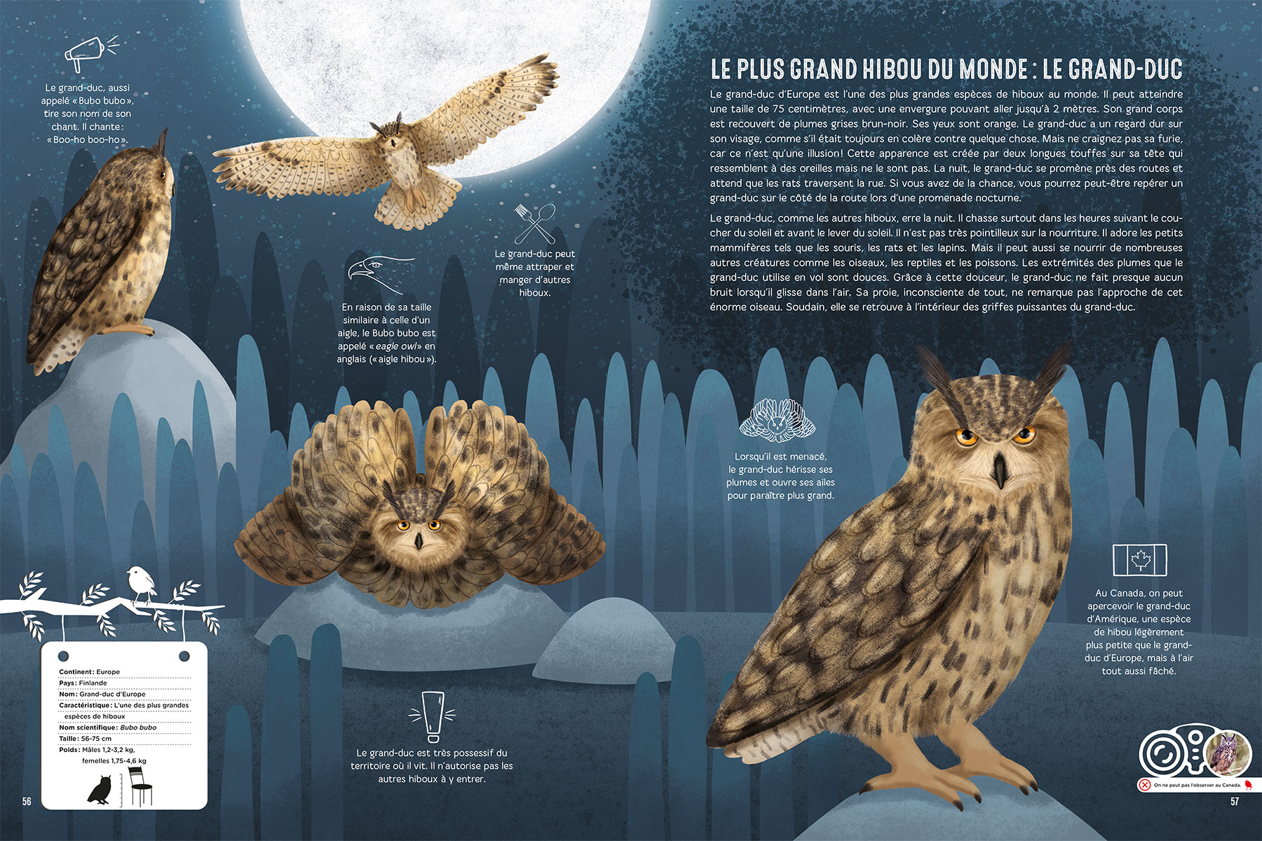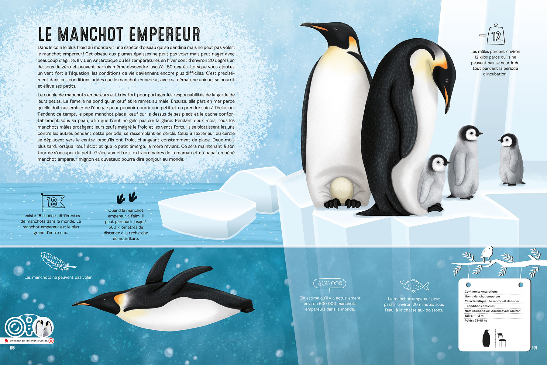 Le faucon pèlerin est la créature la plus rapide du monde. Le hoazin huppé sent mauvais (ce n’est pas de sa faute, mais c’est désagréable). La grande outarde est si grosse que, de loin, elle ressemble à un mouton. Le monde des oiseaux regorge de faits curieux et fascinants. Cet atlas permet de voyager sur 7 continents et de se familiariser avec 52 espèces d’oiseaux. Certaines sont communes, d’autres sont exotiques, mais toutes émerveillent par leurs caractéristiques singulières. Il ne reste qu’à les découvrir!