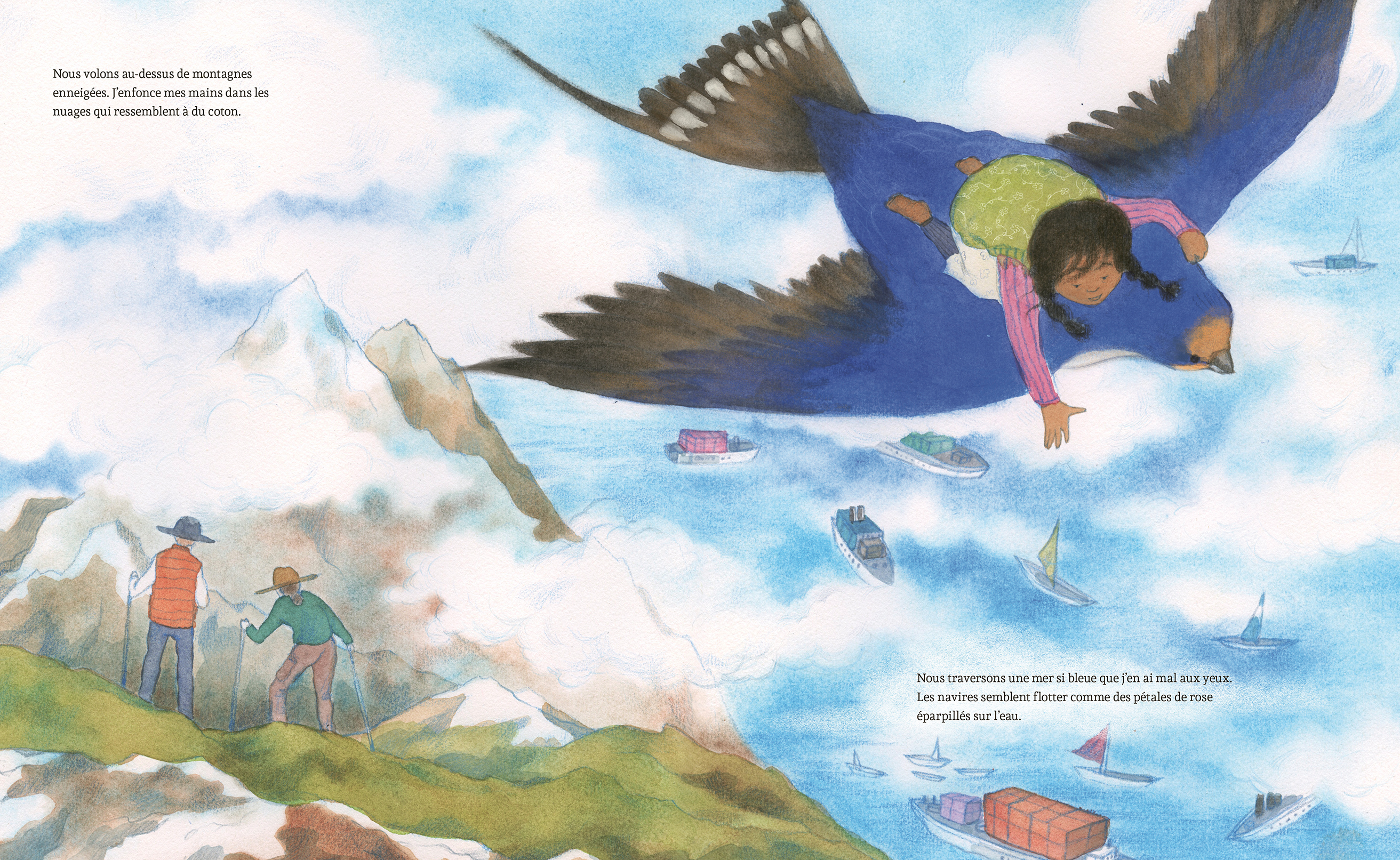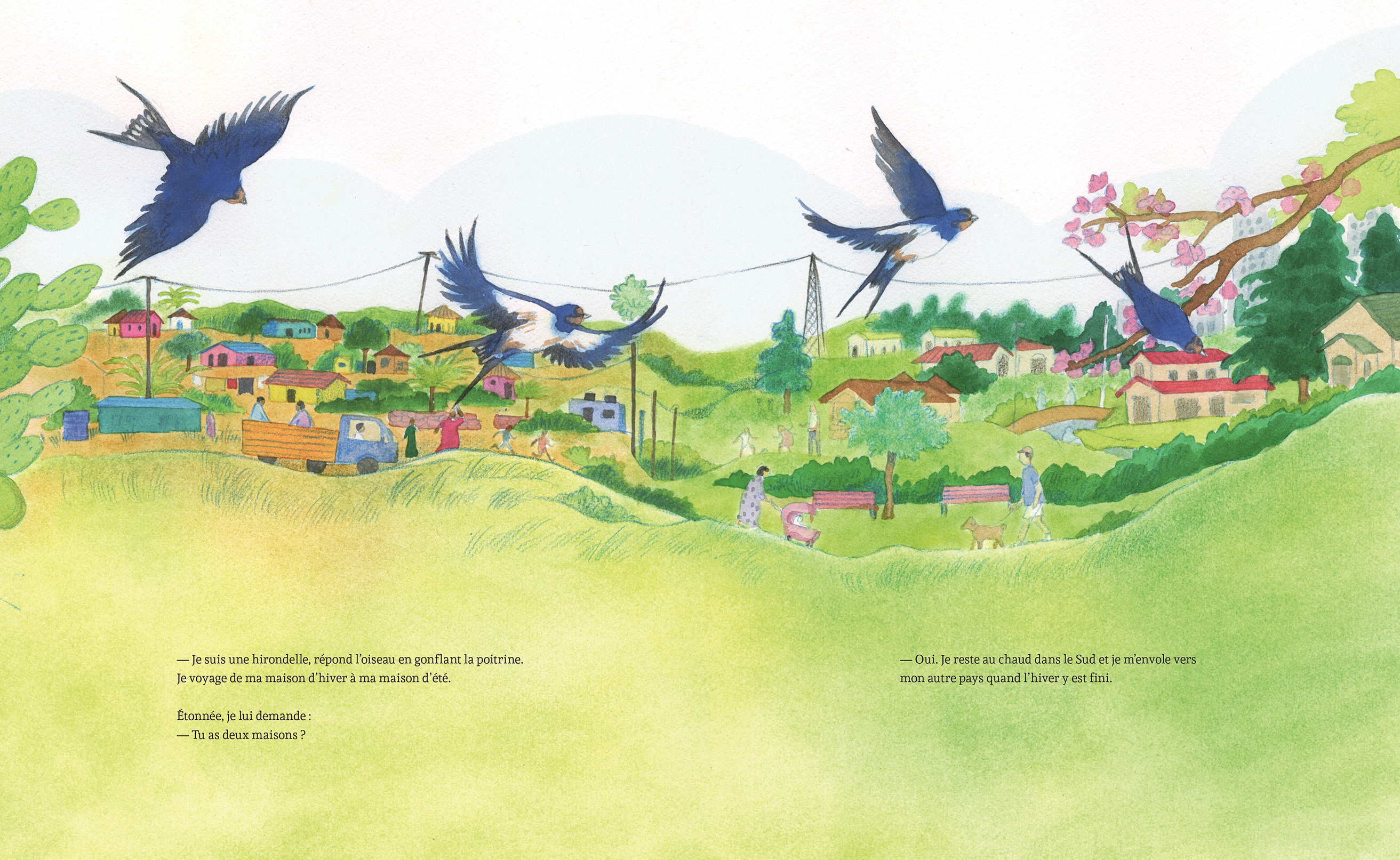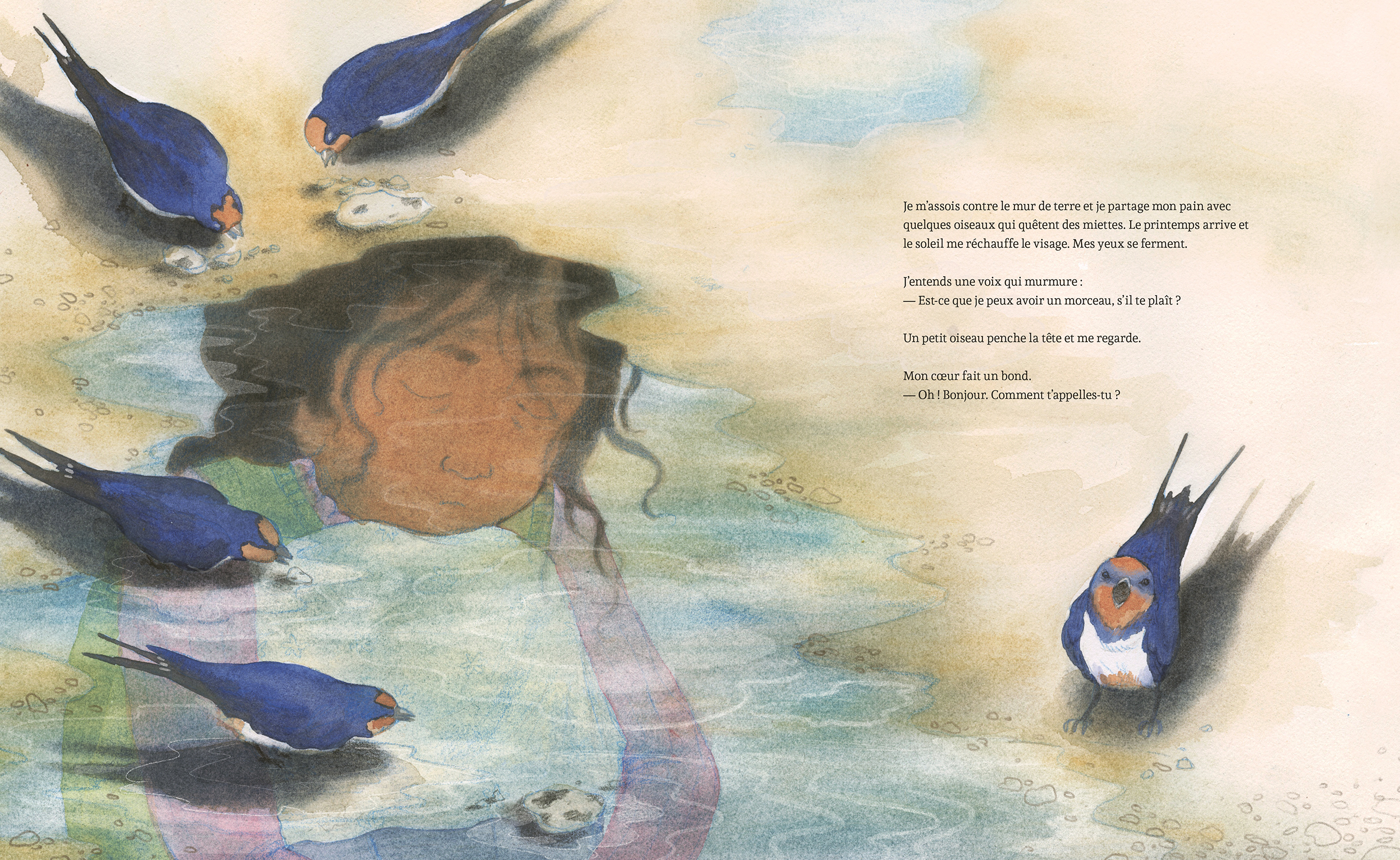 Pendant une pause à l’extérieur, Ayah aperçoit une hirondelle qui lui pose une drôle de question : « Pourrais-tu me donner un peu de pain, s’il te plaît ? » Ayah partage sa collation et l’oiseau lui raconte ses voyages. Puisqu’Ayah n’est jamais sortie de l’enceinte du camp, elle croit que tout est dangereux de l’autre côté de la clôture. L’hirondelle lui explique qu’il y a de nombreux endroits où il n’y a pas de guerre. Elle l’invite à grimper sur son dos pour l’emmener explorer le monde de ses propres yeux. Ensemble, la petite fille et l’oiseau survolent des champs, des montagnes et des villes animées. À son retour, Ayah se met à rêver d’un avenir où elle sera libre.