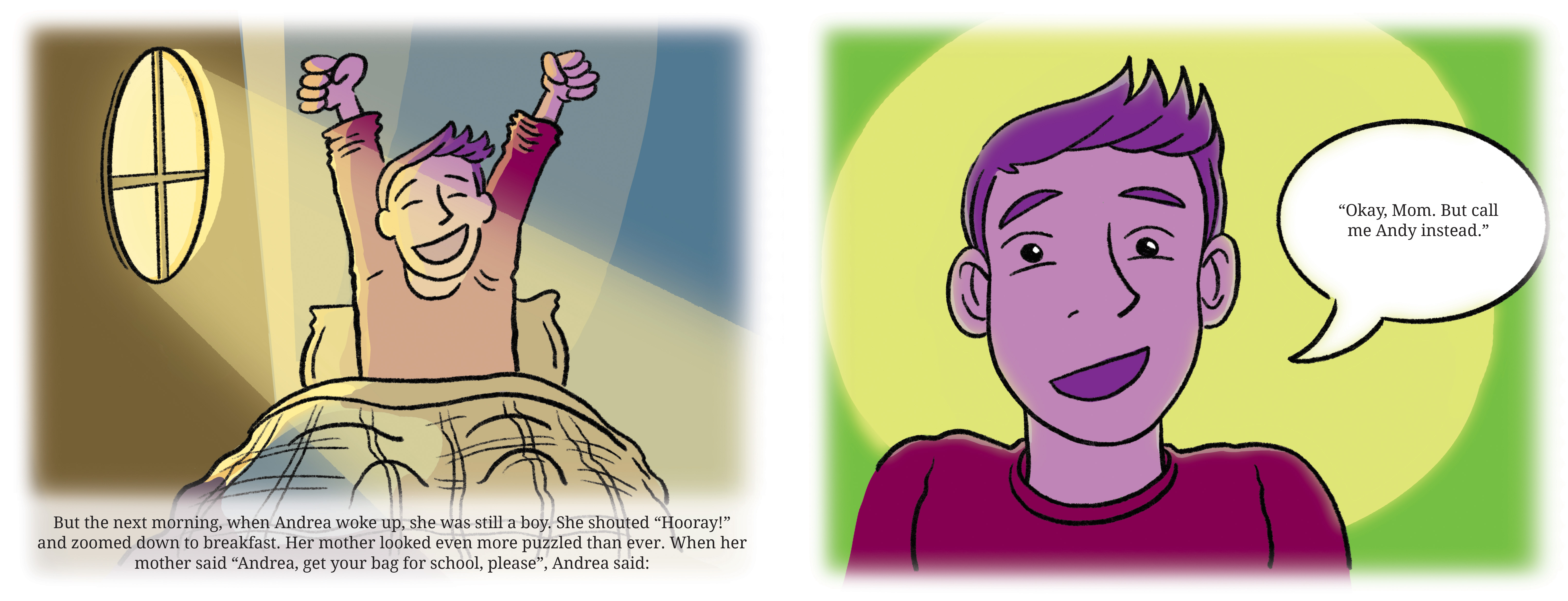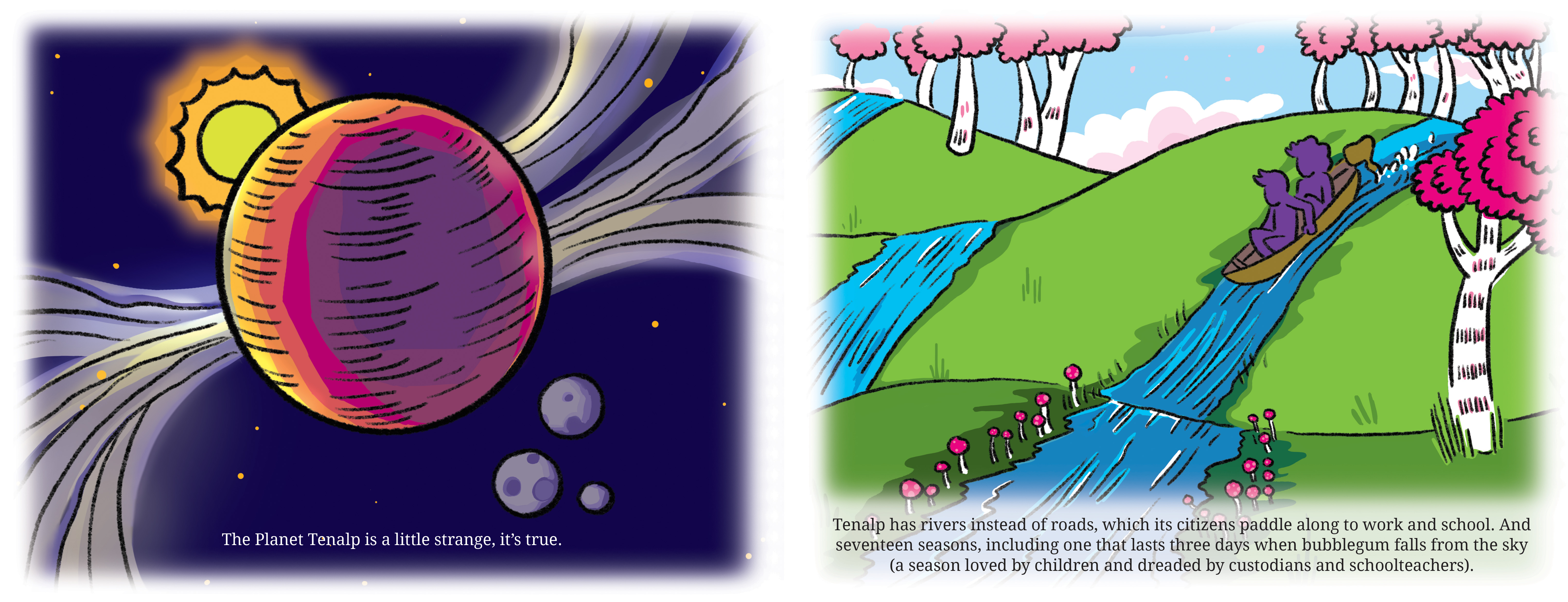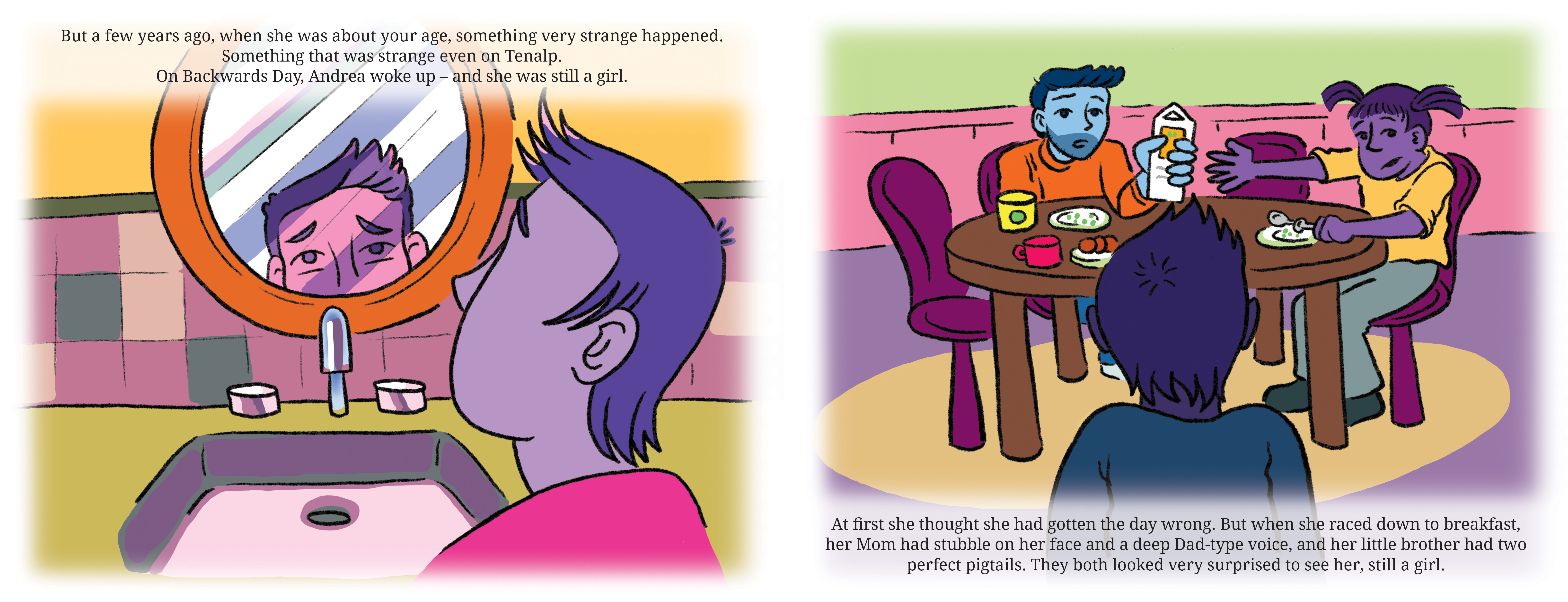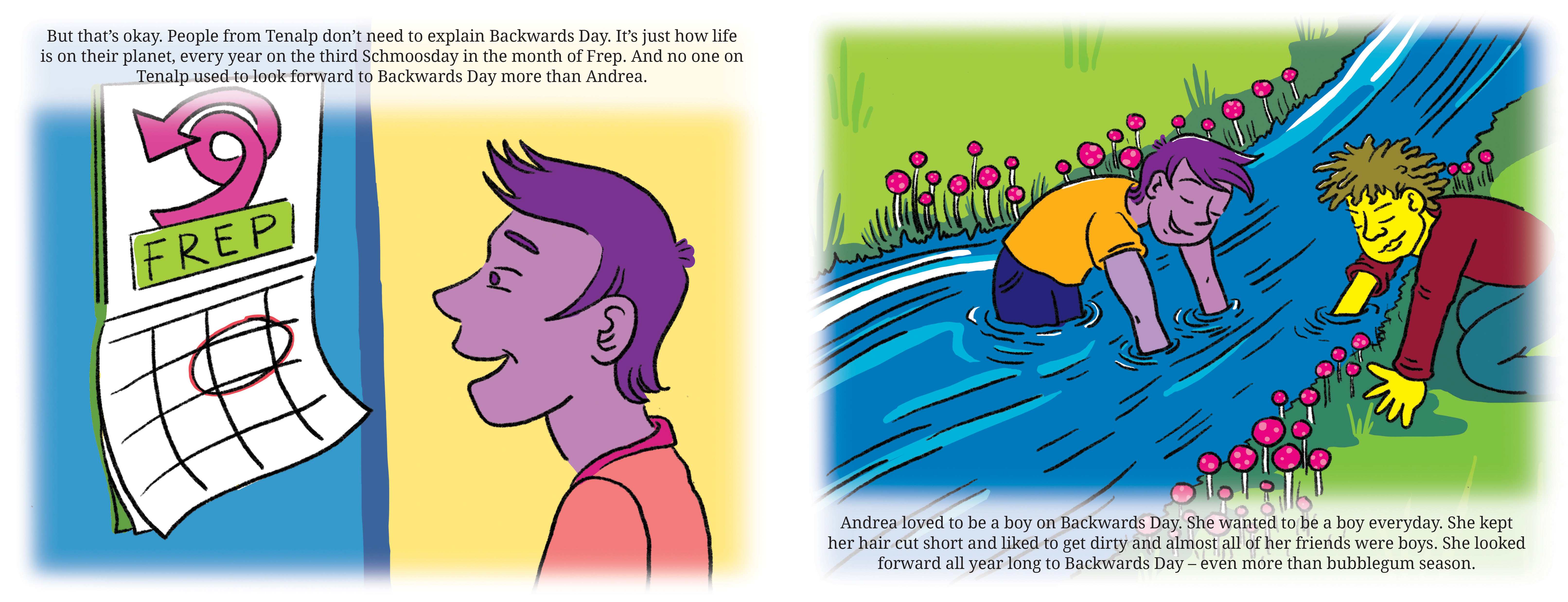 Backwards Day, set on the planet Tenalp, introduces us to a world where there are seventeen seasons, including one where bubblegum falls from the sky for three days and a single day when everything—everything everywhere—is backwards. Andrea looks eagerly forward to Backwards Day every year, so she can turn into a boy for the day. But one year she doesn't turn along with everyone else. She's miserable. The very next day, however, she turns into a boy—and stays that way! He's delighted, but his parents are distressed, and take him to the big city to consult with Backwardsologists. When they finally figure out what's happened, the miracles of Backwards Day are fully revealed.