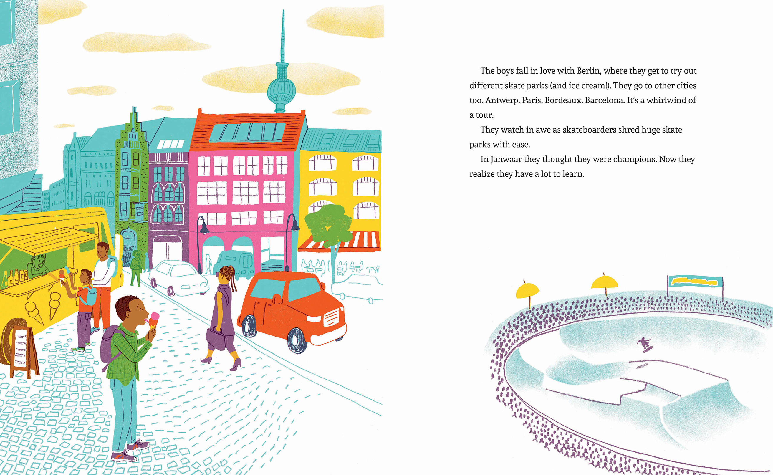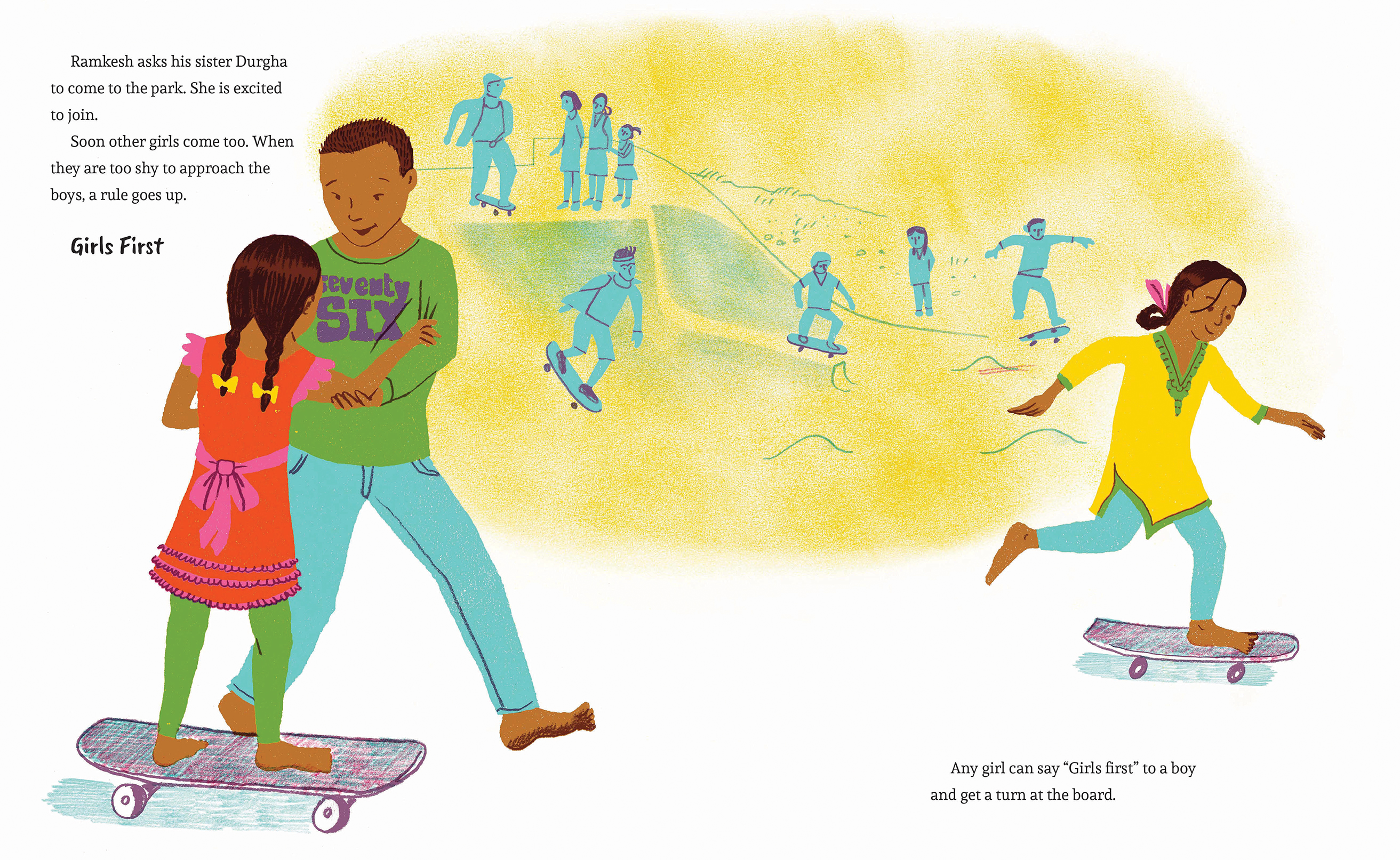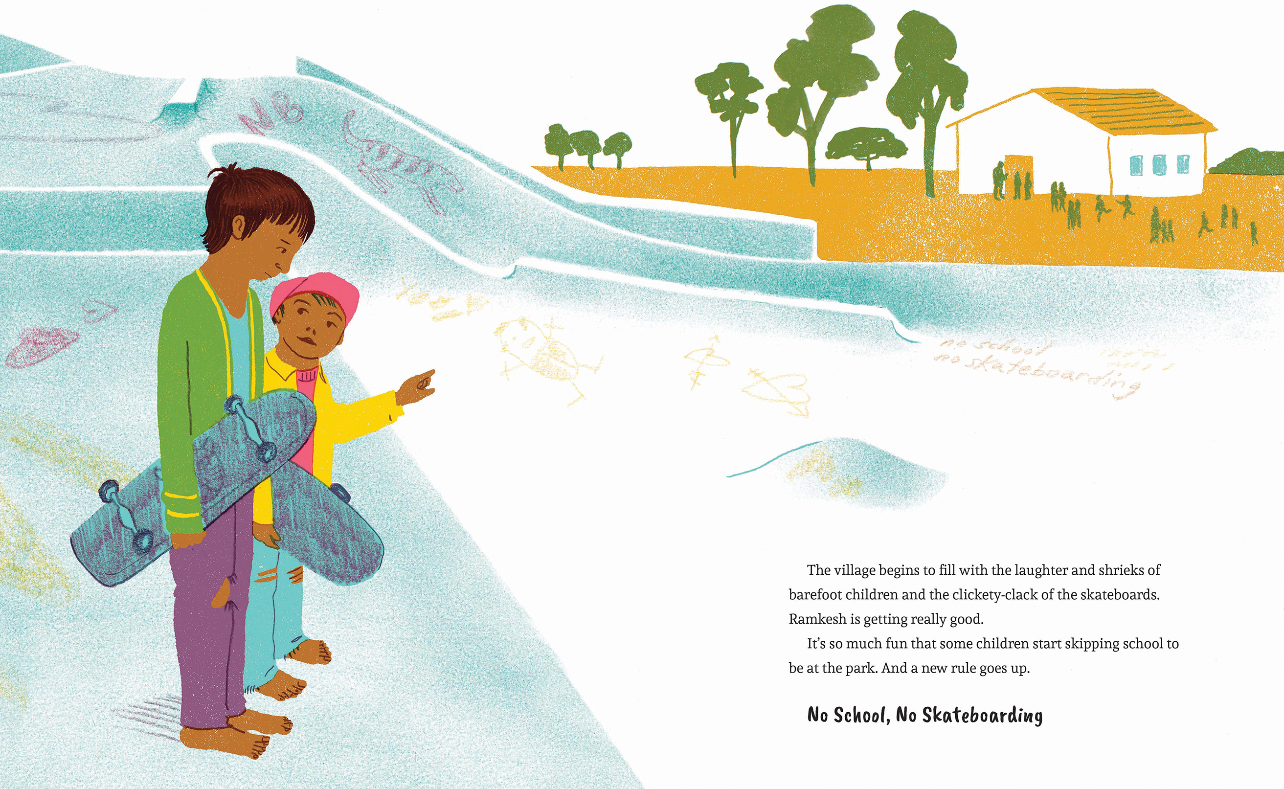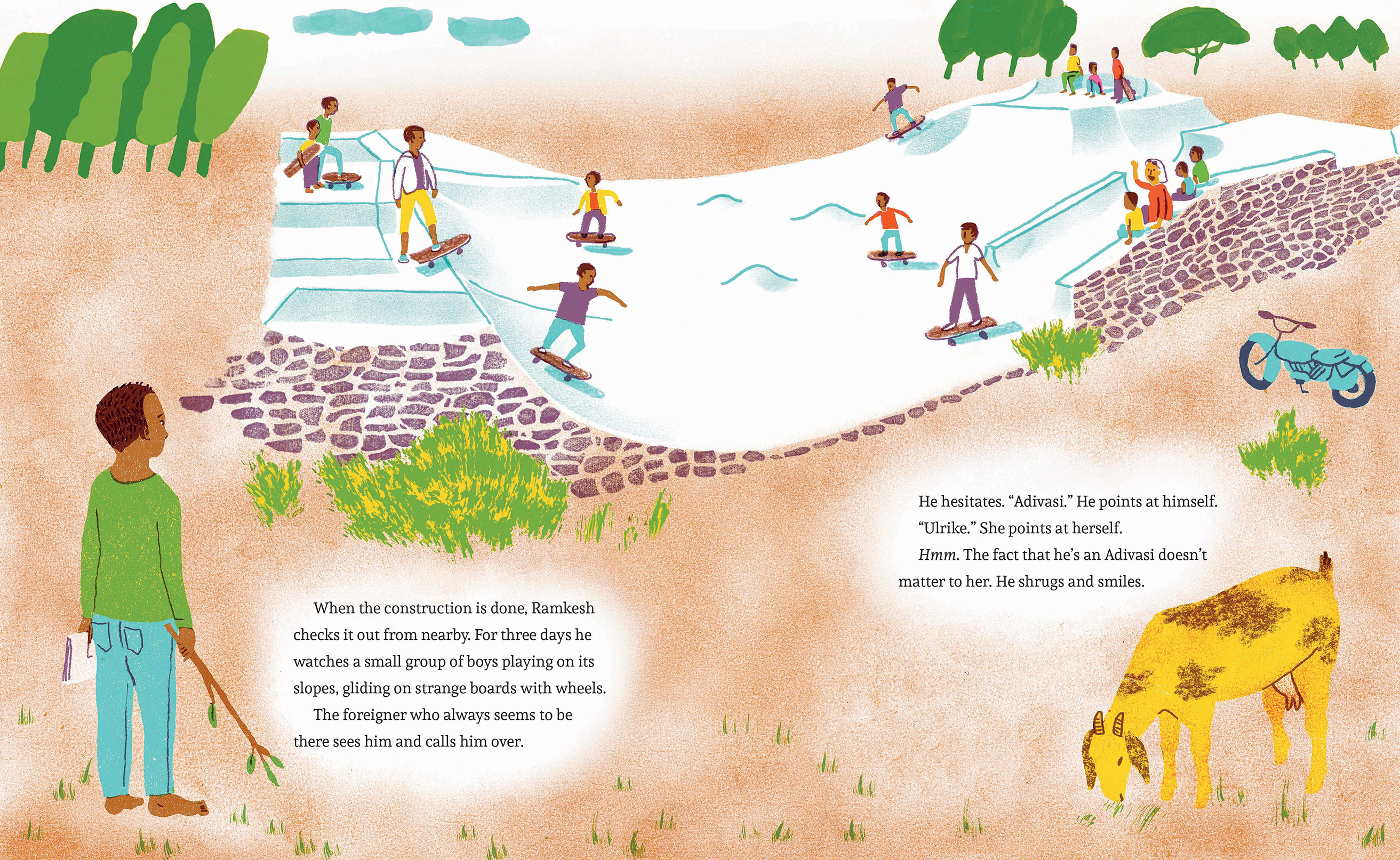 Ramkesh can't tell what it will be—it's all ramps and hills. When it's done, he sees kids playing on it, on strange boards with wheels... Soon, he's invited to try, and he's hooked—practicing tricks and soaring on his skateboard. At first, it's all boys, but Ramkesh invites his sister, and other girls join too. Word gets out that the tiny village is a hotbed of skateboarding talent, and people flock from all over to see it, and to teach the kids new tricks. Ramkesh and his friends even get invited to travel, gaining the first-ever passports for their village. But most important, they come back home to tell of their journeys...and to lead the way for Janwaar into the future, with a newfound sense of joy and unity.