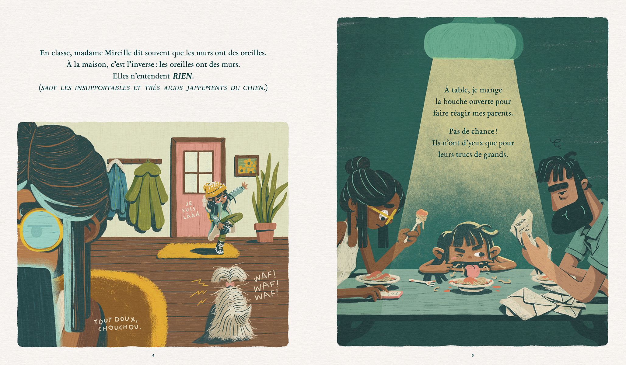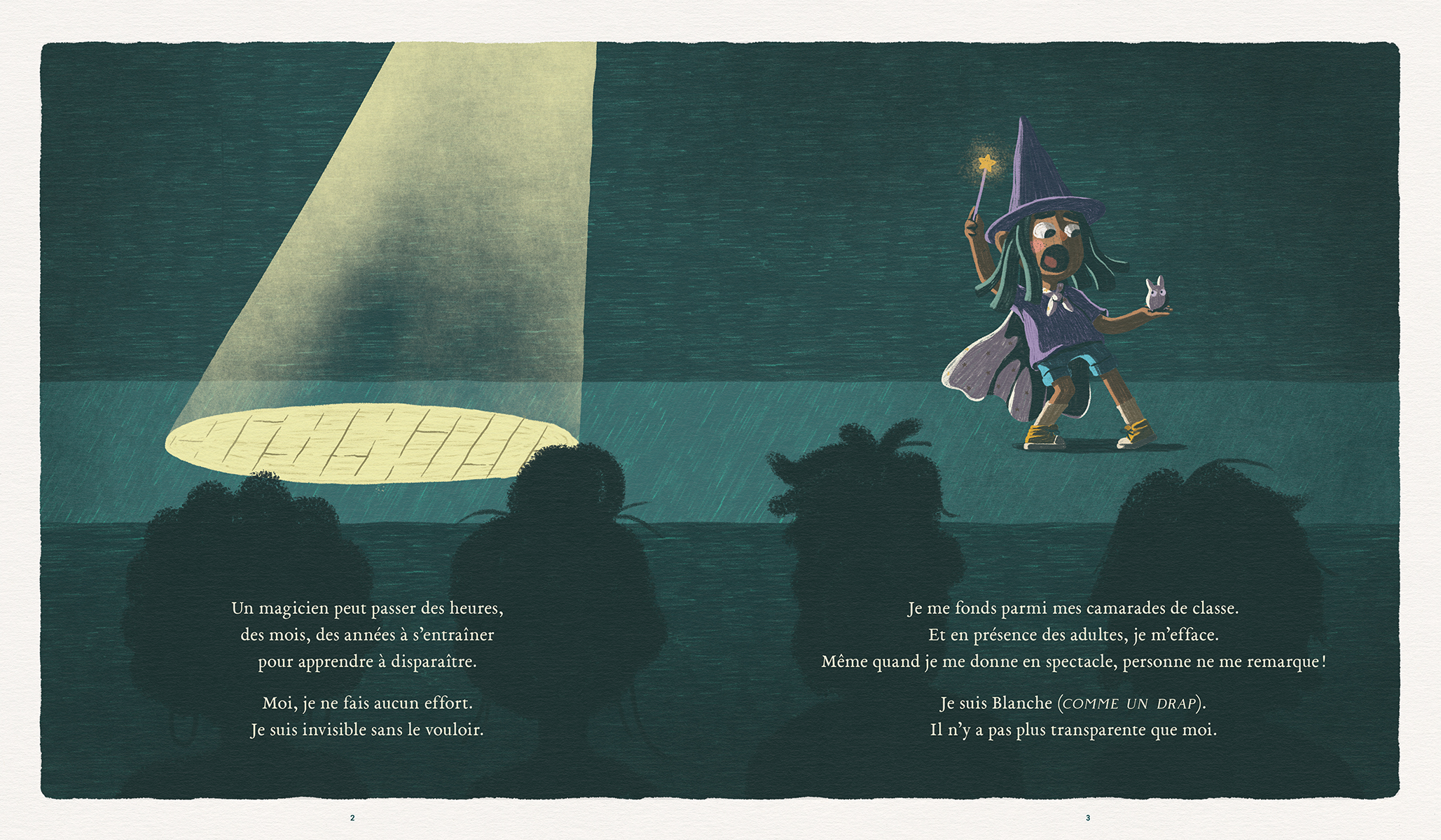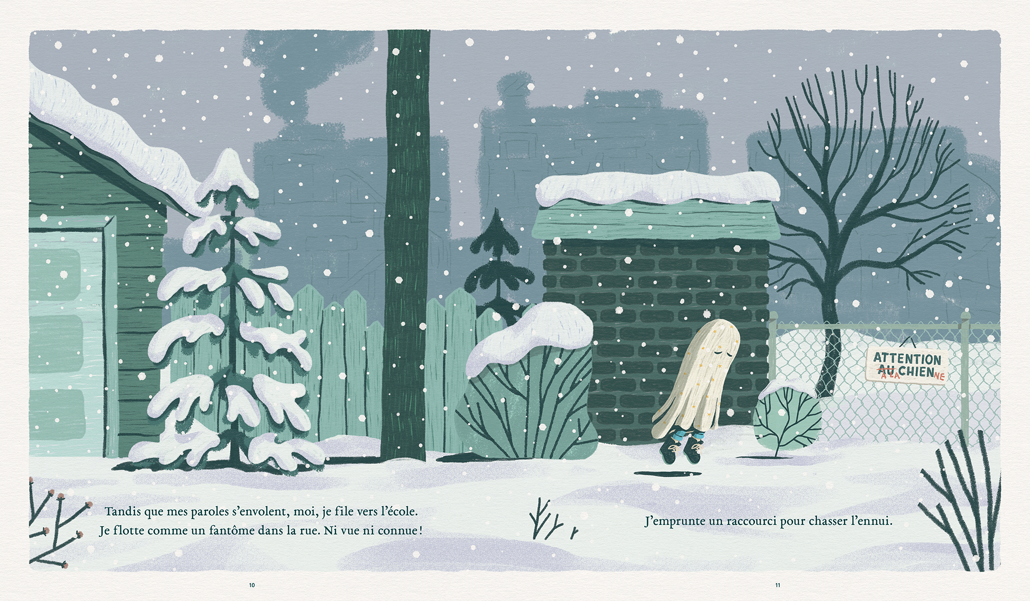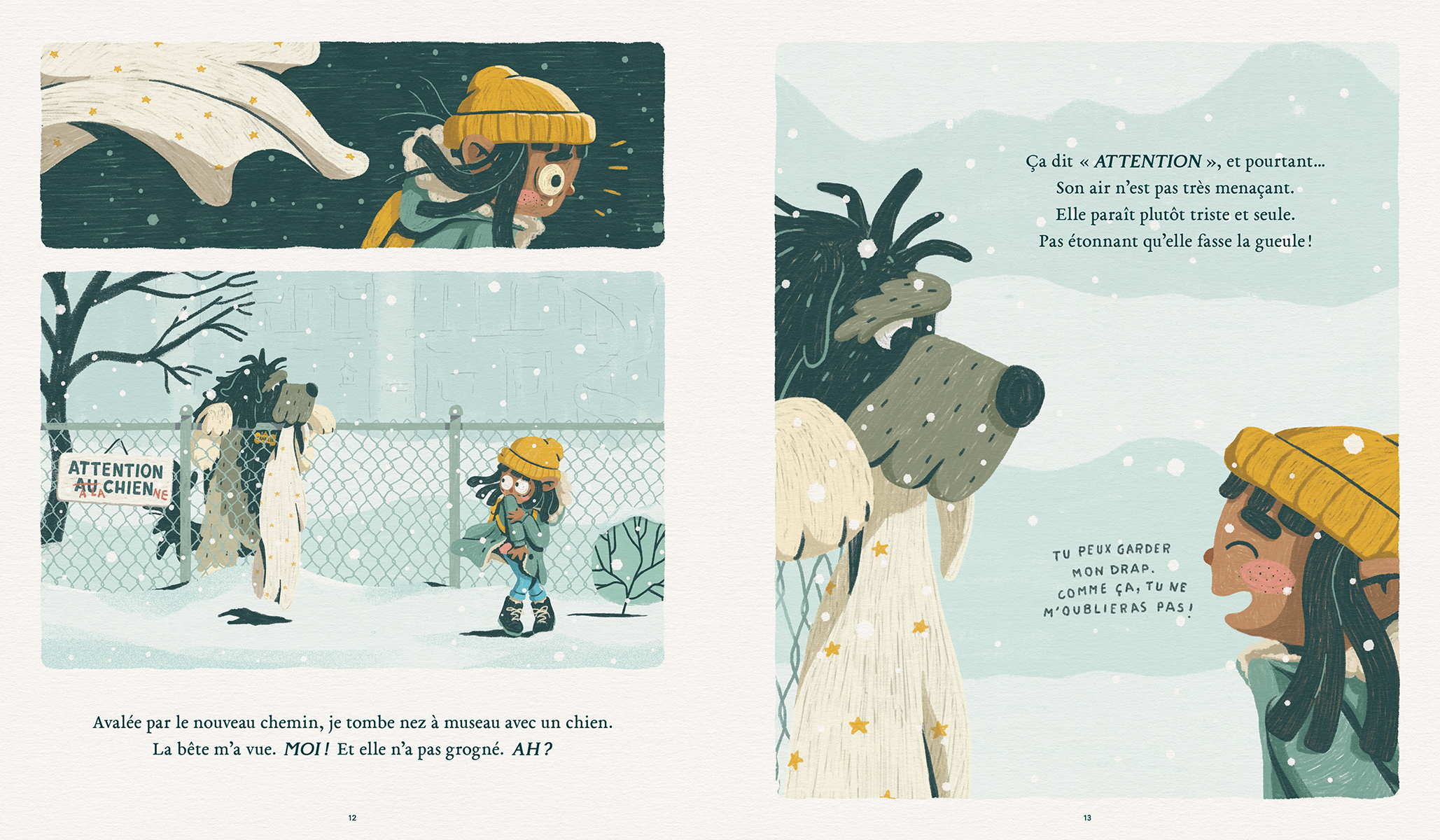 Blanche se sent invisible. Surtout à la maison, où ses parents sont distraits par les factures et les écrans. En route vers l’école un matin, elle emprunte un raccourci pour chasser l’ennui et elle fait la rencontre d’un chien esseulé qui semble la voir telle qu’elle est. Cette nouvelle amitié encourage enfin Blanche à prendre confiance en elle et à mettre cartes sur table avec ses parents. Une histoire en poésie qui permet de parler de négligence et de qualité de présence.