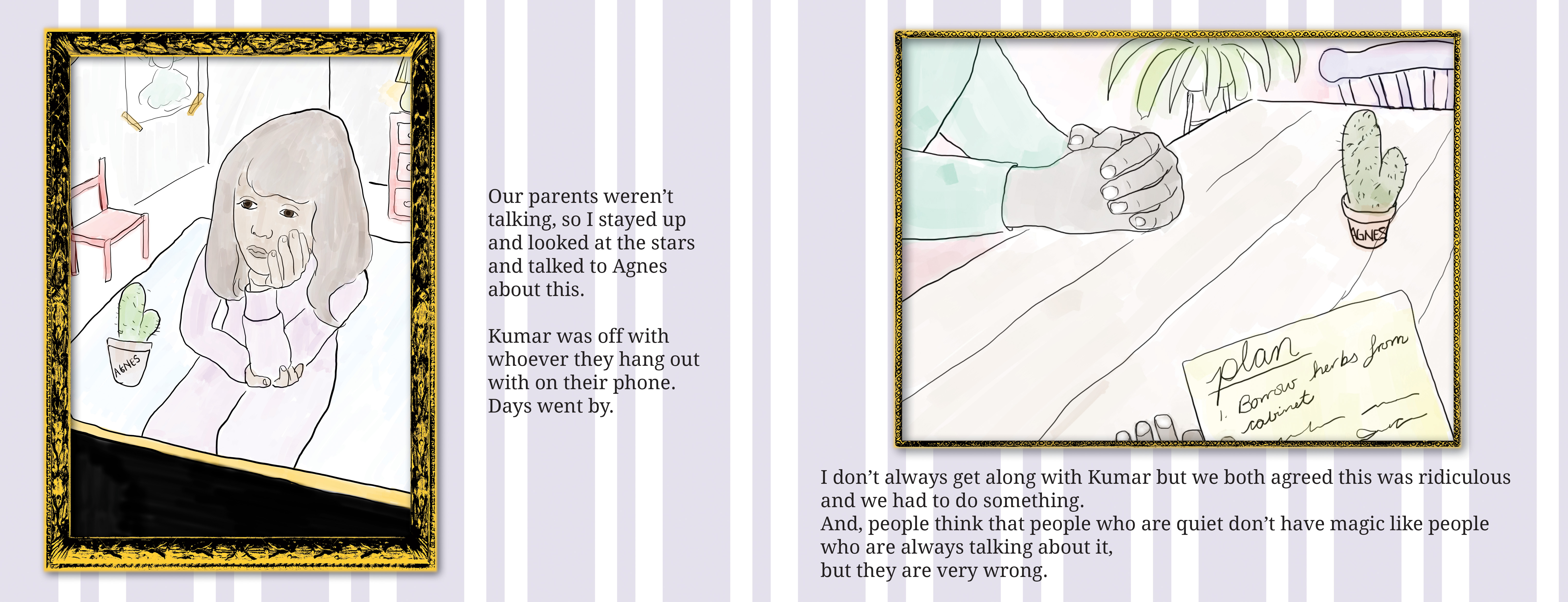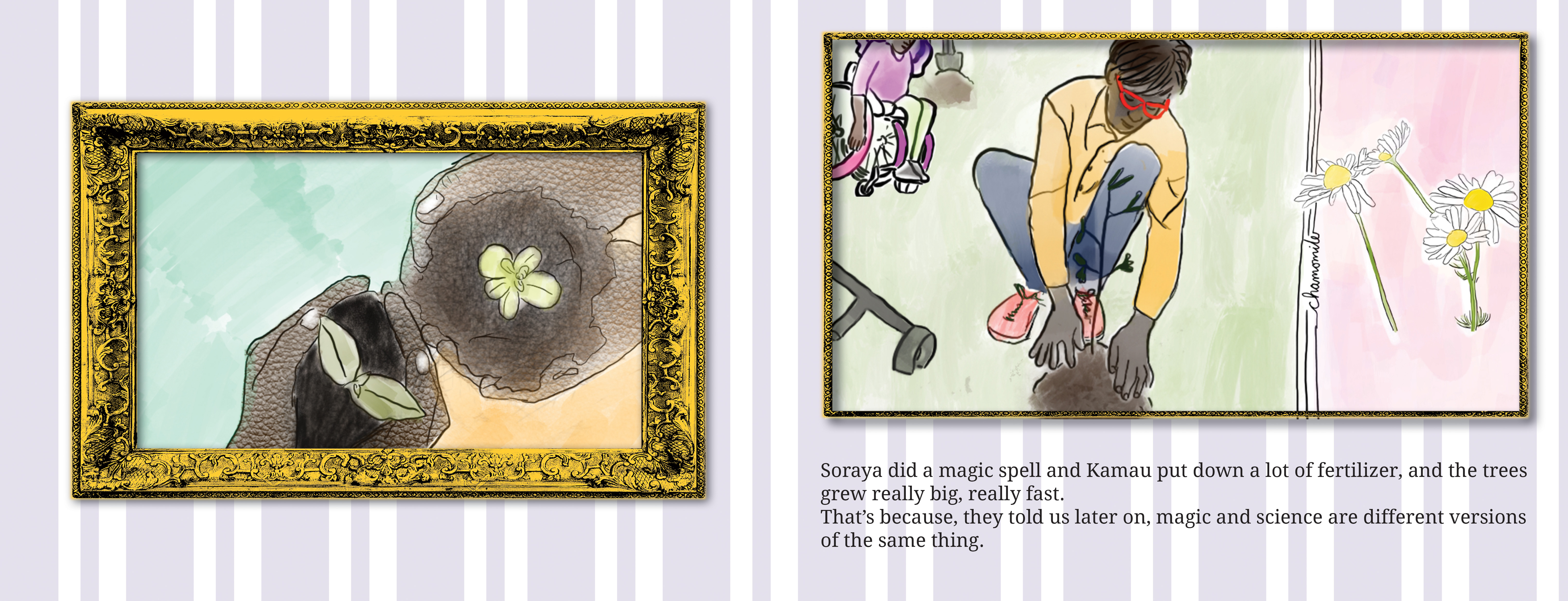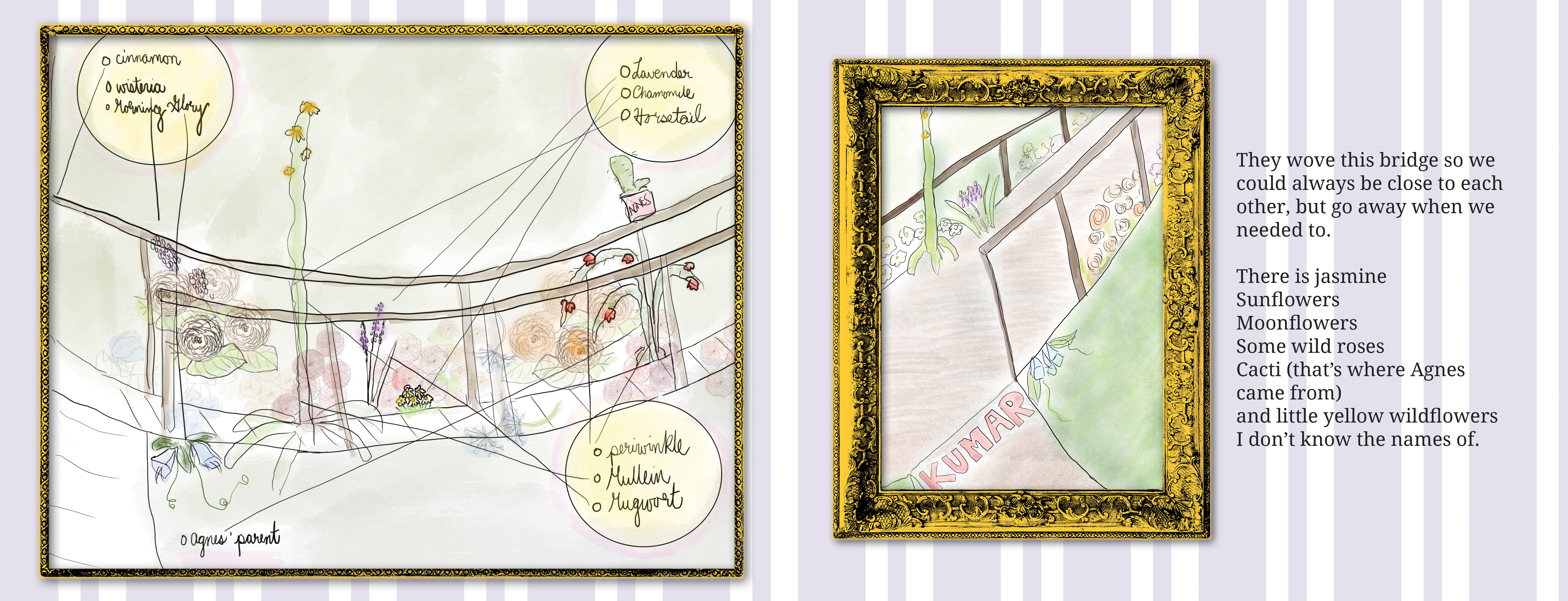 There are many ways for a family to be: spread out, packed together, close, far or always moving. This family lives in two houses connected by a bridge of flowers. When the bridge falls apart one stressful day, Mona and her sibling Kumar make magic to restore it—with a surprising result! It’s a good thing that everyone had a little magic inside, especially when they’re trying to care for the people they love.