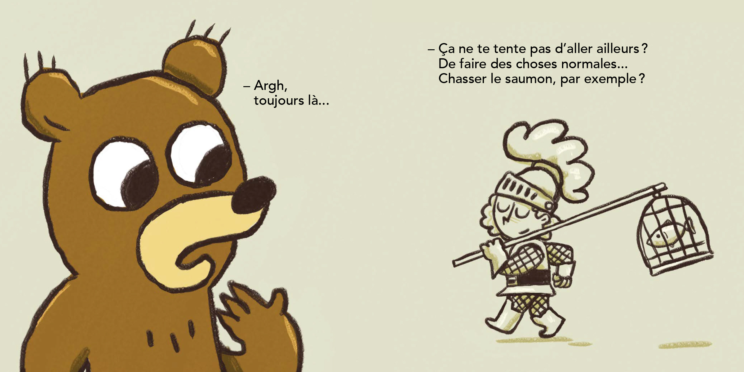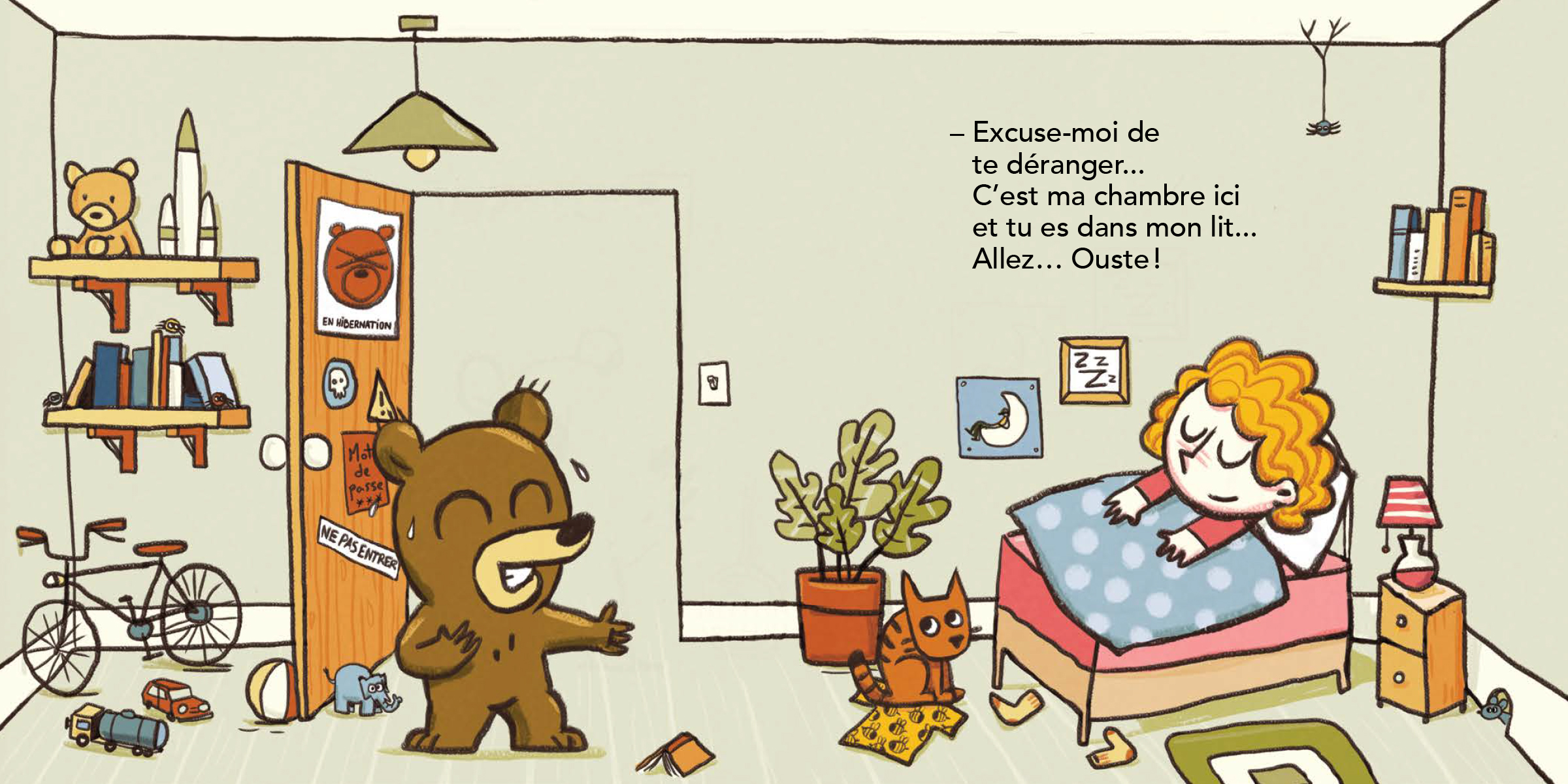 Épuisé par sa balade du jour, ourson file dans sa chambre pour faire la sieste… ou du moins il le souhaite. Malheureusement, son lit est déjà occupé par une inconnue aux cheveux bouclés couleur de miel. Une fois la surprise passée, ourson aimerait bien déloger l’intrus qui dort paisiblement un léger sourire aux lèvres. Notre jeune ami se met alors en action et ne ménage ni ses efforts, ni son imagination et met tout en oeuvre pour réveiller la jeune fille. Parviendra-t-il à la réveiller et à retrouver son lit… rien n’est moins sûr!
