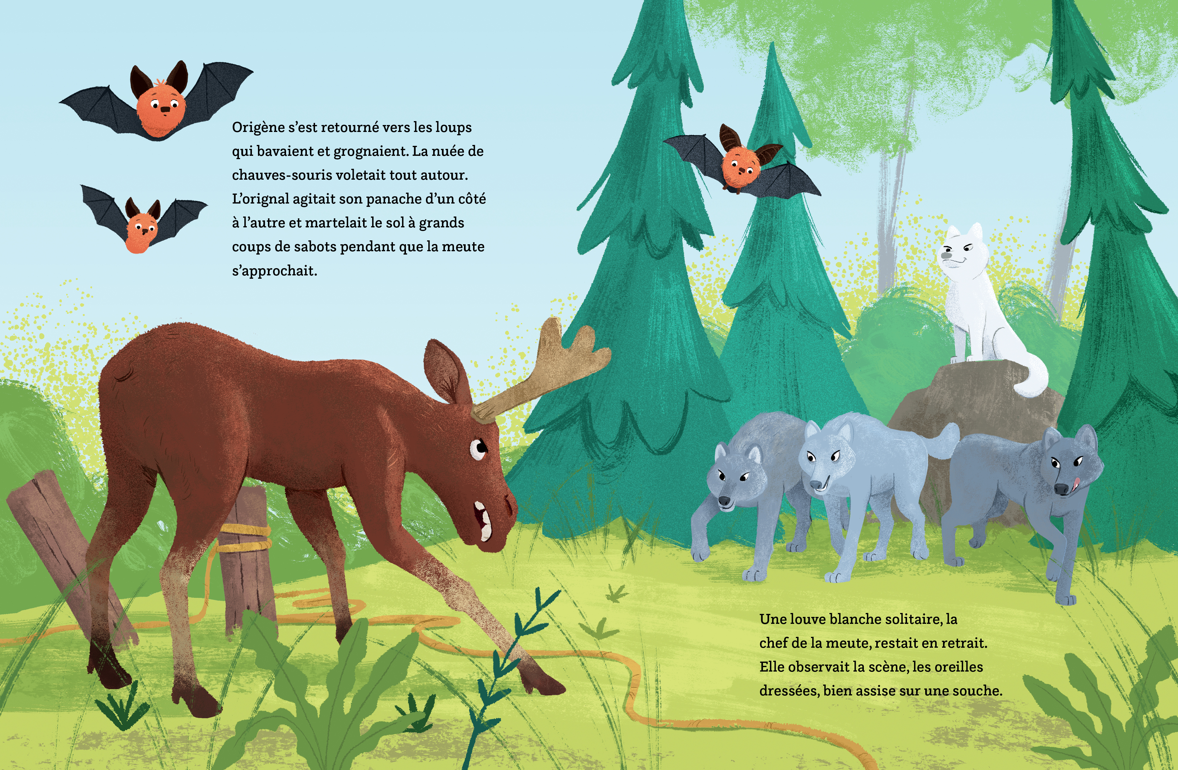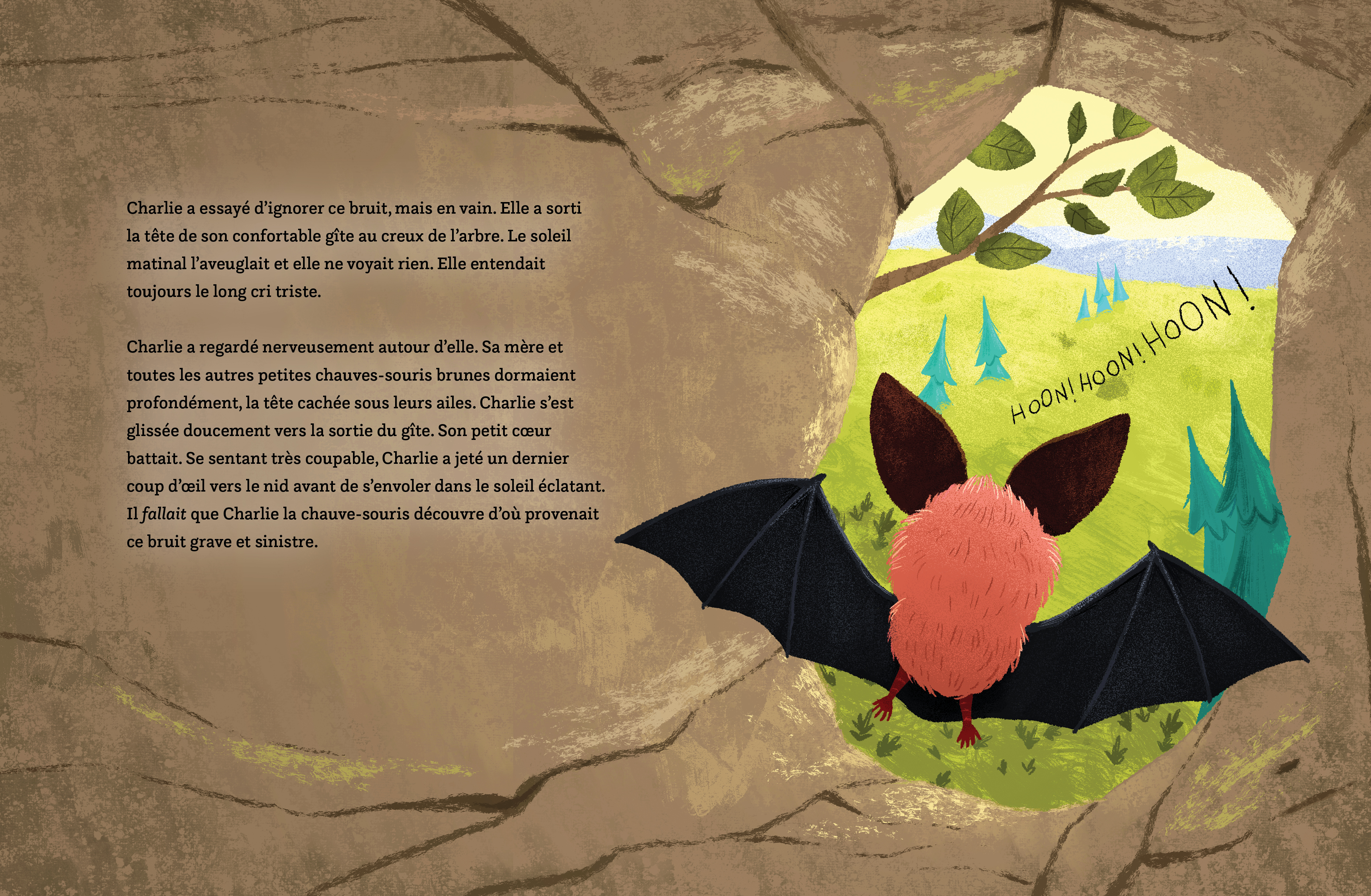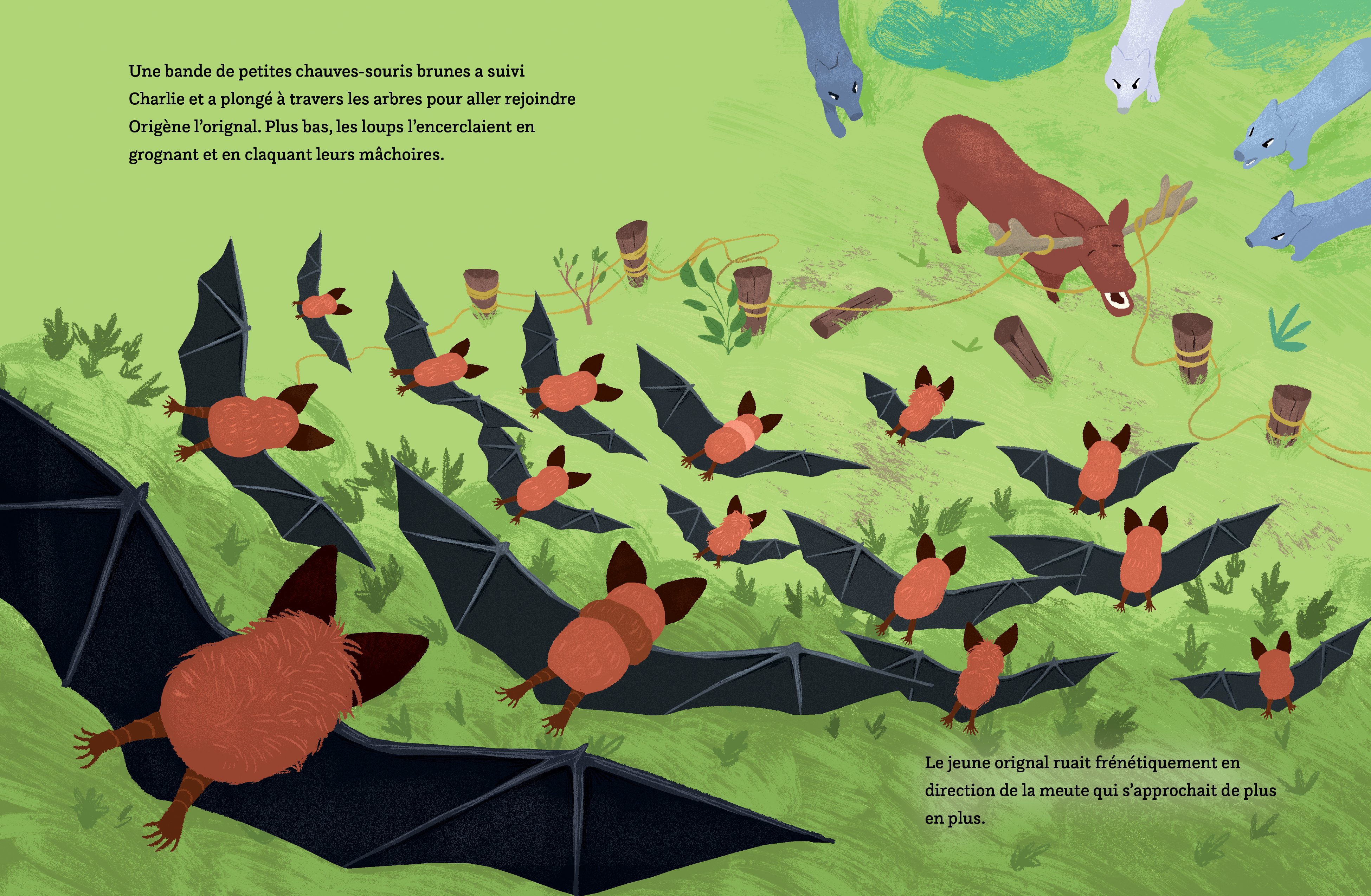 Elle entend un cri plaintif provenant de la forêt et, désobéissant à sa maman, elle se glisse à l’extérieur de l’arbre creux et s’envole pour en trouver la provenance. Charlie découvre un jeune orignal empêtré dans un câble attaché à une vieille clôture. D’un côté rôdent des chasseurs et de l’autre, une meute de loups. Tous cherchent une proie à manger. Est-ce qu’une toute petite chauve-souris brune parviendra à sauver un gros orignal mal pris?