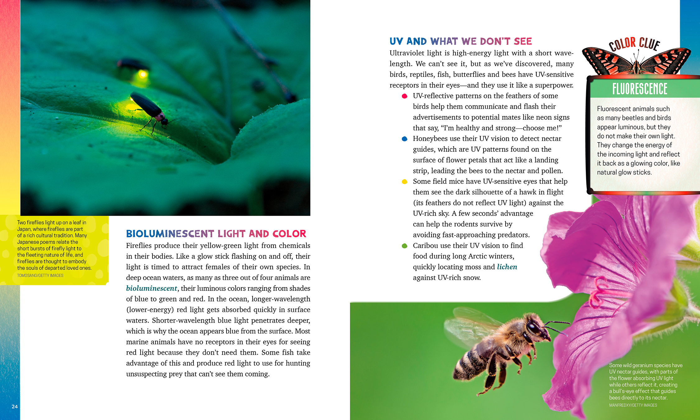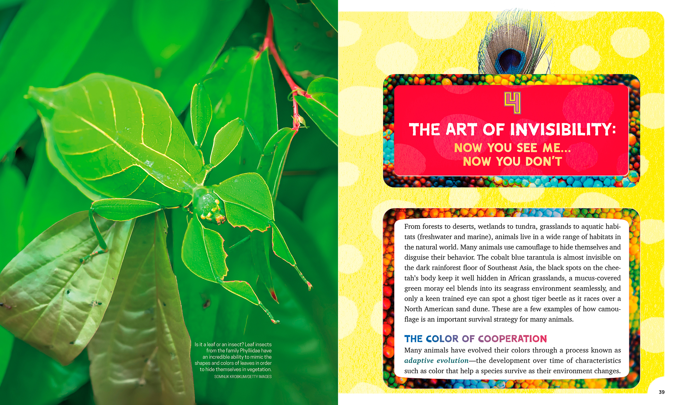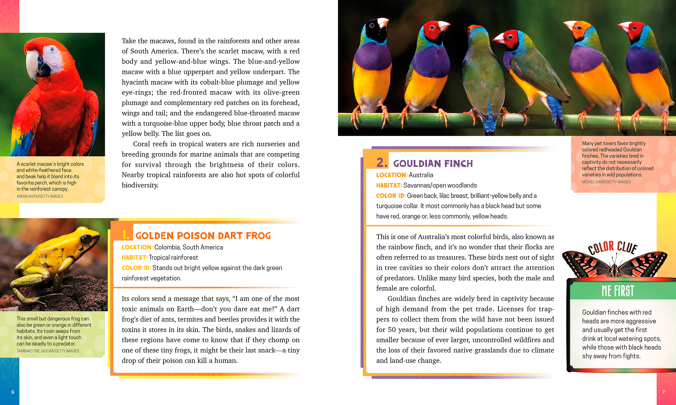 Golden finches, bright blue mandarin fish and orange poison dart frogs use their colors to get noticed. Arctic foxes and octopuses change their colors to blend into their habitats. Birds, mammals, frogs, fish, reptiles and insects use a full palette of color to defend themselves, hunt for food, attract mates, hide from predators and often to stand out from their rivals.