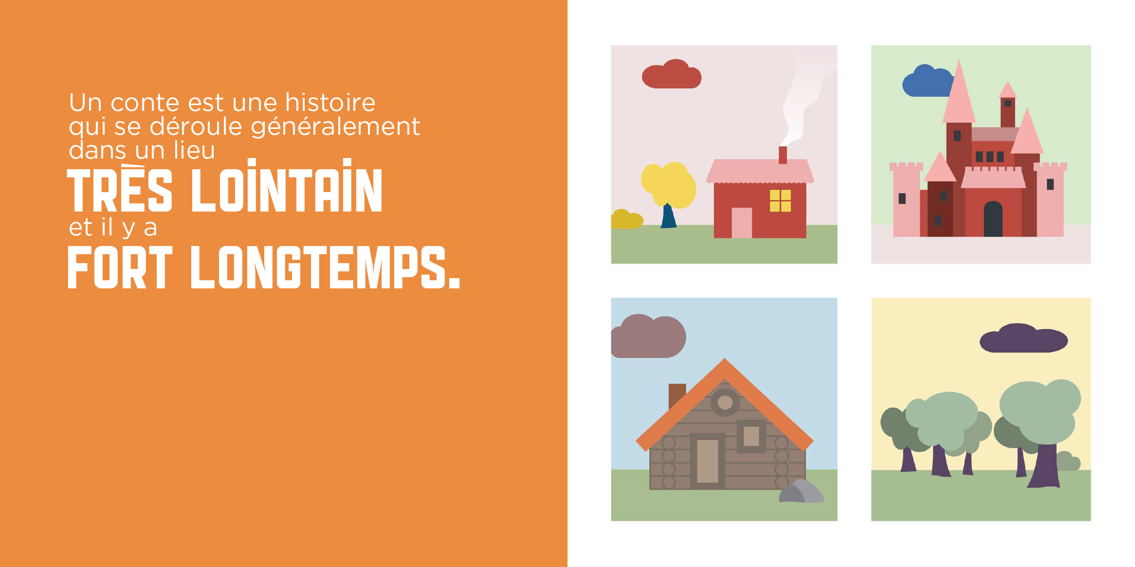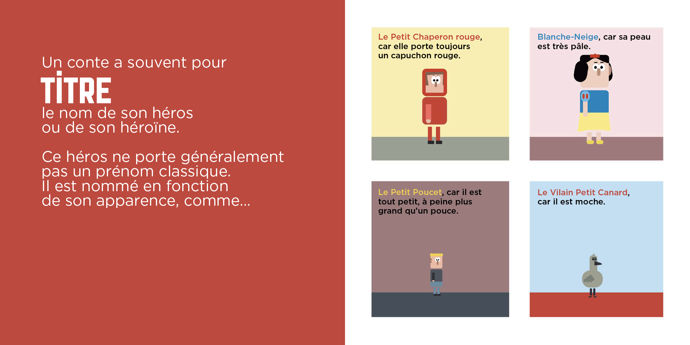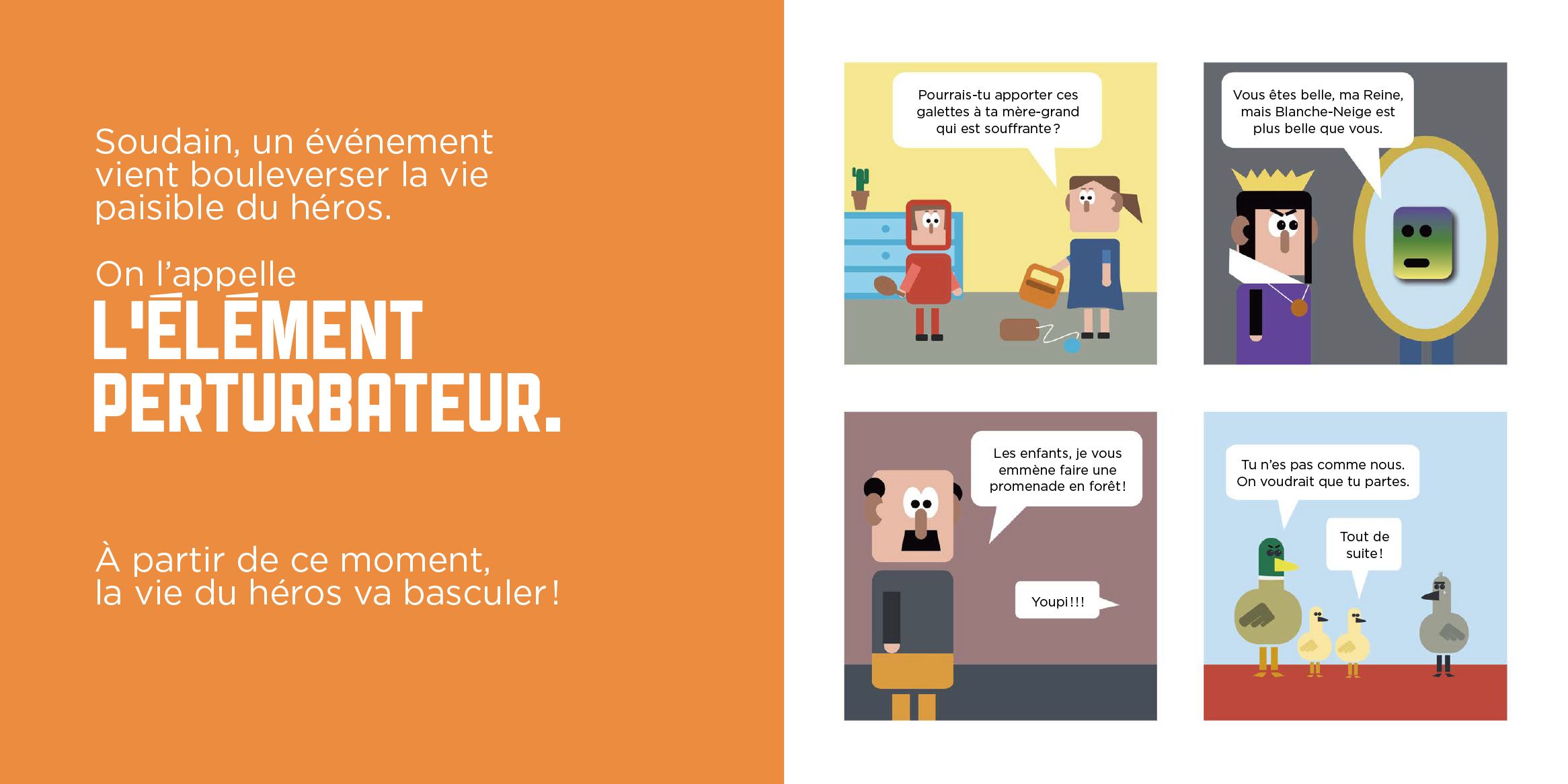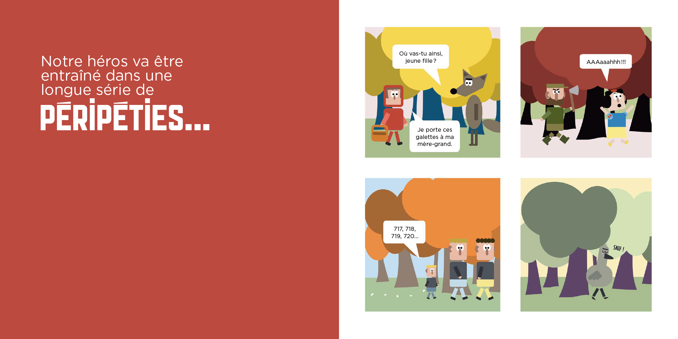 Chaque notion est accompagnée de quatre cases illustrées à la manière d’une bande dessinée. Ces quatre cases mettent chacune en scène un conte : Le Petit Chaperon rouge, Le Petit Poucet, Le Vilain petit canard et Blanche-Neige. Ainsi, les notions s’enchainent au fil des pages, alors que le récit des quatre histoires avance. À cette structure ingénieuse s’ajoute le ton quelque peu grinçant choisi par Olivier Dupin qui propulse les quatre contes dans la modernité.