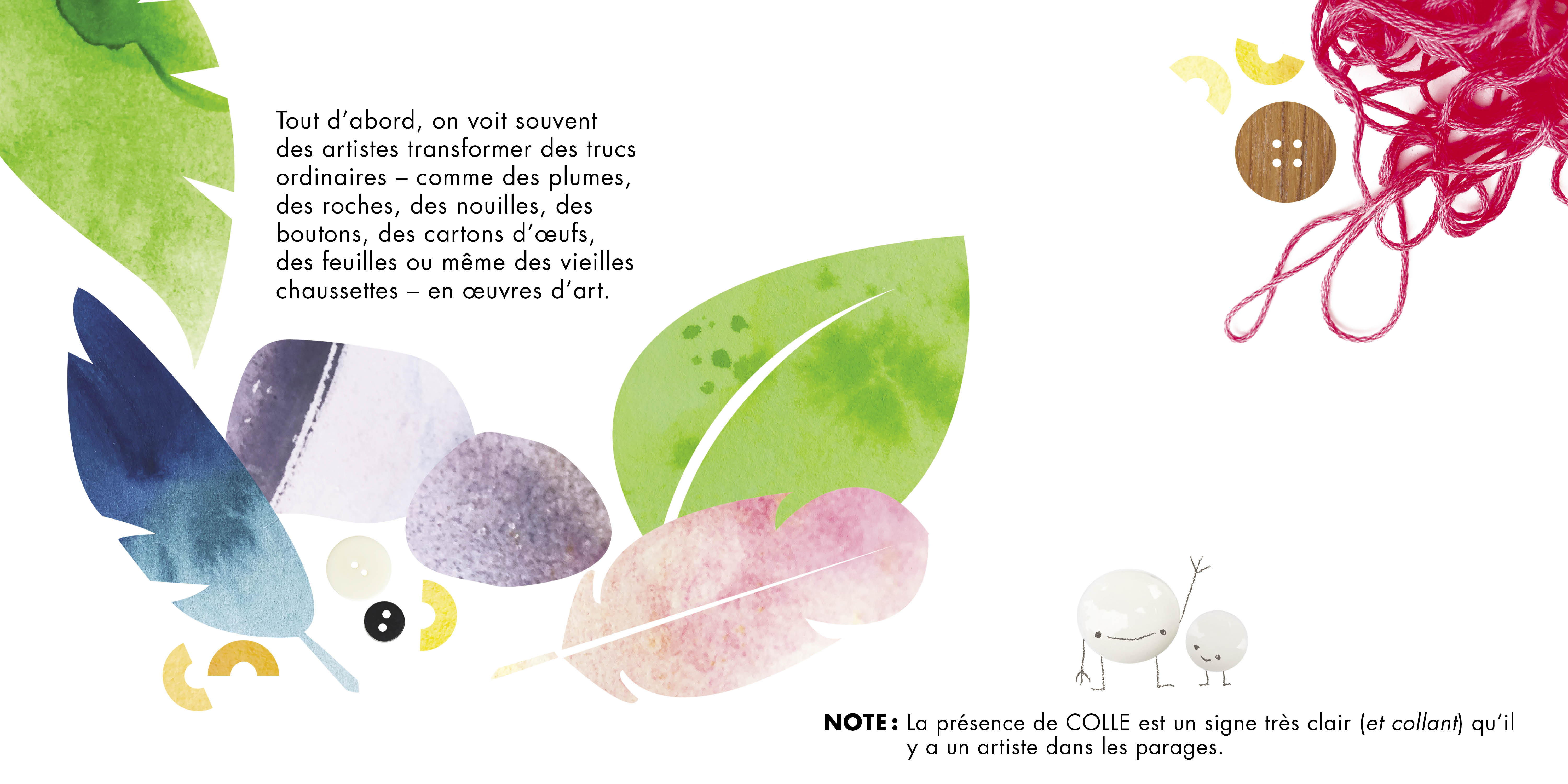C’est un livre très pratique pour savoir reconnaître un artiste. Tous les artistes sont différents, tout le monde peut-être un artiste, tout matériel peut être utilisé et chaque artiste a son style et sa manière. Bref, il y a des artistes partout. Mais attention à la brute des arts, celle qui demande “À quoi bon?” ou qui dit “Ce n’est pas parfait. Abandonne.