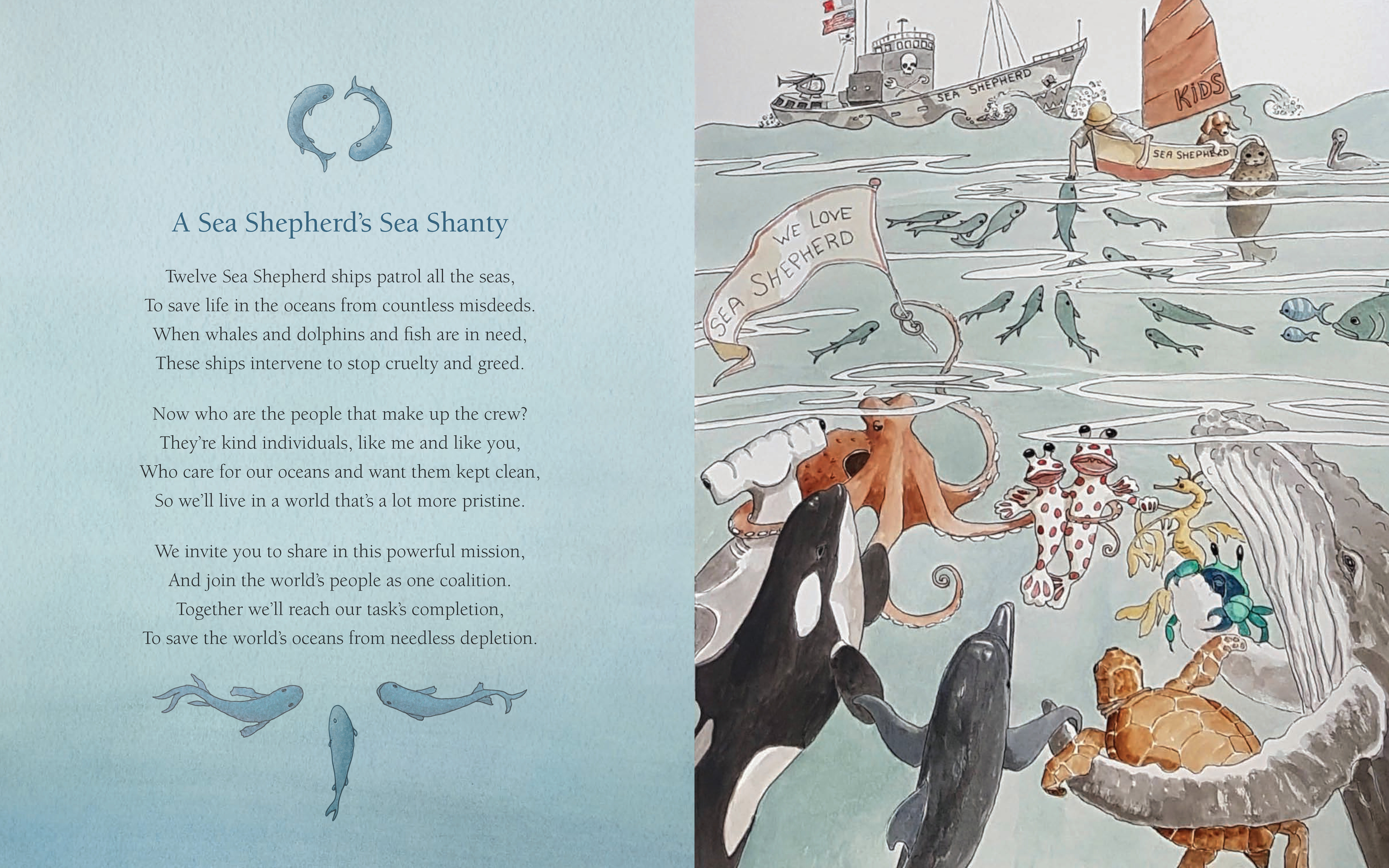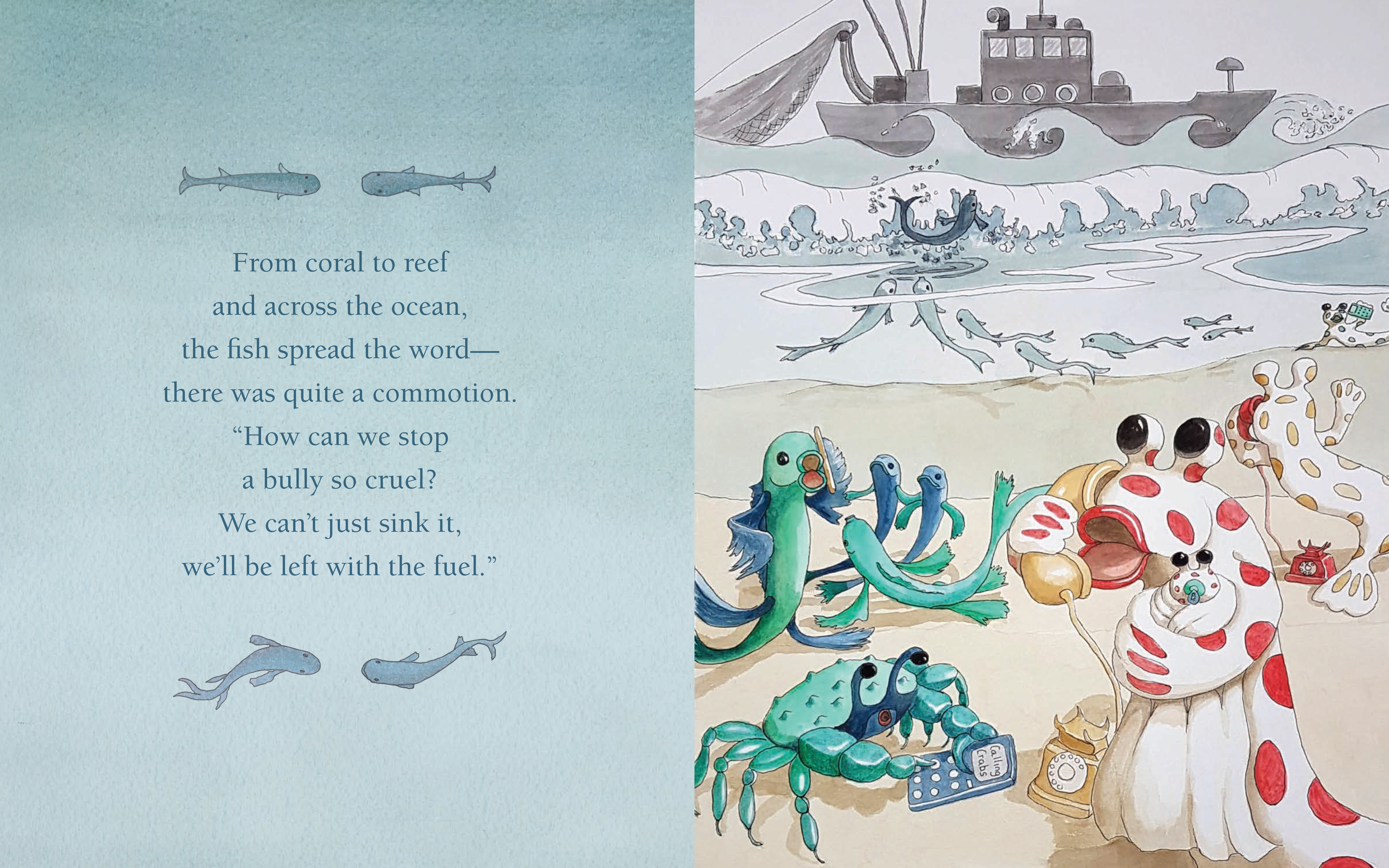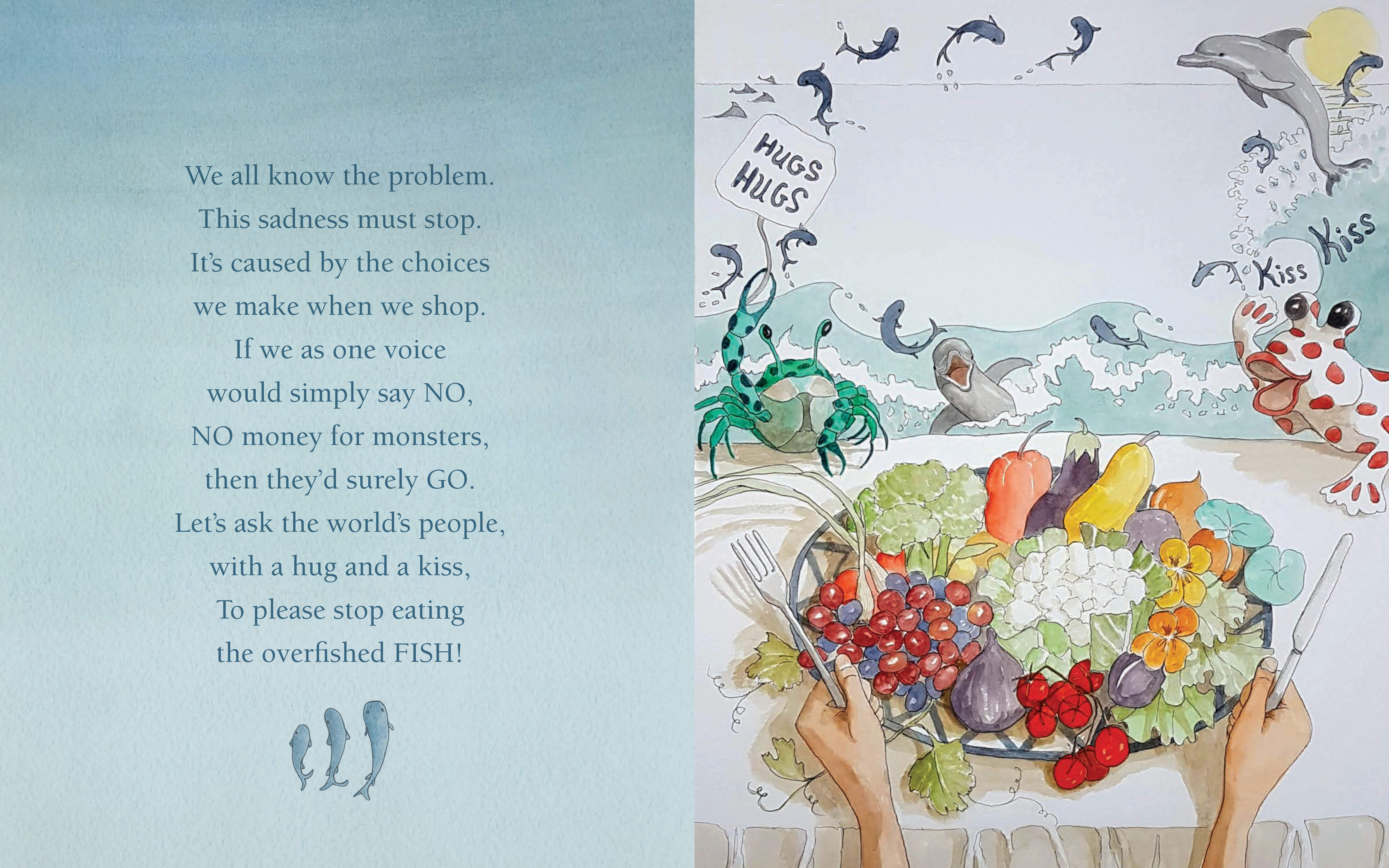 A story in poetic verse with whimsical illustrations of friendly sea characters captivates young kids as they learn about the problem of overfishing our ocean. With the word spreading from coral reefs to across the ocean, a meeting is called to hatch a plan of defense against fishing trawlers (aka “the monsters”). Brightly colored crabs and lobsters, sea snails, polka-dotted fish, and whales and dolphins rally together and appeal—with a hug and a kiss—to humans to hear their plea and make the right choices when they shop. A sweet Sea Shepherd shanty informs youngsters about crews sailing the seas to protect whales, dolphins, and fish in need. It invites us all to join these kind individuals and help keep our oceans clean and full of fish. A foreword by Captain Paul Watson (founder of Sea Shepherd Conservation Society) reminds adults of the importance of the ocean’s ecosystems in supporting life on Earth.
