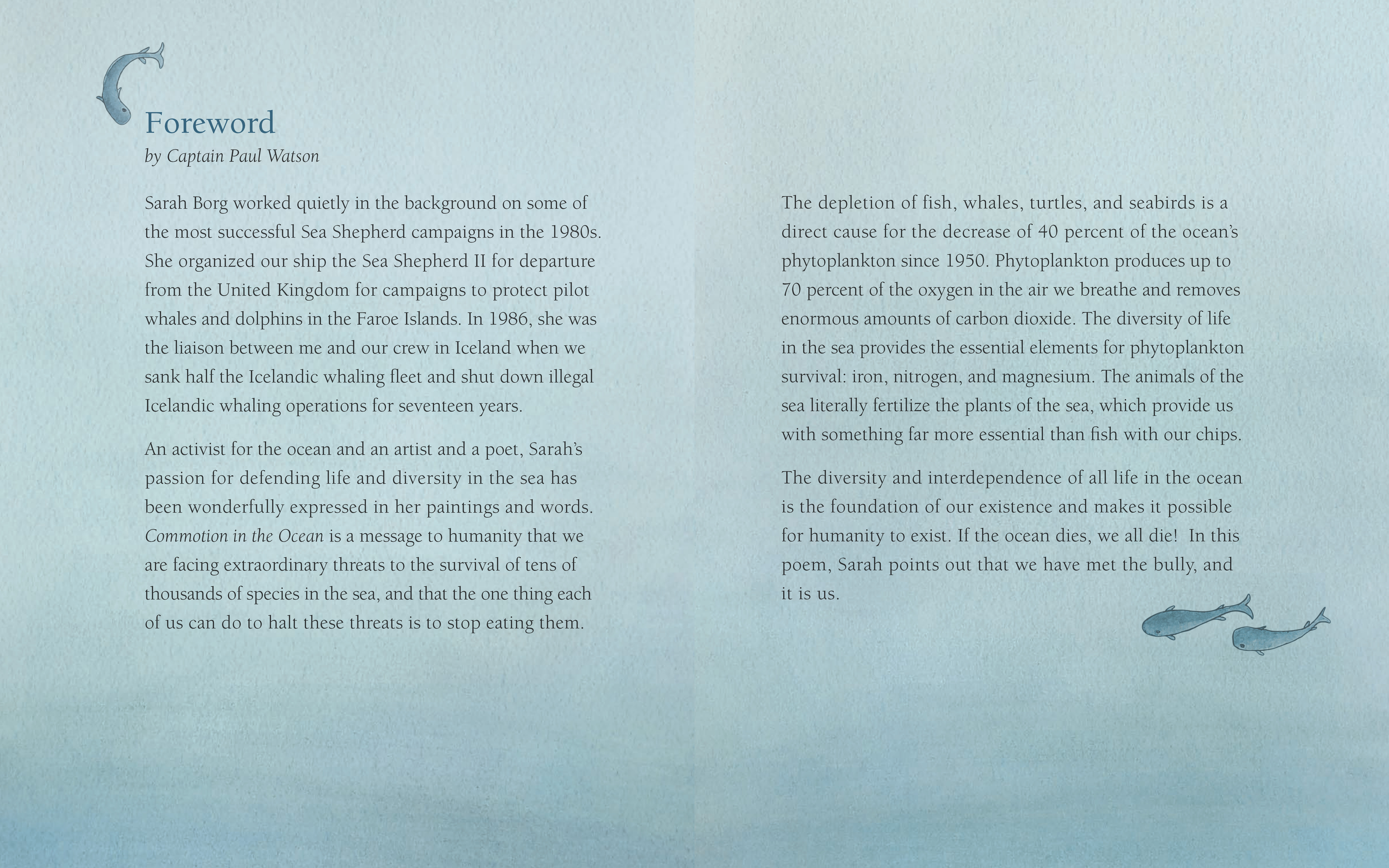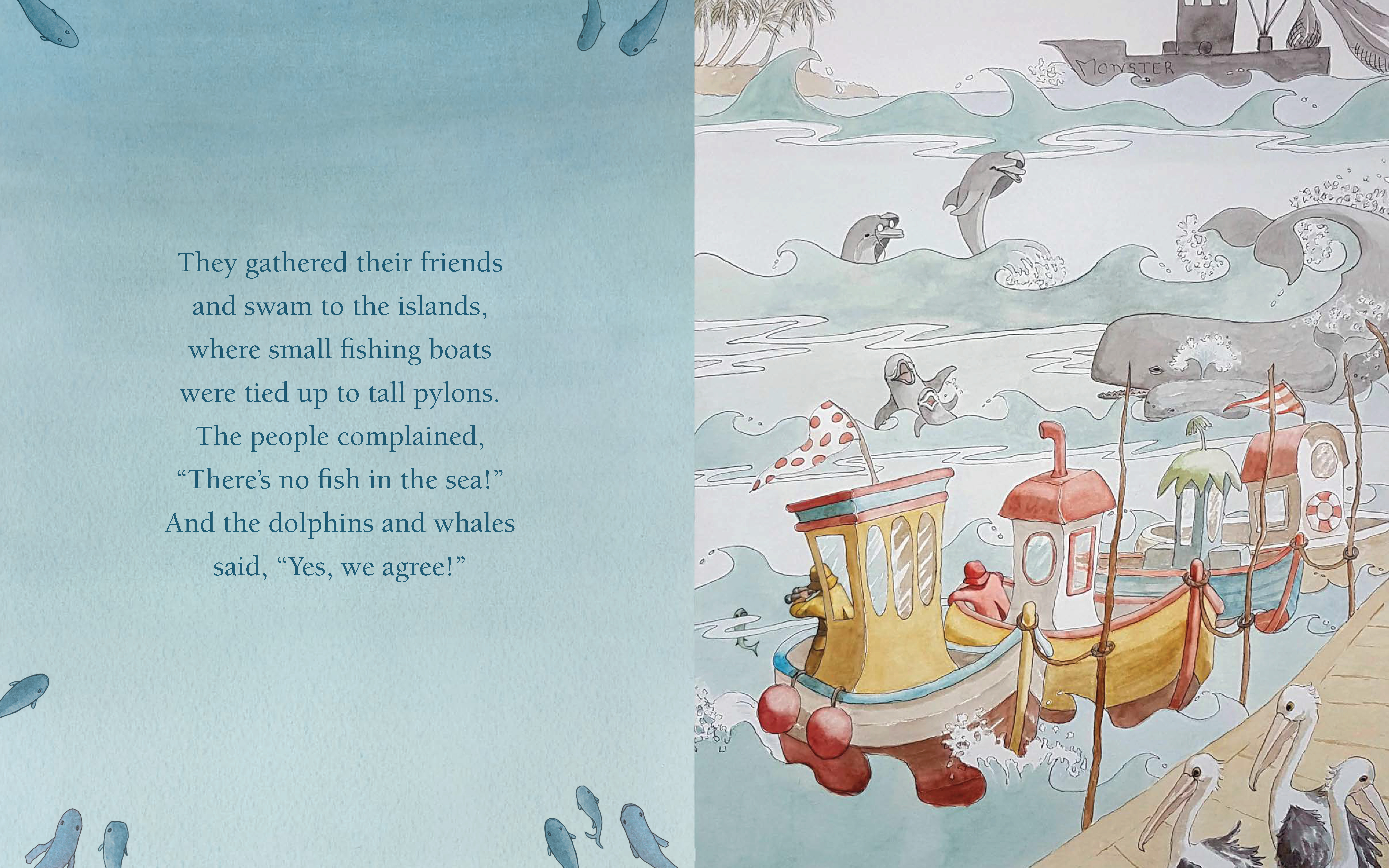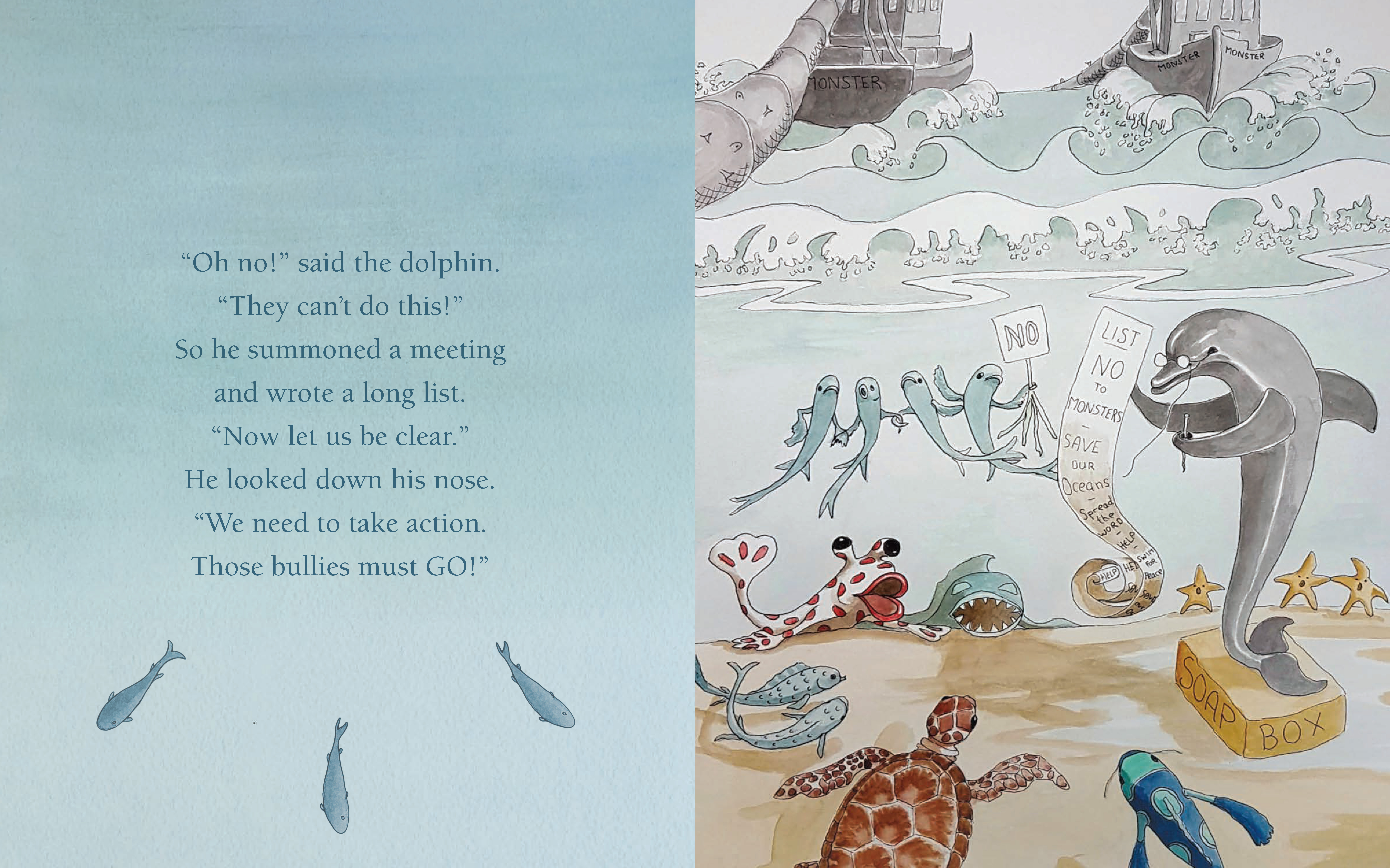 A story in poetic verse with whimsical illustrations of friendly sea characters captivates young kids as they learn about the problem of overfishing our ocean. With the word spreading from coral reefs to across the ocean, a meeting is called to hatch a plan of defense against fishing trawlers (aka “the monsters”). Brightly colored crabs and lobsters, sea snails, polka-dotted fish, and whales and dolphins rally together and appeal—with a hug and a kiss—to humans to hear their plea and make the right choices when they shop. A sweet Sea Shepherd shanty informs youngsters about crews sailing the seas to protect whales, dolphins, and fish in need. It invites us all to join these kind individuals and help keep our oceans clean and full of fish. A foreword by Captain Paul Watson (founder of Sea Shepherd Conservation Society) reminds adults of the importance of the ocean’s ecosystems in supporting life on Earth.