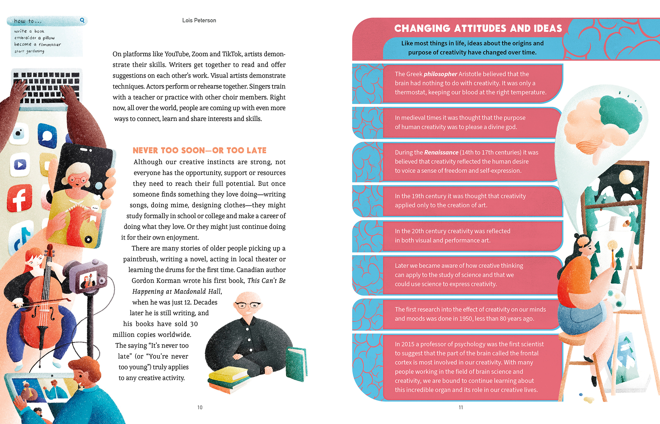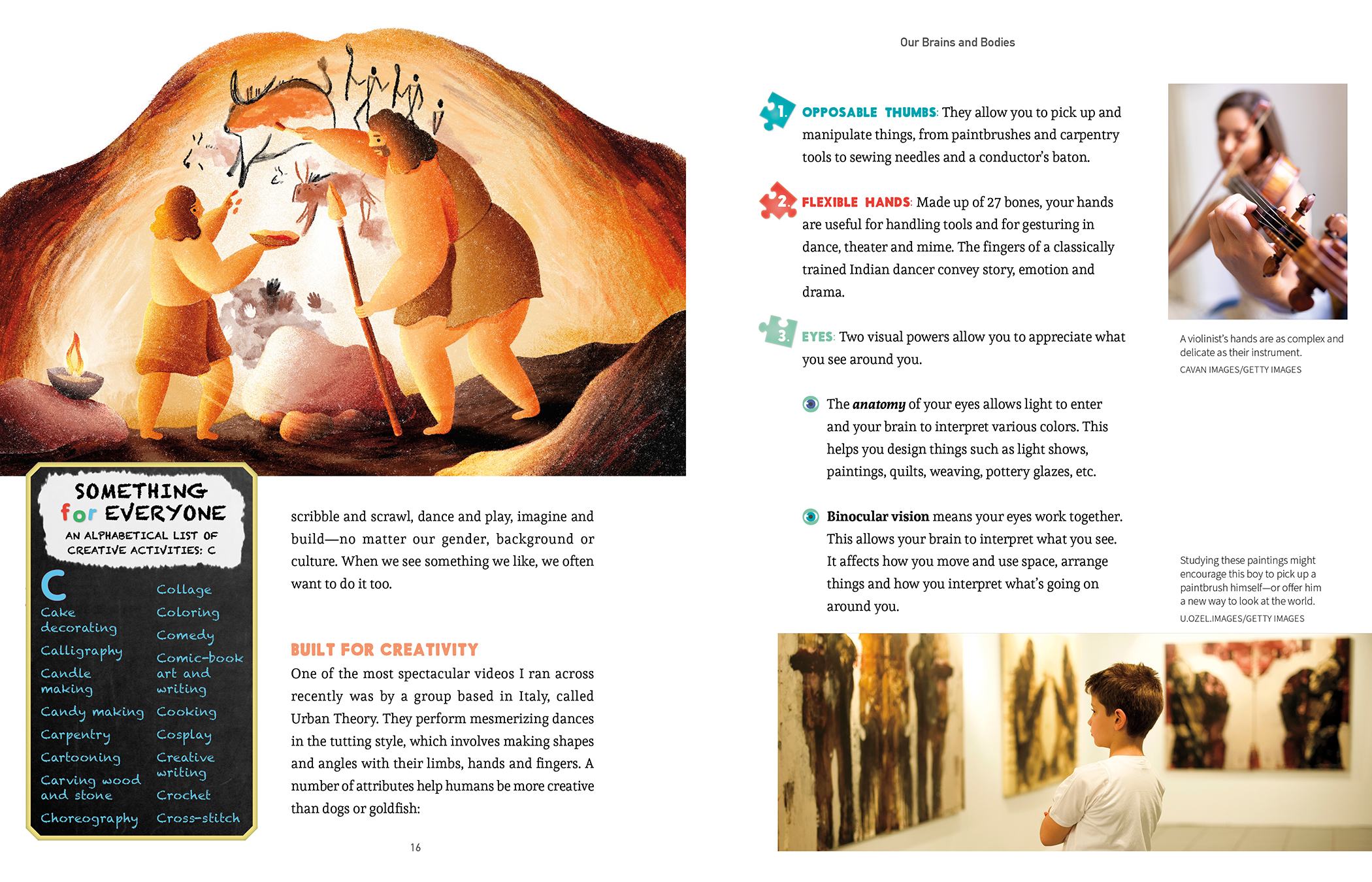 Our brains and bodies are built to make and innovate, and that instinct is as old as humanity itself. Starting when we’re babies, we draw, tell stories, invent, dance, perform, make music, among dozens of other creative acts. Did you know that our ancestors were weaving 12,000 years ago and using pigment to make paintings 17,000 years ago? Today, creativity is all around us, in public and private spaces and places all over the world. From graffiti and flash mobs to music class and TV screens, Creatively Human encourages young readers to look at the world with a creative eye. Explore the origins and impact of ideas and inventions, arts and technology, and learn about the developments and advances that change and improve the lives of everyone. It’s time to recognize and celebrate how everyone—including you—contributes to our world in so many creative ways!