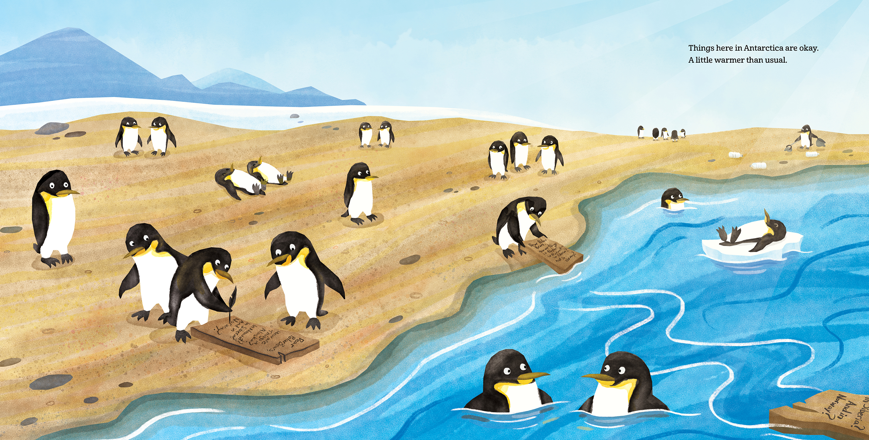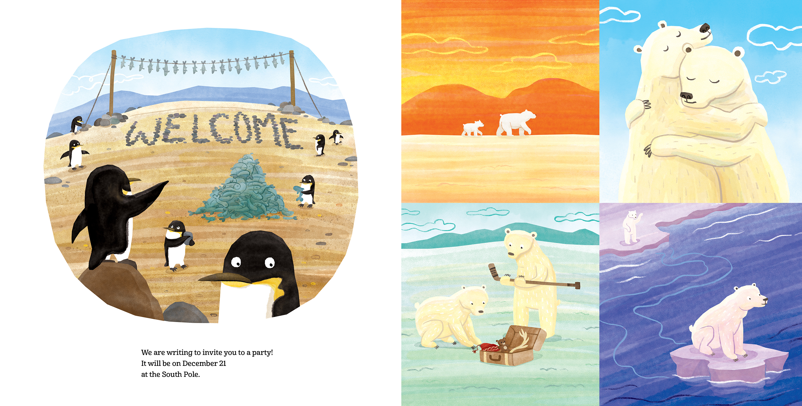 The penguins of Antarctica write a letter inviting the polar bears of the Arctic to join them at the South Pole to celebrate their longest day of the year. But how will the polar bears get there? It's such a long journey—will they make it in time? What will they bring? And what will happen when they arrive?