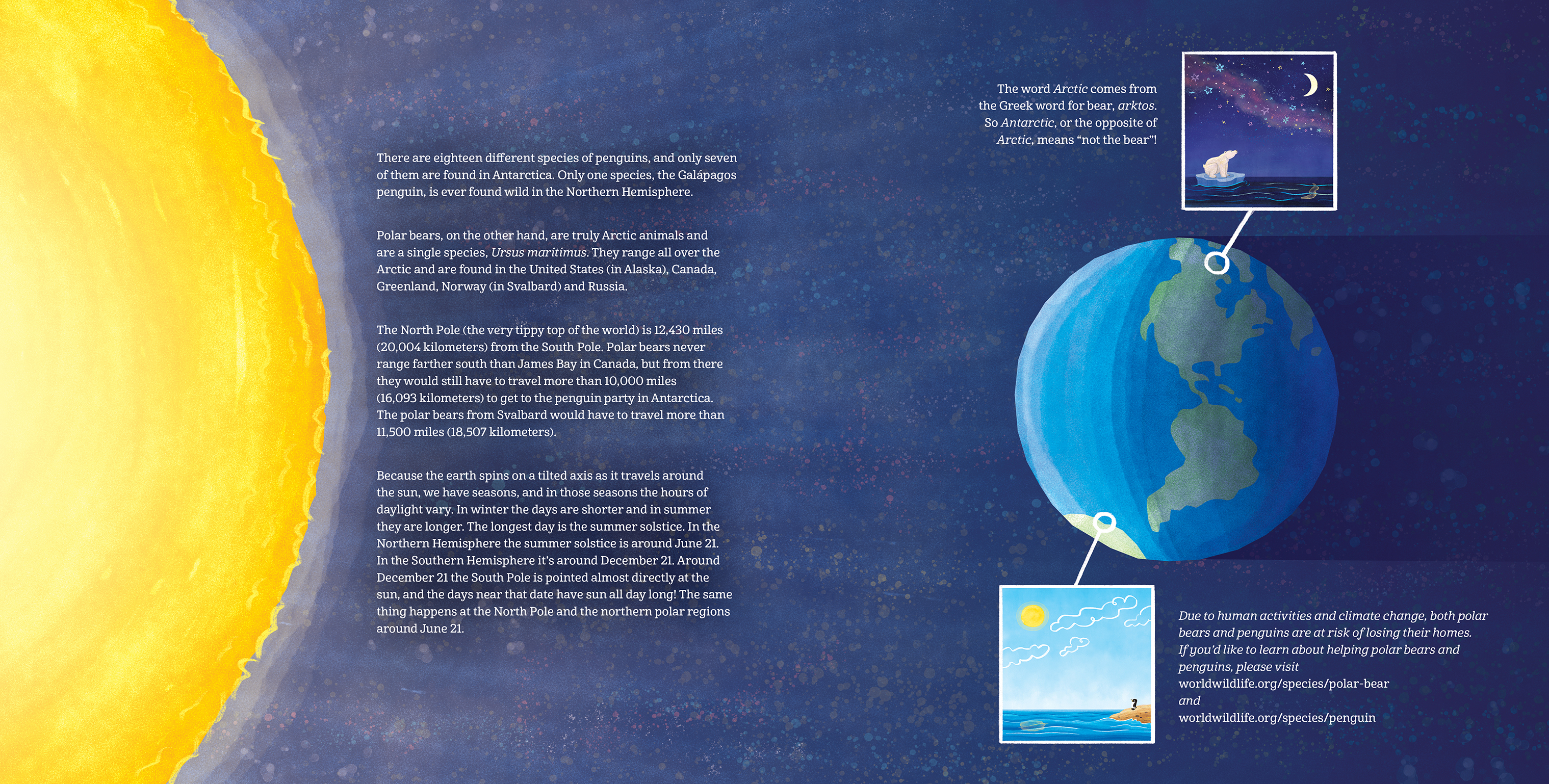 Dear Polar Bears combines a playful story of friendship with humorous imagery depicting the differences between Earth's polar regions. With fun facts about penguin and polar bear species, the distance between the poles, and the summer solstice, this will be the most exciting party thrown by penguins you've ever attended.