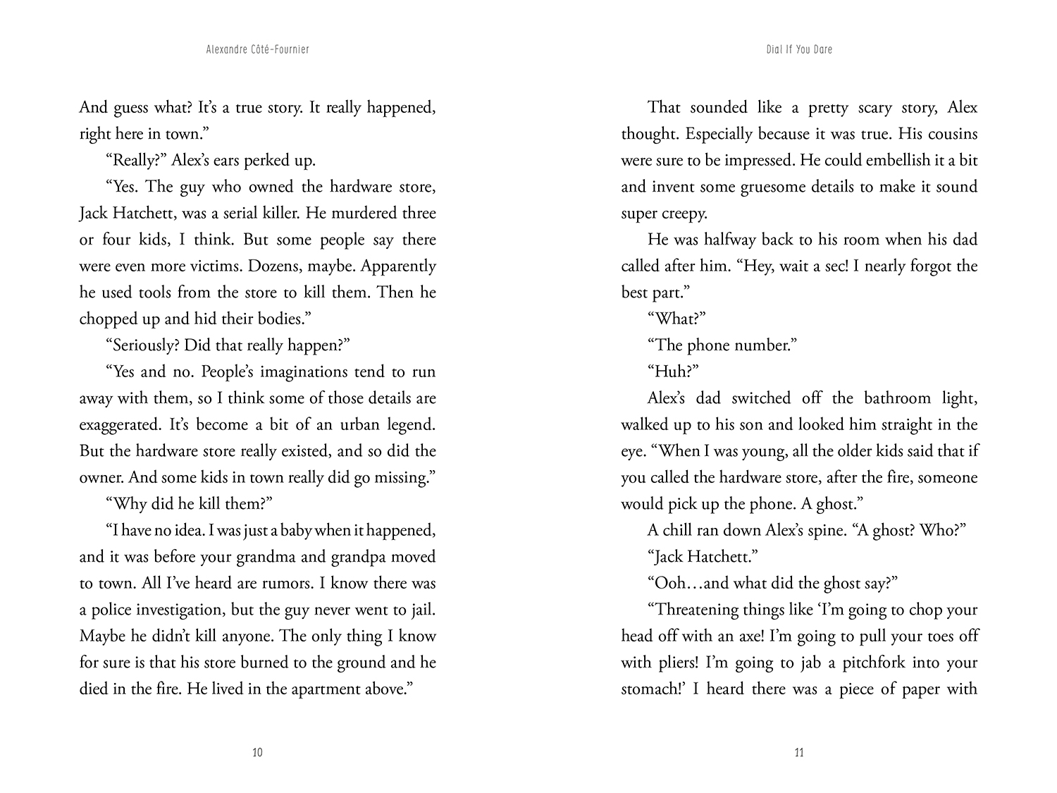 It's Halloween and Alex is excited to be watching horror movies and telling ghost stories with his cousins. When it's Alex's turn to share, he tells the terrifying tale of Jack Hatchett, local hardware store owner and serial killer. Legend has it that he cut his victims up and hid the pieces so they would never be found. But before the police could prove anything, the hardware store burned to the ground, turning the suspected murderer and his secrets to ashes. Now, if you dial the number for Hatchett’s Hardware, his ghost is said to answer the phone. For Alex, Chloe and Luke, the temptation to call and see if the legend is true proves too hard to resist...