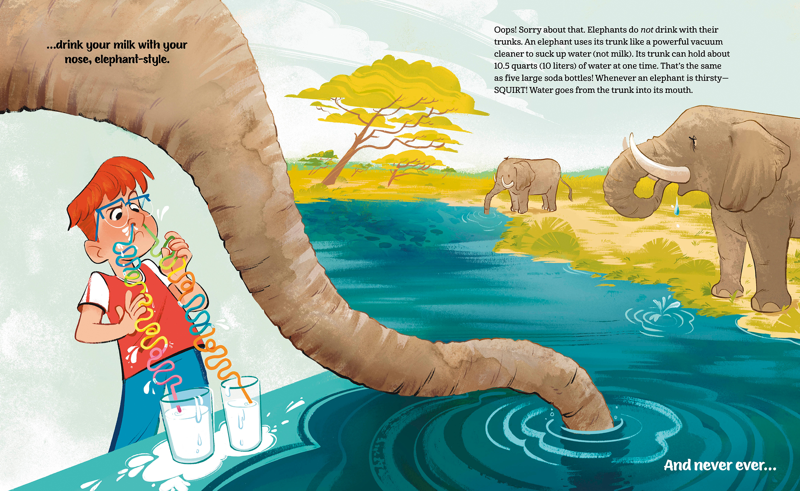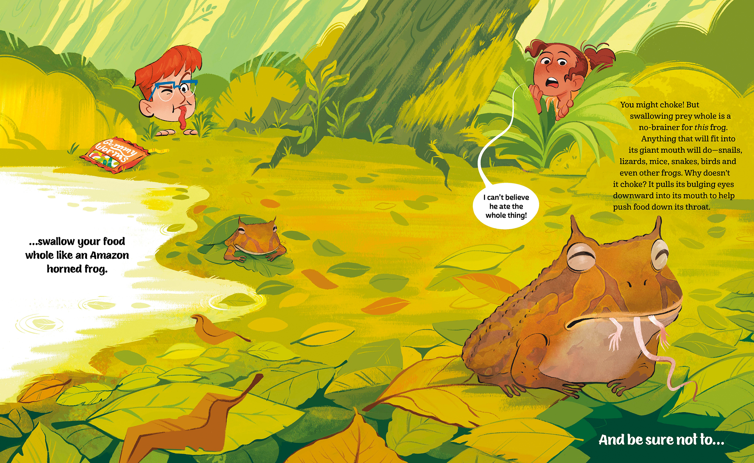 Animals eat and drink in surprising, amazing and downright weird ways. Bearded vultures throw their food. Dogs slurp when they’re thirsty. Amazon horned frogs swallow their meal whole. Cows burp. You should definitely NOT copy their behavior at the dinner table. It wouldn’t be funny at all. In fact it could be disastrous. So mind your manners and find out what you should NOT do when you’re eating or drinking.
