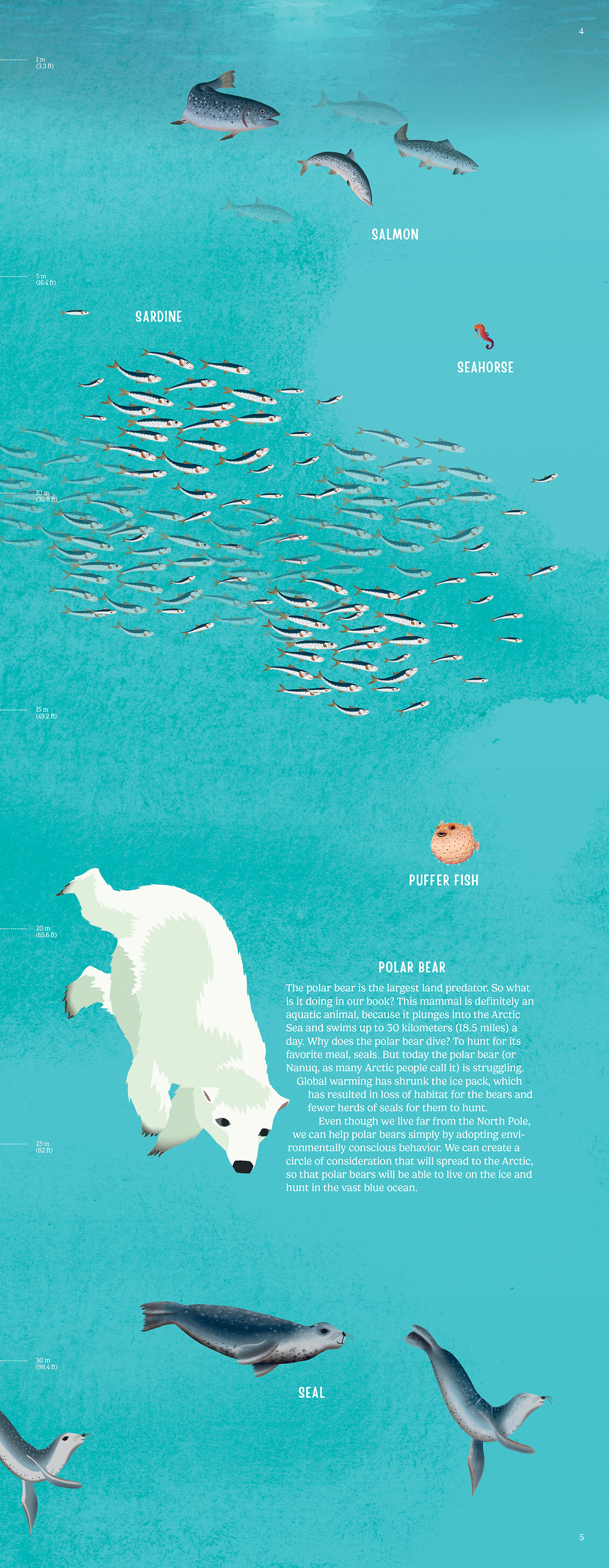 Beginning on the surface, start your ocean descent alongside coral, fish, sea horses and polar bears.