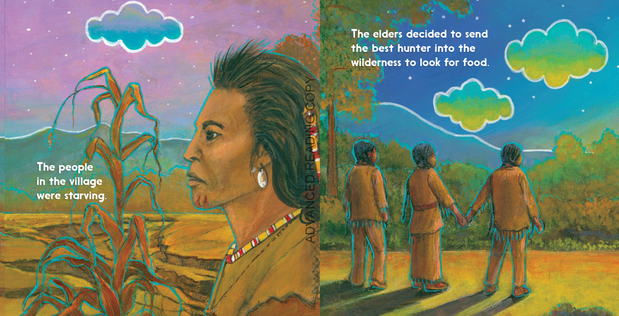 Hearing the warning cries of the eaglets, Father Eagle flew to their rescue. Father Eagle told the hunter that if he did not take the eaglets, he would ask the Great Spirit to help the village. The hunter decided to trust Father Eagle and watched him soar high into the sky. Father Eagle returned and told the hunter that the Great Spirit would help his people and would not let his village perish.