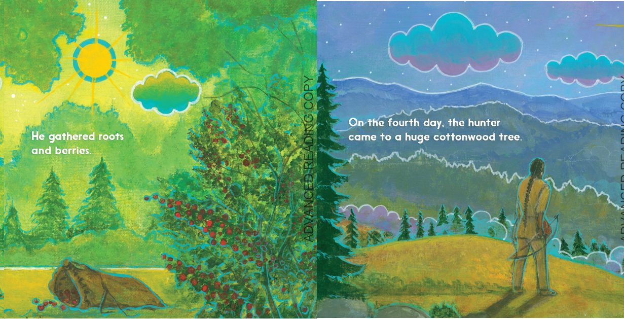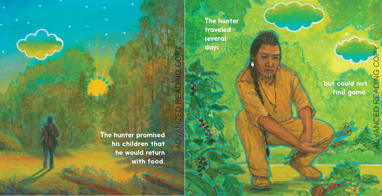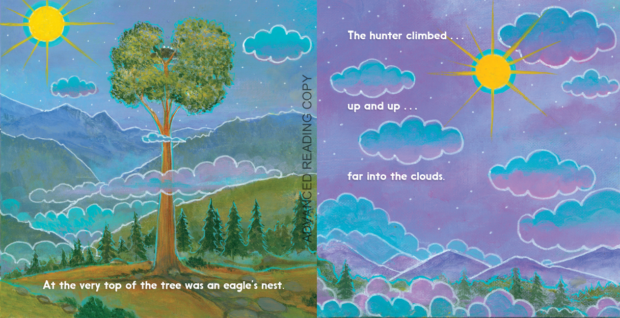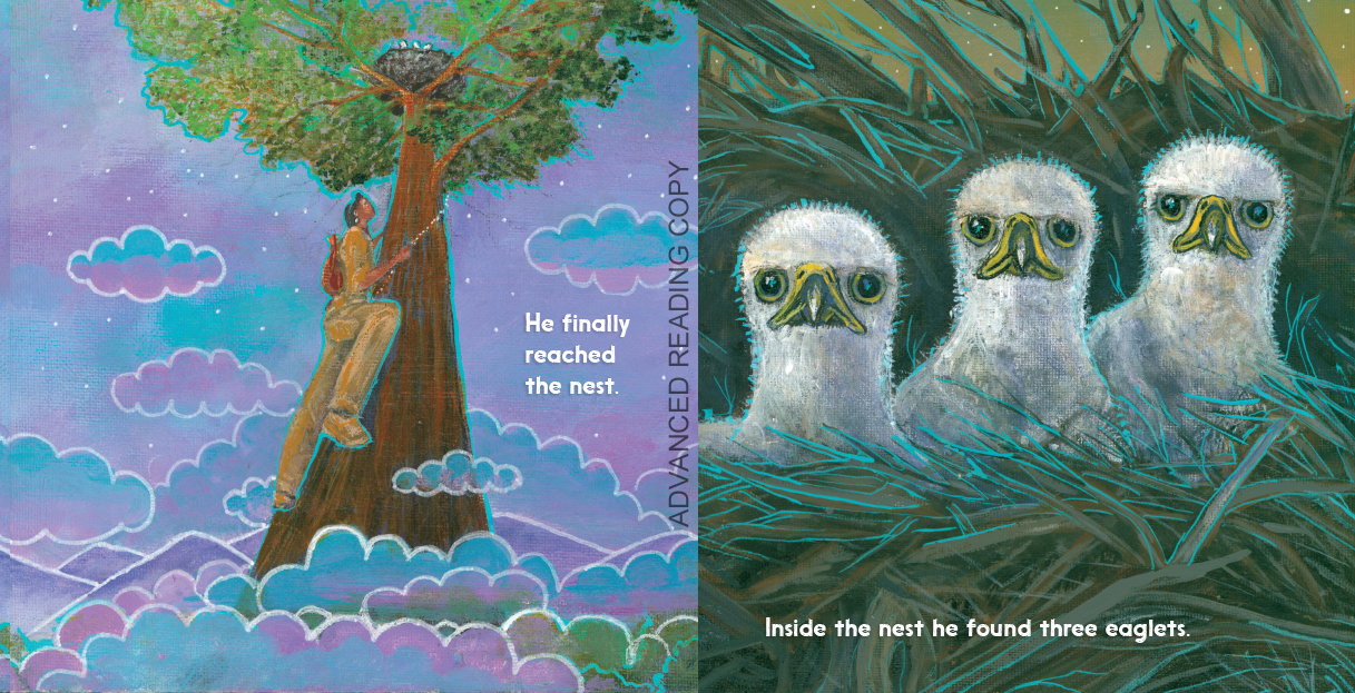 The hunter was tired of only finding berries and seeds to feed his hungry village, so he decided to look far and wide for some meat to bring to them. When he spotted a tall tree, he climbed to the top and discovered a nest with three eaglets. “What a tasty soup the three little birds will make!” thought the hunter.