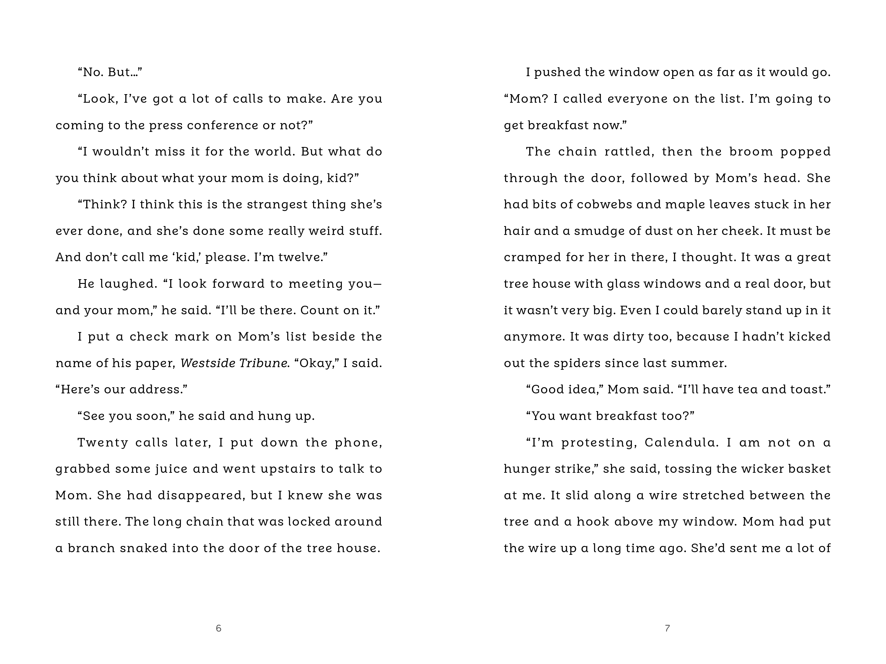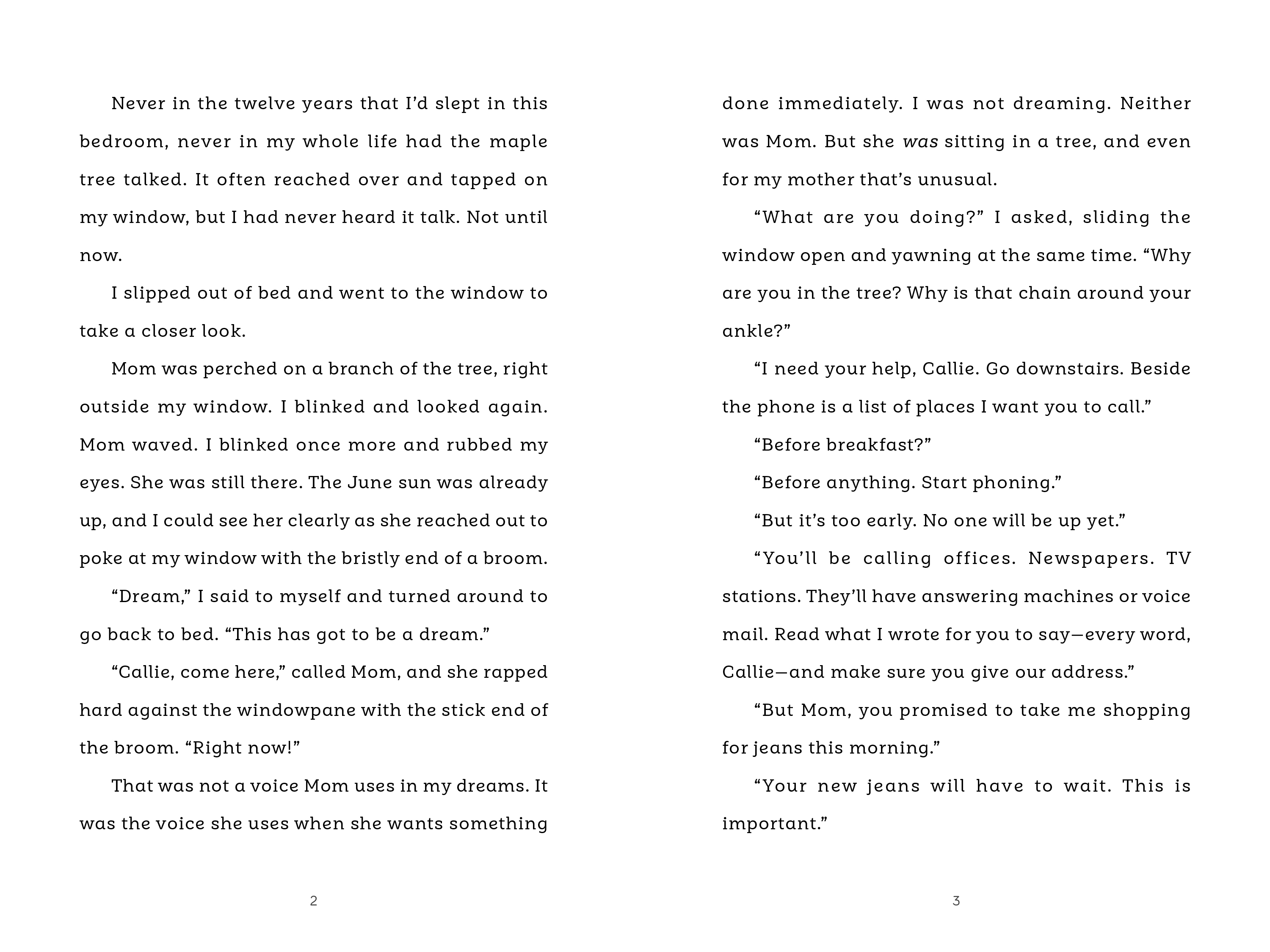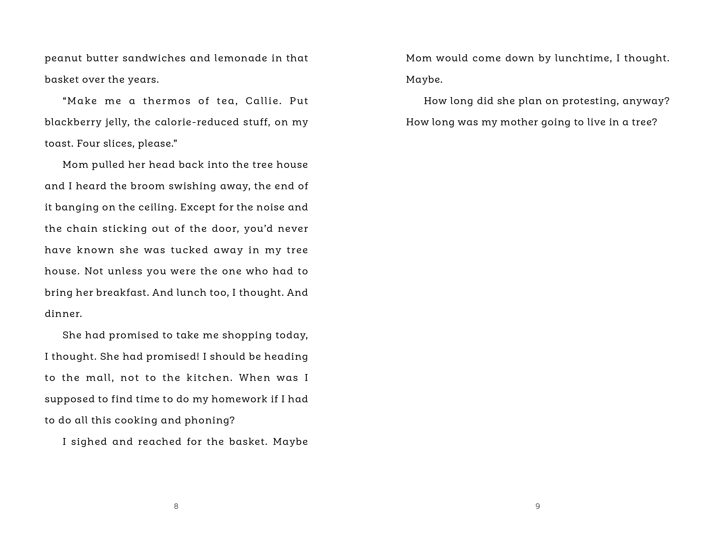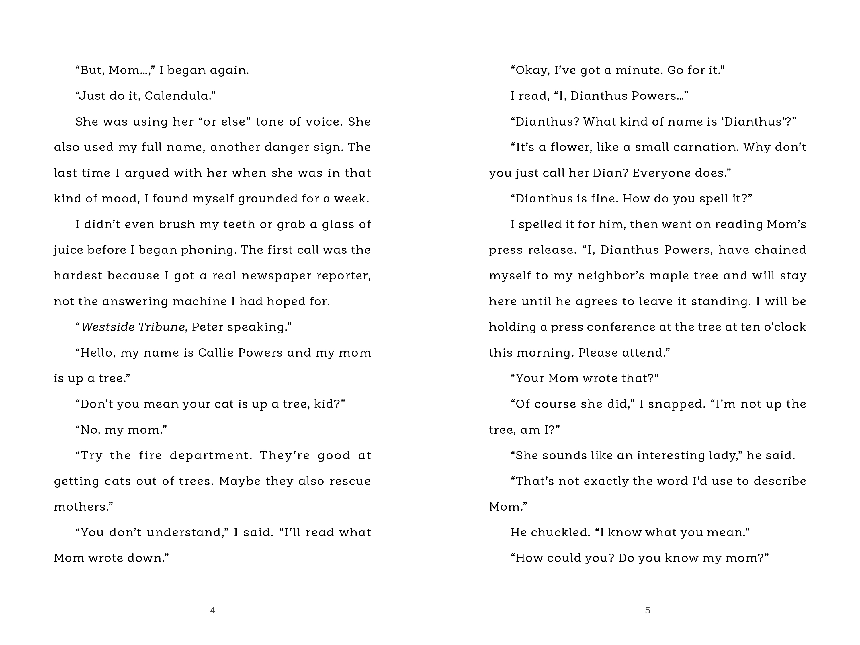 Callie's mother has chained herself to the neighbor's tree and is living inside the treehouse. She refuses to come down until the neighbor, Mr. Wilson, agrees to leave the tree standing. Soon reporters arrive, followed by an activist group called the Singing Grannies and a gang of bikers—each group adding to the chaos. Callie doesn't want to deal with any of them but she needs to figure out how to get her mother to come down from the tree so that her life can return to normal.