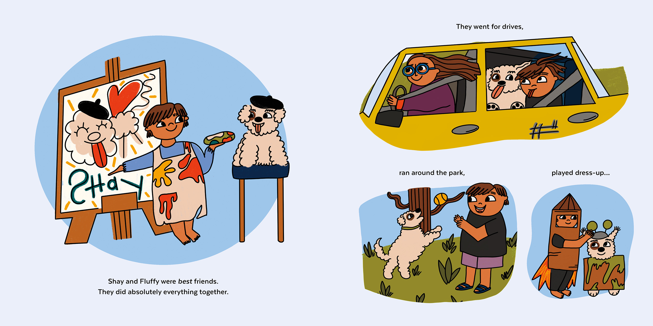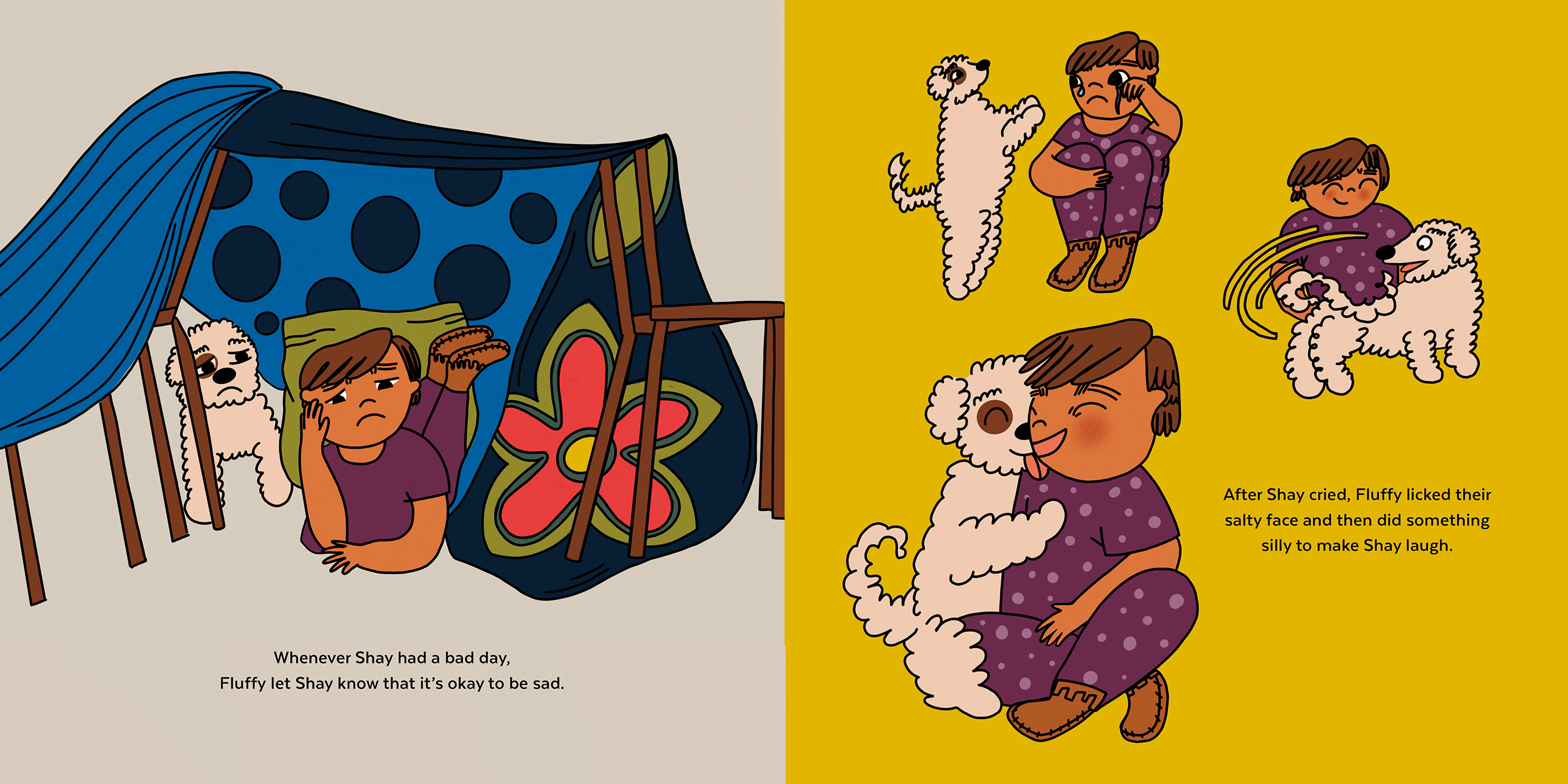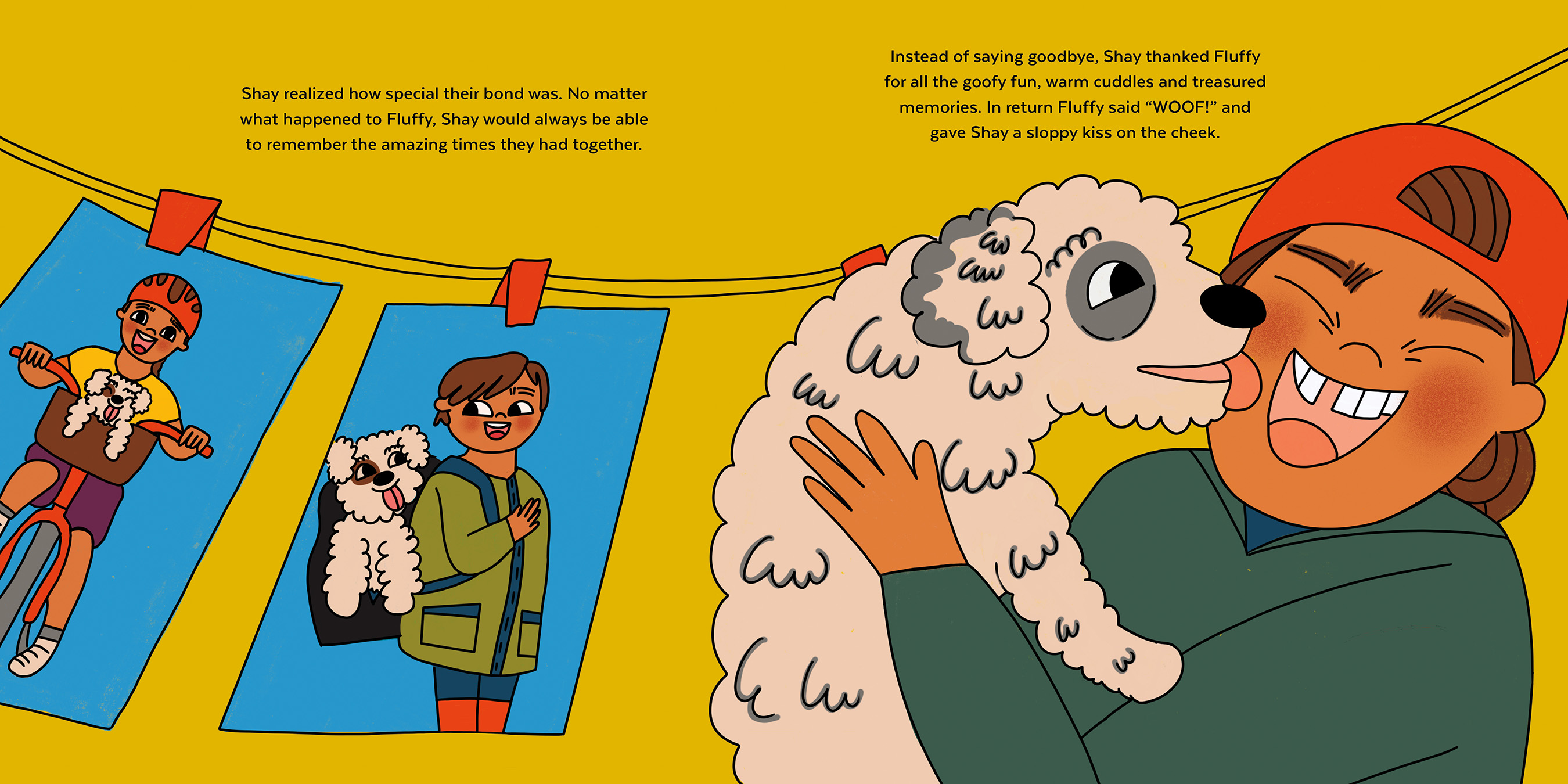 Shay and their dog Fluffy are best friends. Through the years they are each other’s source of comfort and companionship in times of both sadness and joy. When Shay learns that Fluffy is sick and they must say goodbye, they feel angry and scared. But Fluffy offers a gentle reassurance—as she always has—and Shay reflects on the meaningful bond they have shared with their friend and the love for her that they will hold in their heart forever.