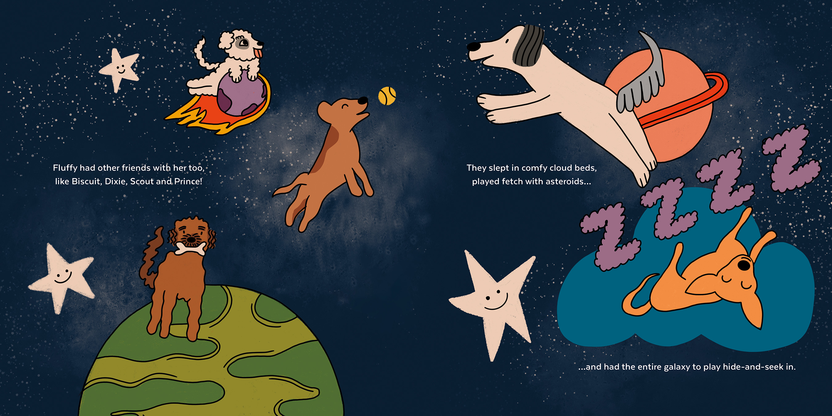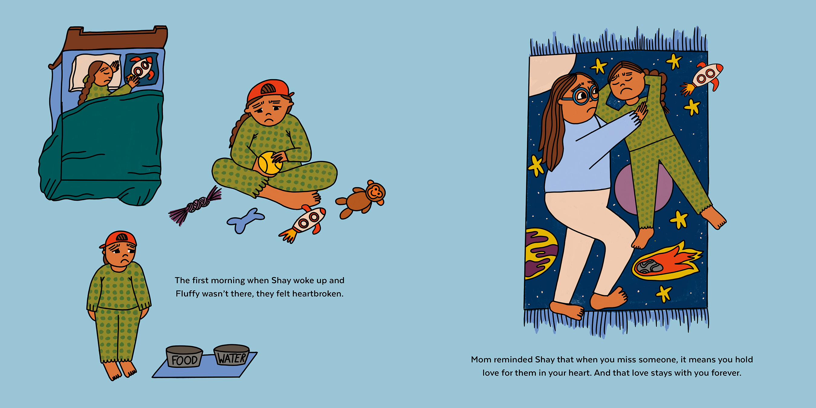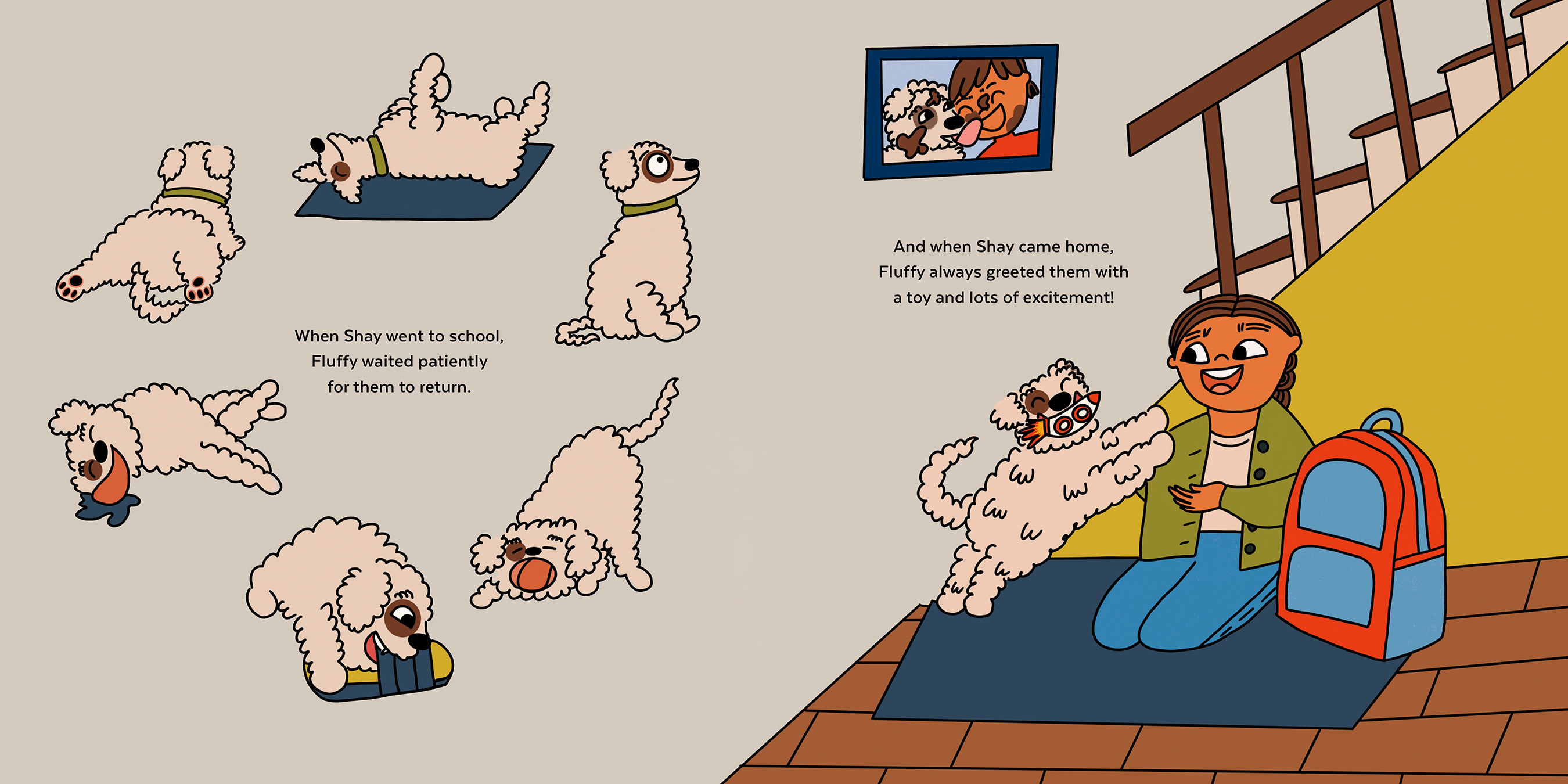 Shay and their dog Fluffy are best friends. Through the years they are each other’s source of comfort and companionship in times of both sadness and joy. When Shay learns that Fluffy is sick and they must say goodbye, they feel angry and scared. But Fluffy offers a gentle reassurance—as she always has—and Shay reflects on the meaningful bond they have shared with their friend and the love for her that they will hold in their heart forever.