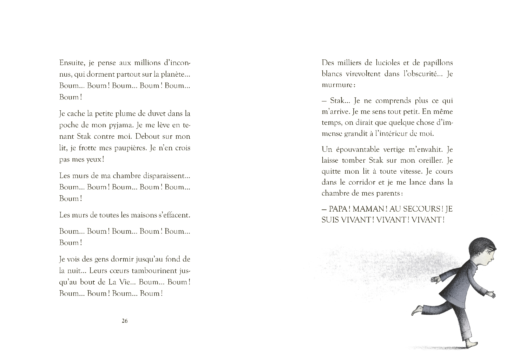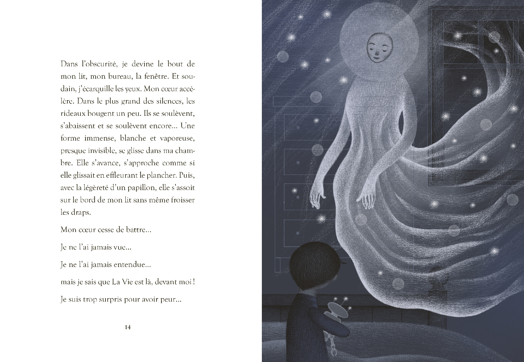 Pourquoi c’est moi qui suis moi ? Pourquoi je ne suis pas mon voisin ? Ma voisine ? Une souris ? Un robot ? Si je n’étais pas là, je serais où ? Où étais-je avant de naître ? La Vie, Elle vient d’où et Elle s’en va où ?En pleine nuit, Gabriel fait une rencontre extraordinaire. Une Grande Dame transparente et lumineuse lui révèle des secrets. Bouleversé, le garçon prend alors conscience d’être en vie et, surtout, surtout, de faire partie de la Grande Vie.