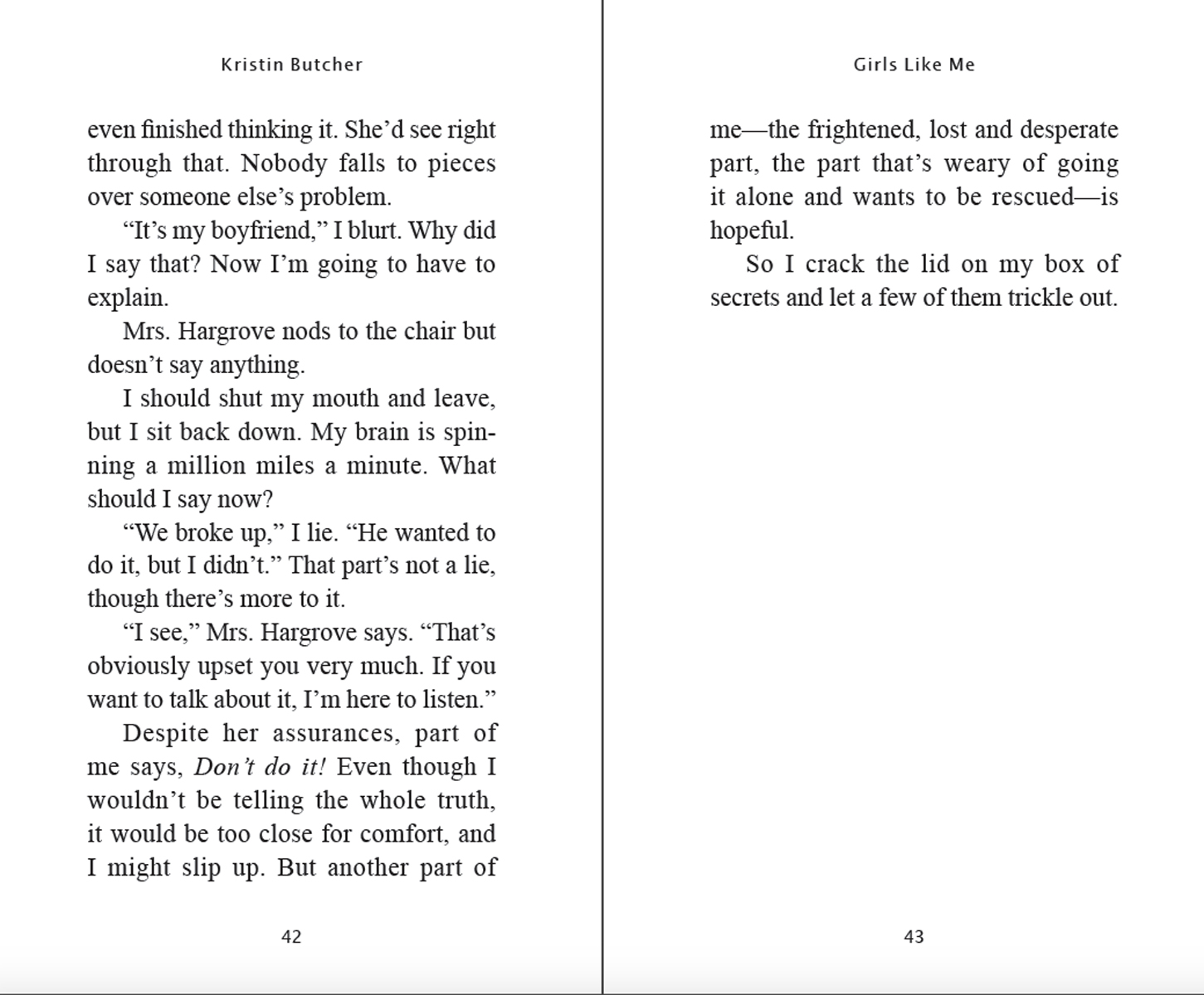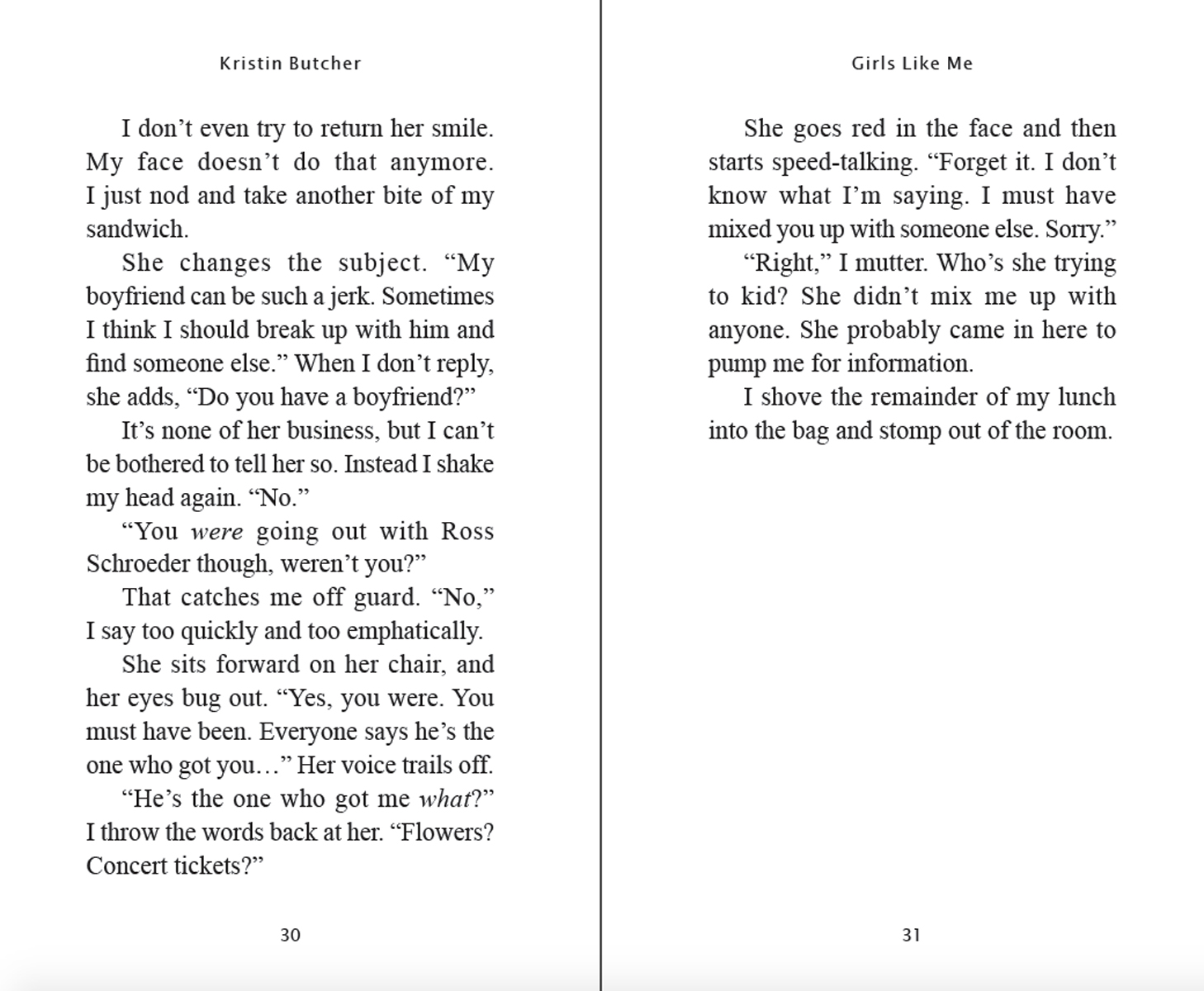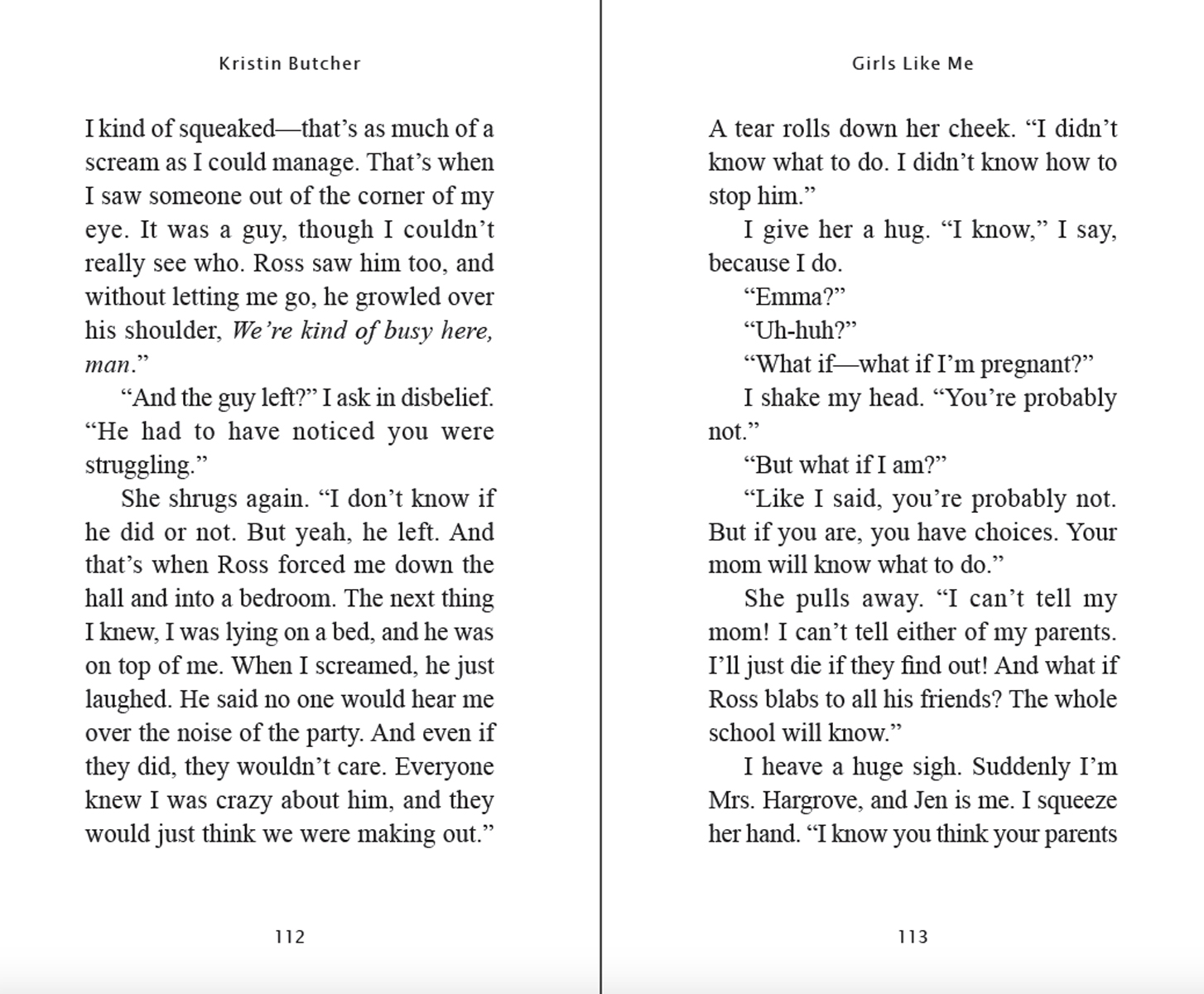 Handsome, popular Ross Schroeder tells everyone the sex was consensual, and Emma is immediately branded as a slut. Even Emma's best friend, Jen, doesn't believe Emma's version of events. In fact, she is angry with Emma because she feels betrayed. After all, she liked Ross first. But when Ross starts showing interest in Jen, Emma knows she will have to find a way to get Jen to believe that she really is in grave danger. Before it's too late.