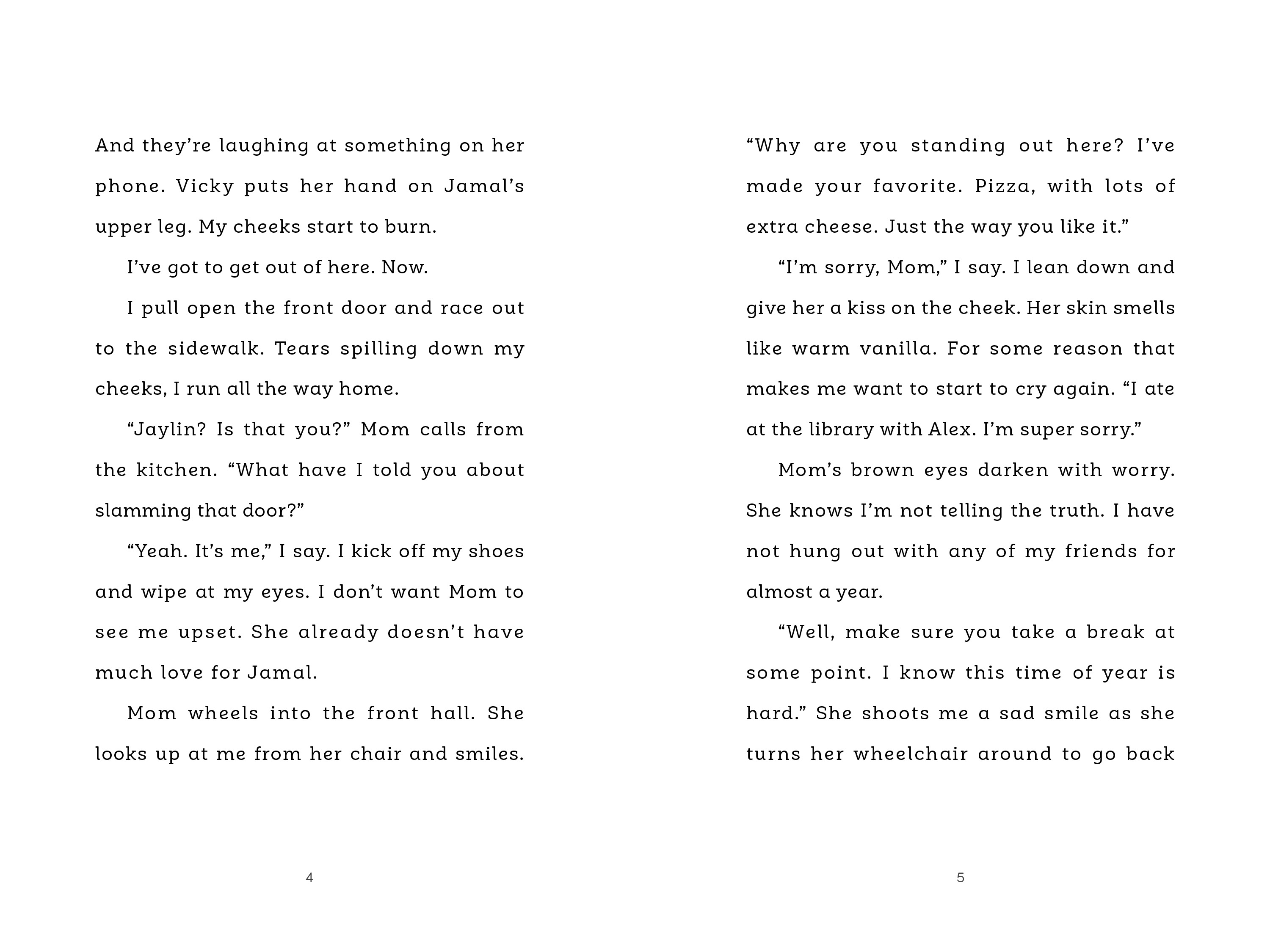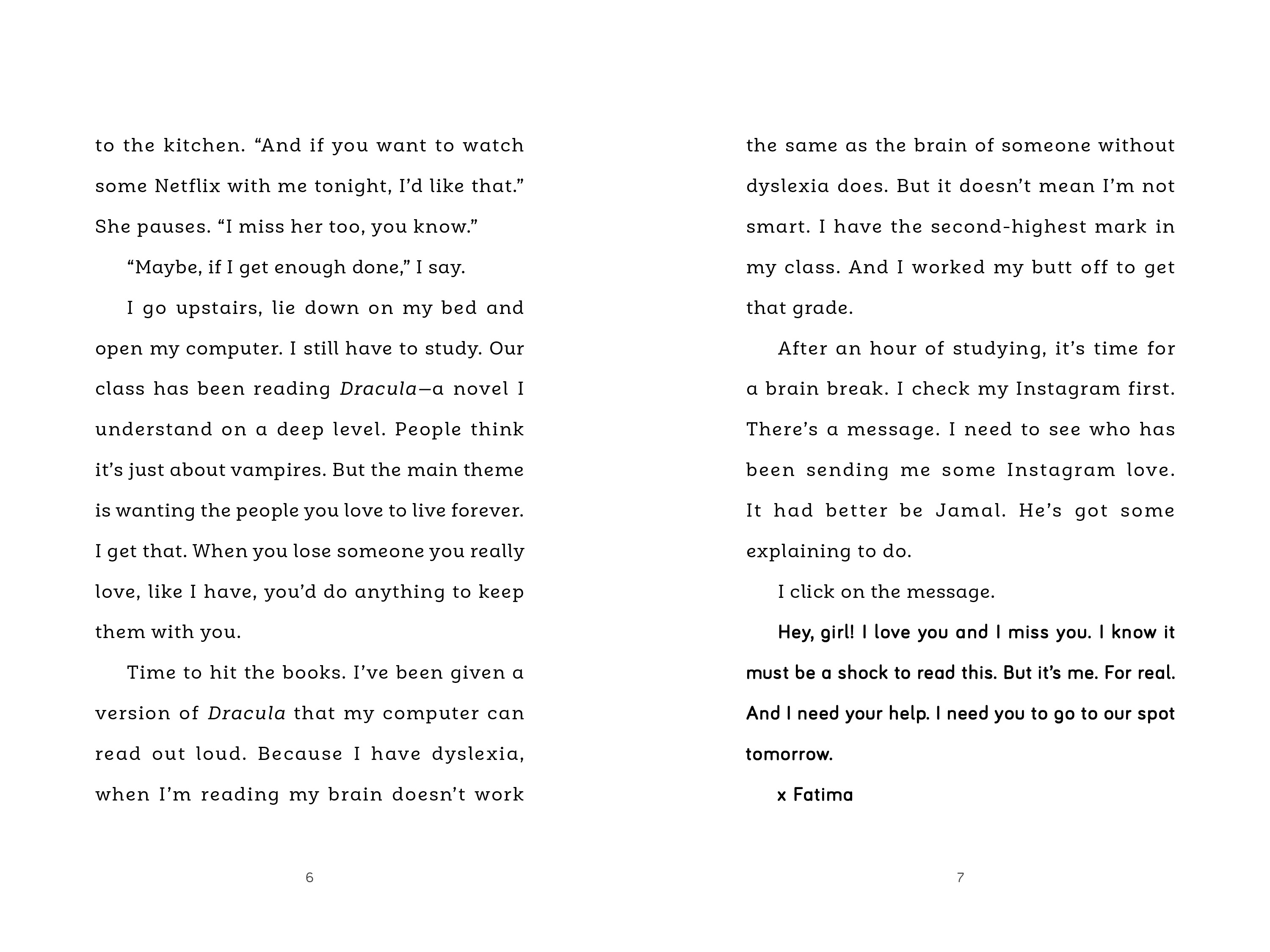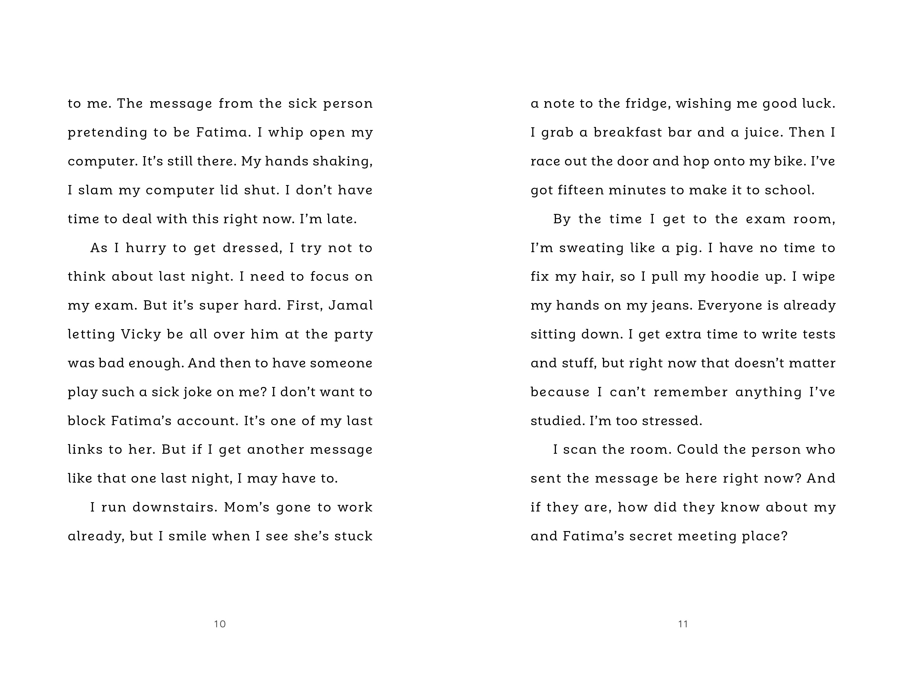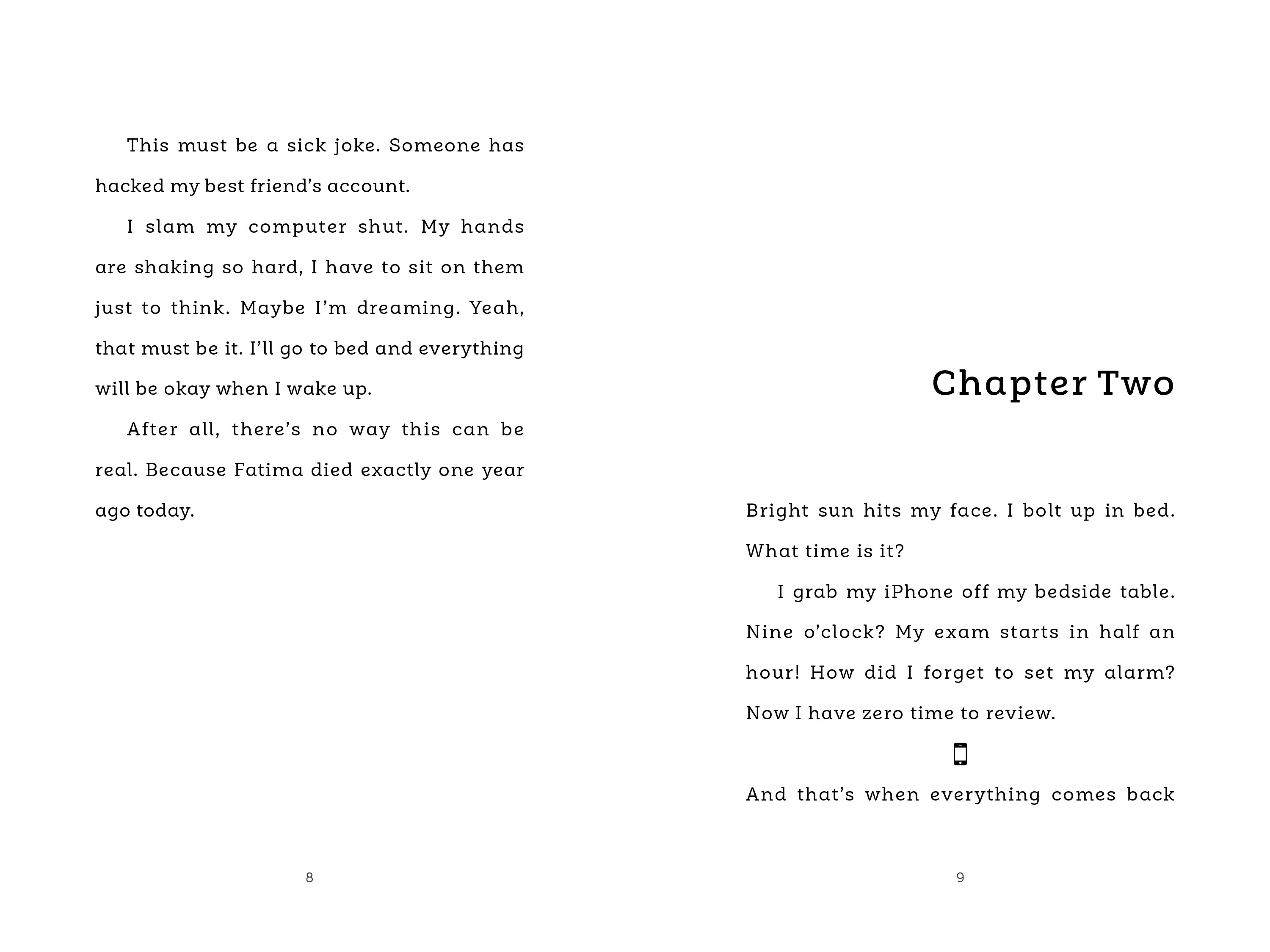 The thing is, Fatima died a year ago in a terrible traffic accident. At first, Jaylin thinks someone is playing a horrible prank, but as the texts become more detailed, containing secrets that just the two of them shared, Jaylin realizes she’s either going mad or Fatima is actually reaching out to her from beyond the grave. Then Fatima shares one last secret and asks Jaylin to set the record straight around the circumstances of her death. Jaylin is torn. Is she strong enough to relive losing her best friend all over again?
