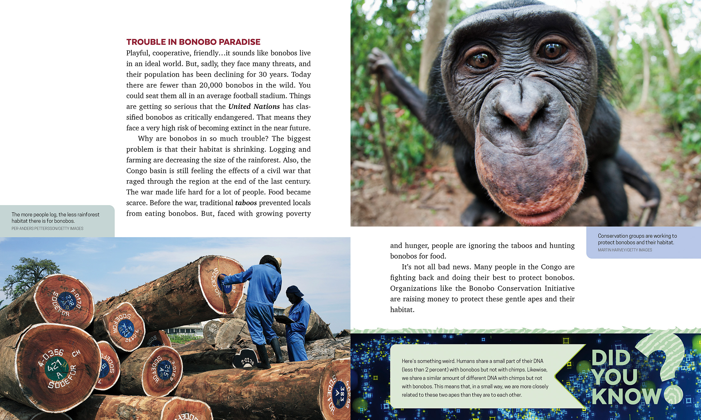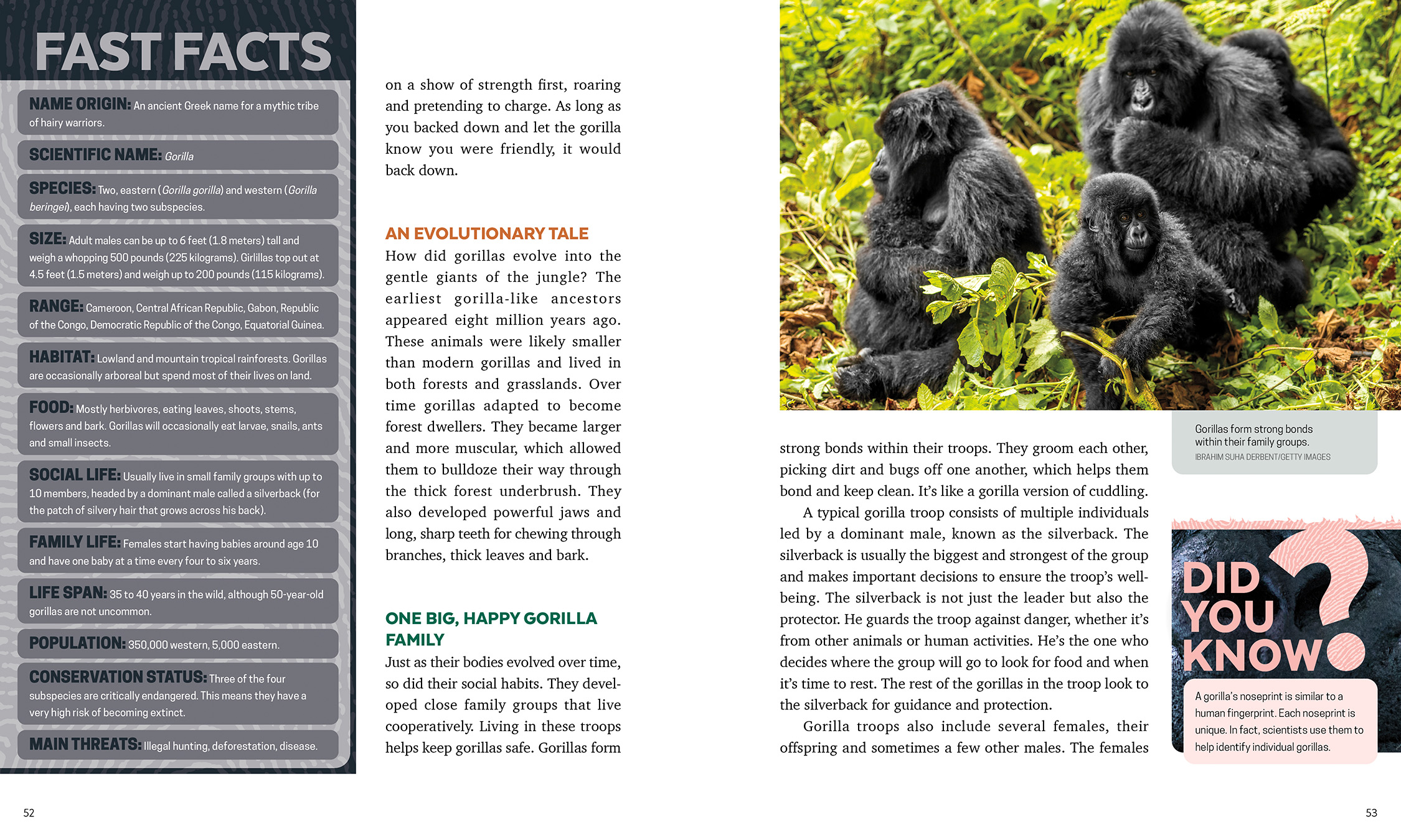 Get to know our charismatic chimpanzee cousins, the peaceful bonobos, three types of high-flying orangutans and those gentle giants of the jungle, the gorillas. Discover where and how they live, their biology, what they eat and what they share in common with humans—beyond their opposable thumbs. These giant mammals are our closest relatives in the animal world, known for their intelligence, complex social structures and communication skills. But great apes everywhere are in trouble. Their habitat is being destroyed by deforestation and the effects of climate change. Their population is dropping, and fast. In Great Apes, find out what conservationists, scientists and young people all over the world are doing to protect them.