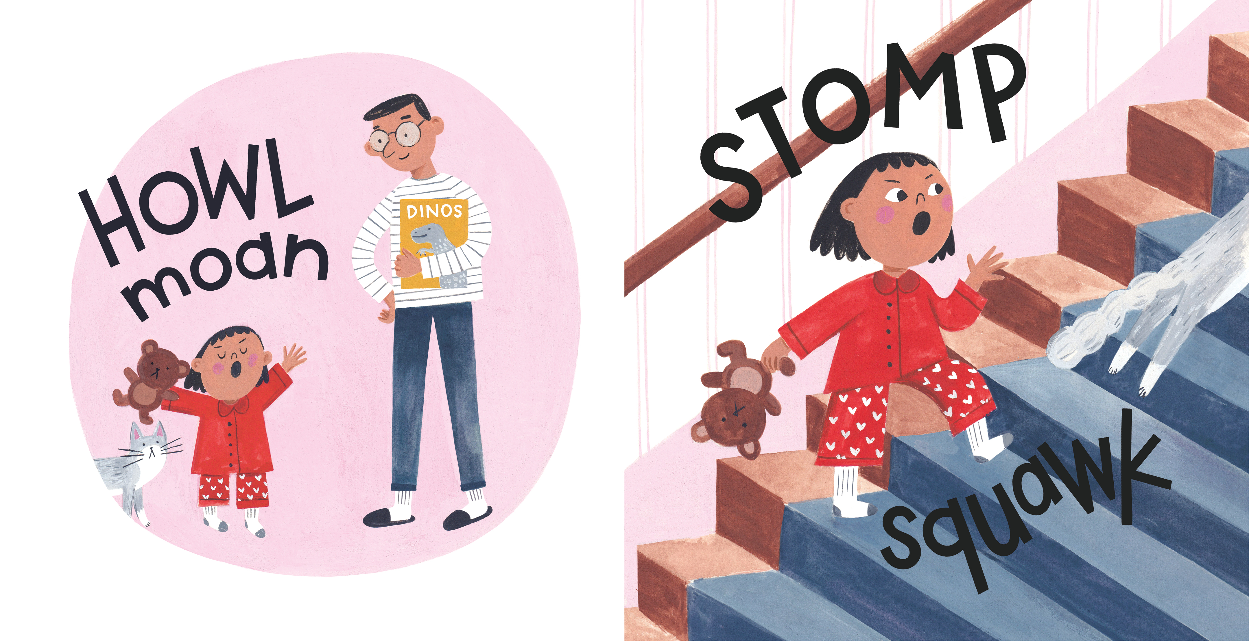 Grumble Yawn follows the onomatopoeic antics of a young girl and her cat as they resist the bedtime routine.
