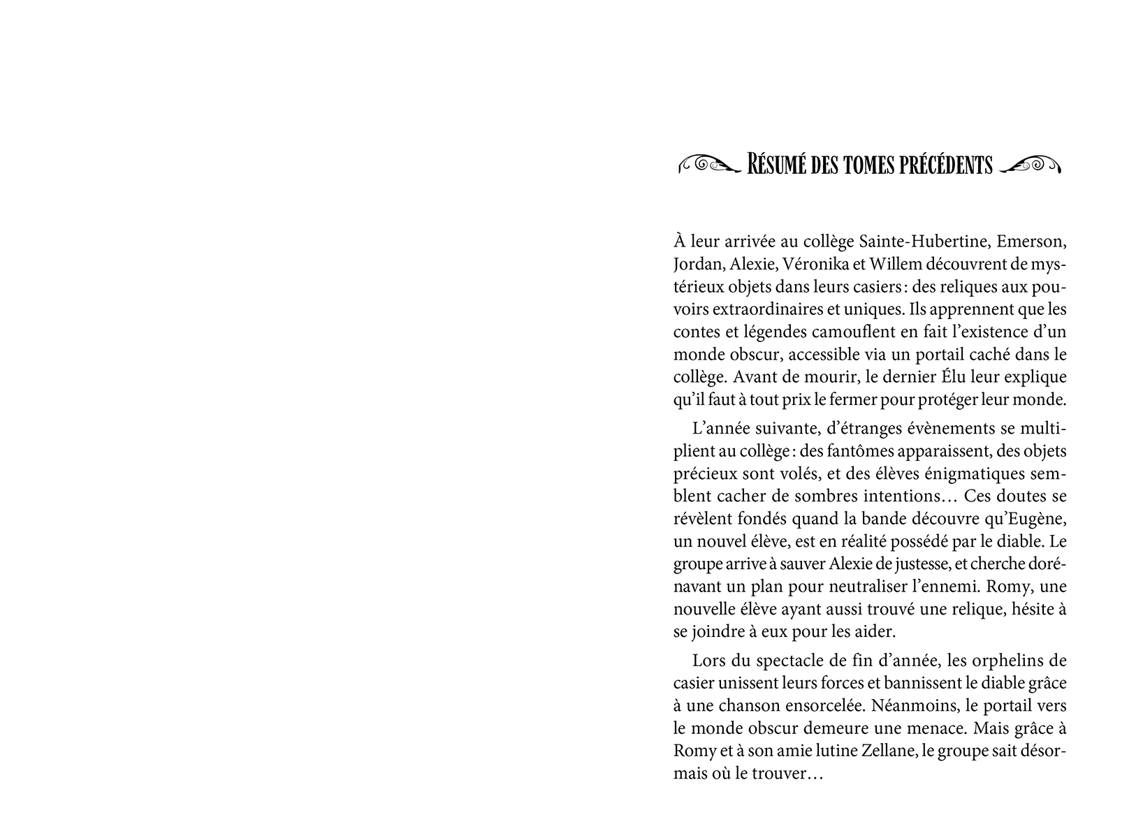 De retour au collège Sainte-Hubertine pour leur troisième année du secondaire, les orphelins de casier localisent enfin le portail menant au monde obscur. Mais en plus de chercher comment le fermer, Emerson, Jordan, Alexie, Véronika, Willem et Romy doivent repousser de nouvelles créatures qui s’introduisent dans l’école… Alors qu’ils tentent de maîtriser l’art des potions et de retrouver des livres disparus, un groupe d’élèves fragilise la solidarité des voisins de casier. Derrière la mission protectrice de cette « brigade » se trame quelque chose de plus sombre : une vengeance aux airs de sorcellerie. Dans ce troisième tome rempli d’émotions et de découvertes captivantes, ce ne sont plus seulement les créatures du monde obscur qu’il faut craindre…