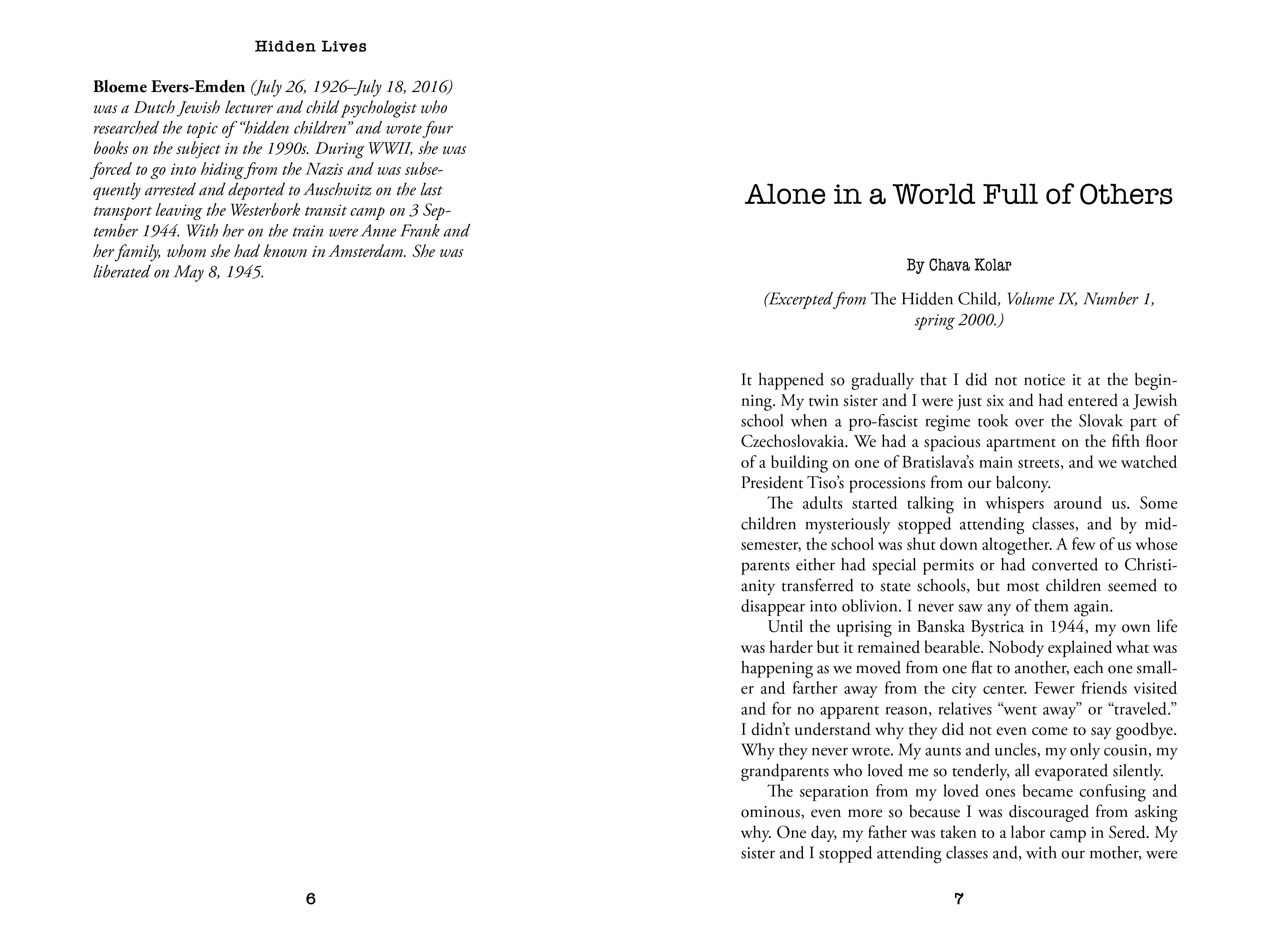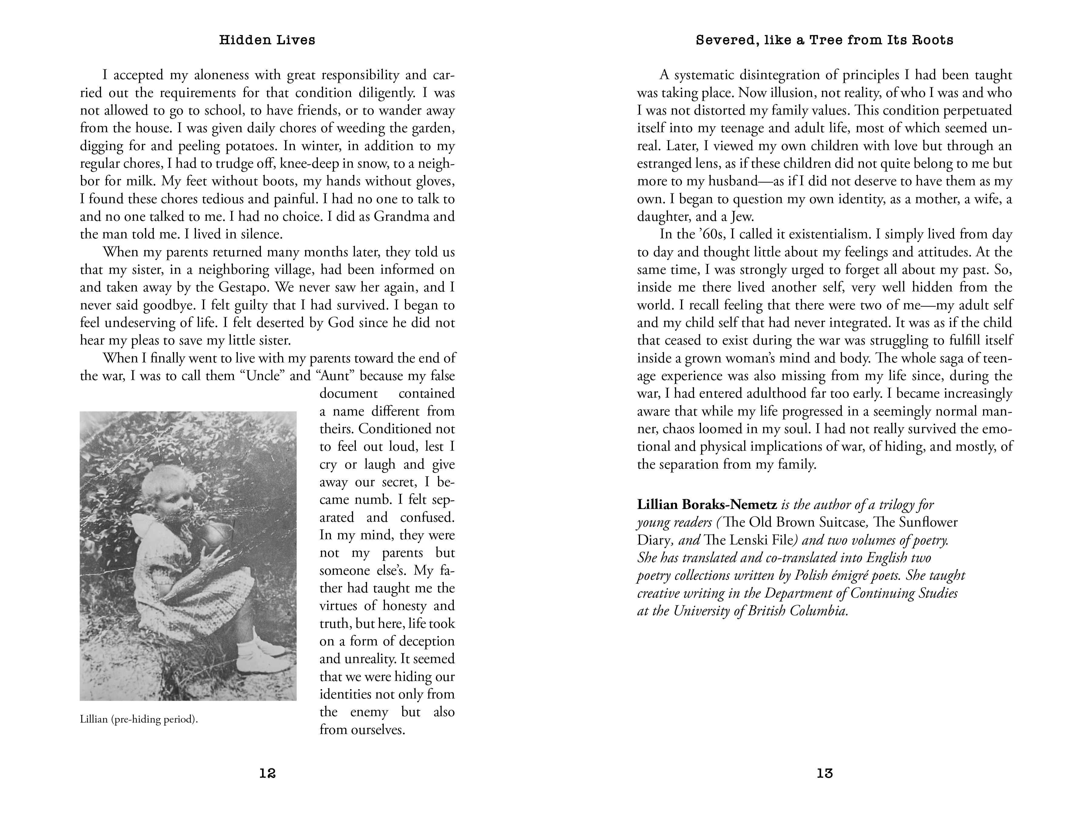 Hidden Lives is a collection of true stories written by the youngest survivors of the Holocaust. Desperation compelled parents to make the agonizing decision to leave their children with strangers or to let them fend on their own. Many were too young to understand why they were being left behind, often under assumed identities. While the vast majority of these children were orphaned by the end of the war, some were reunited with family who, in many cases, now seemed like strangers. Their accounts are marked with fear, confusion, and abandonment, as well as a loss of their Jewish identity. These true stories are profiles of bravery: of the children who survived in often terrible circumstances, of the parents and families who were forced to leave them behind, and of the many people—including Christian families, many times complete strangers—who risked their lives to save them.