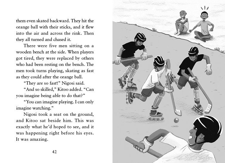 Kenyan orphans, Kitoo and Nigosi, spend their days studying, playing soccer, helping their elders with chores around the orphanage and reading from the limited selection of books in their library. When the librarian gives Kitoo a copy of Sports Around the World he becomes fascinated by an image of the Canadian national men's ice hockey team. Then one day the fates align and Kitoo finds a pair of beat-up old roller blades. He teaches himself to skate and dreams of one day playing hockey like the men in his book. But you can’t play ice hockey in Kenya, can you?