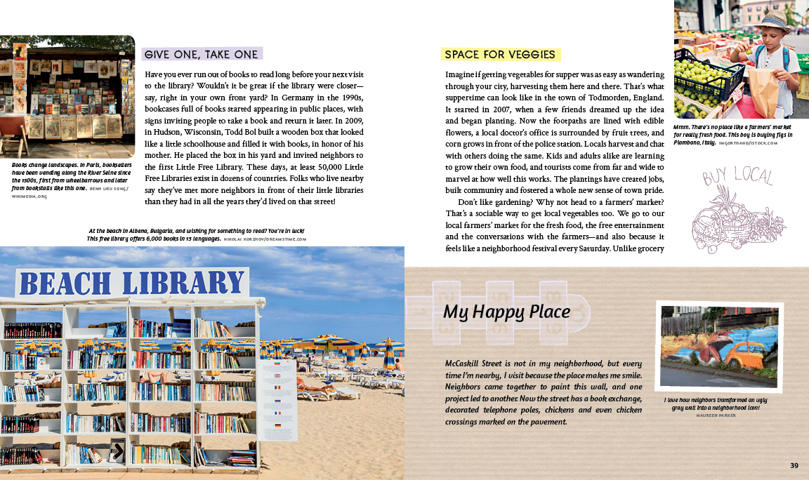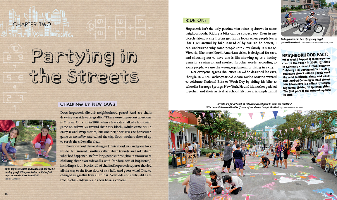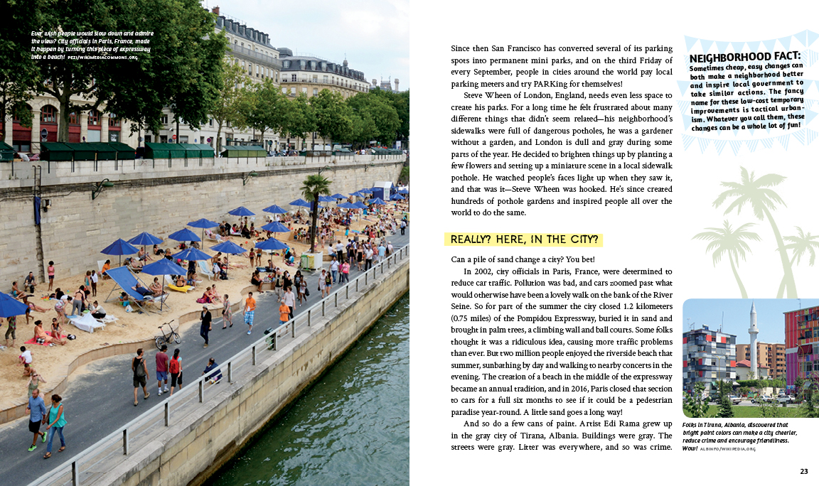 Picture a busy avenue. Now plant trees along the boulevard, paint a mural by the empty lot, and add a community garden. Set up benches along the sidewalks and make space for kids' chalk drawings, and you've set the scene for a thriving community. Kids are natural placemakers, building tree forts, drawing on sidewalks and setting up lemonade stands, but people of all ages can enjoy creative placemaking activities. From Dutch families who drag couches and tables onto sidewalks for outdoor suppers to Canadians who build little lending libraries to share books with neighbors, people can do things that make life more fun and strengthen neighborhoods. Home Sweet Neighborhood combines upbeat text, fun facts and colorful photos to intrigue and inspire readers.
