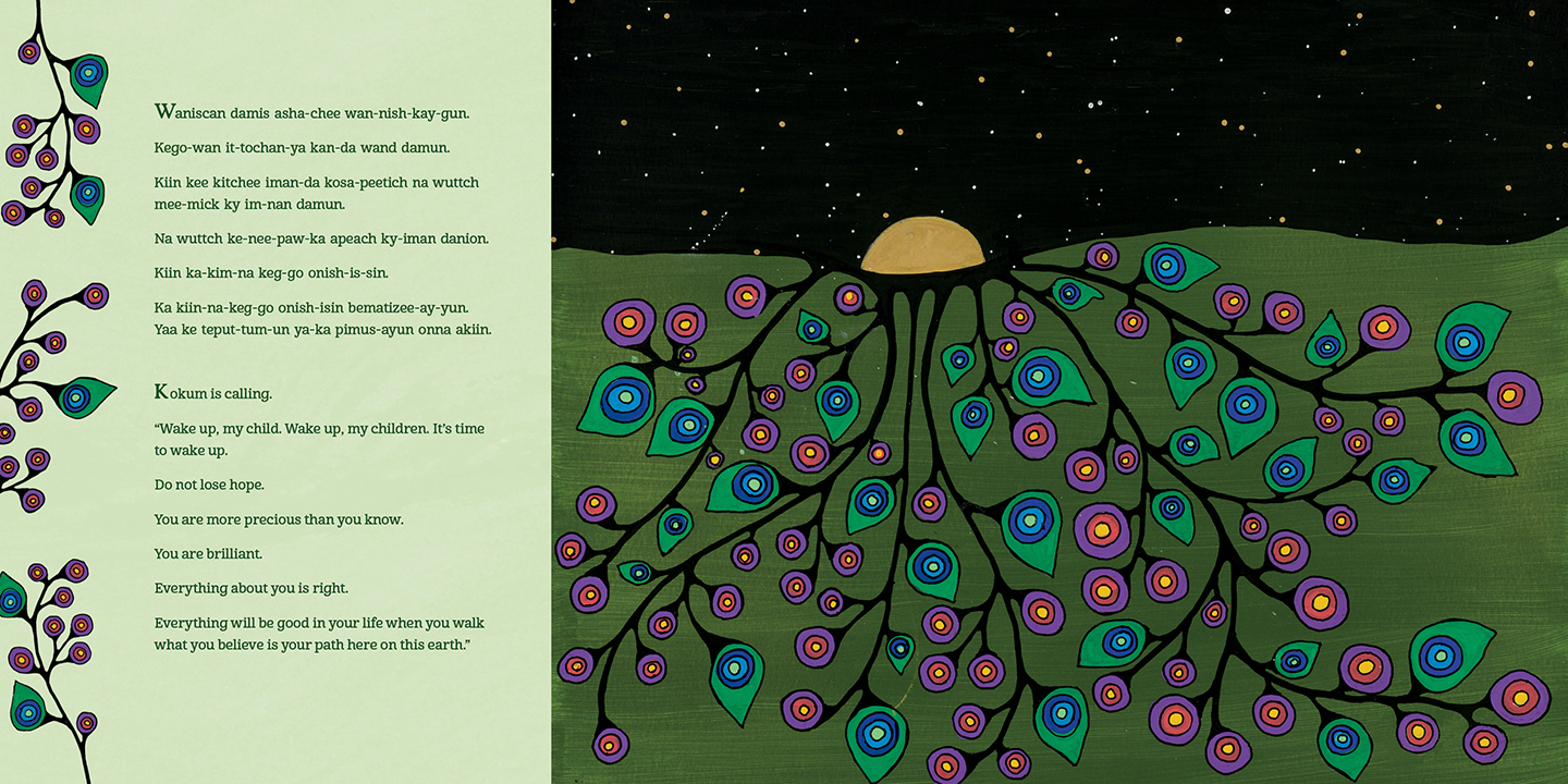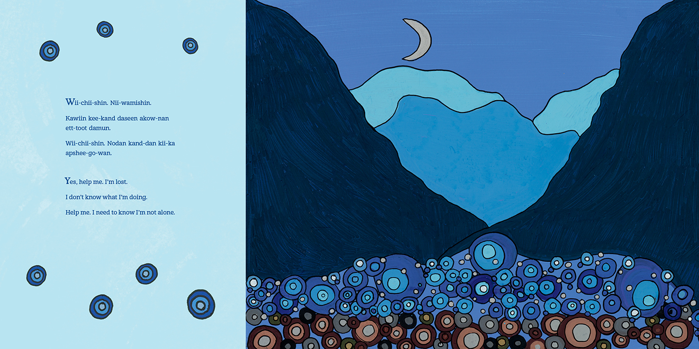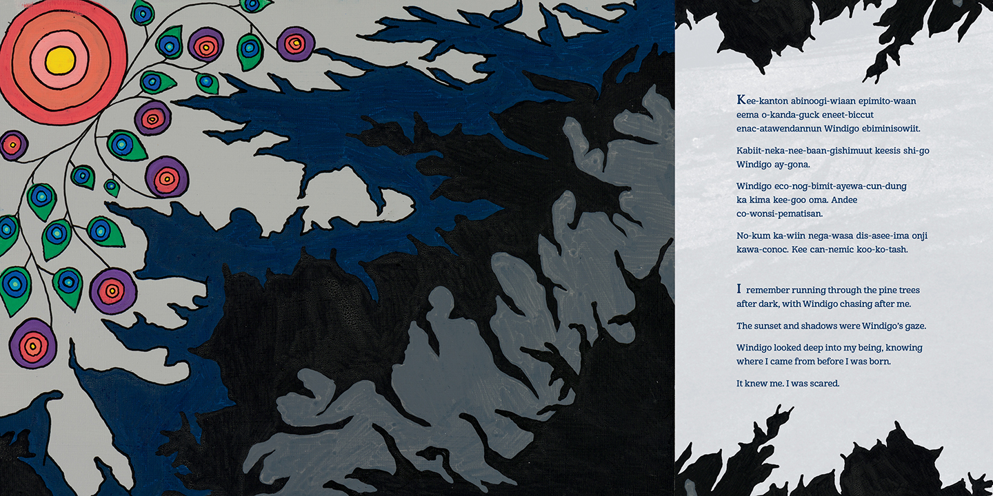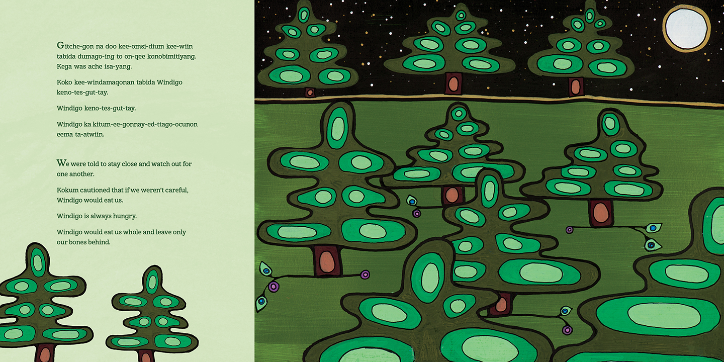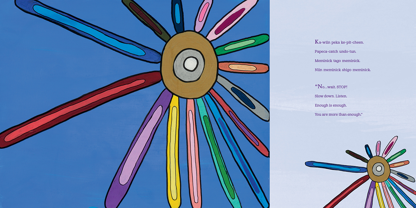 This bilingual book includes full text in both English and Anishinaabemowin.