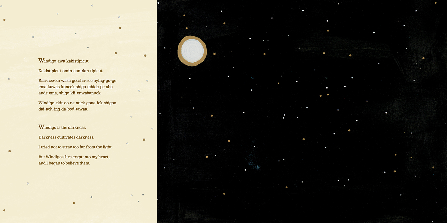 Kokum warned us to watch out for one another. If we weren't careful, Windigo would eat us. But one night, alone in the darkness, I felt its breath on my neck. Windigo's lies crept into my heart, and I believed them. When we lose connection with others, we lose ourselves, and Windigo's darkness grows and spreads.