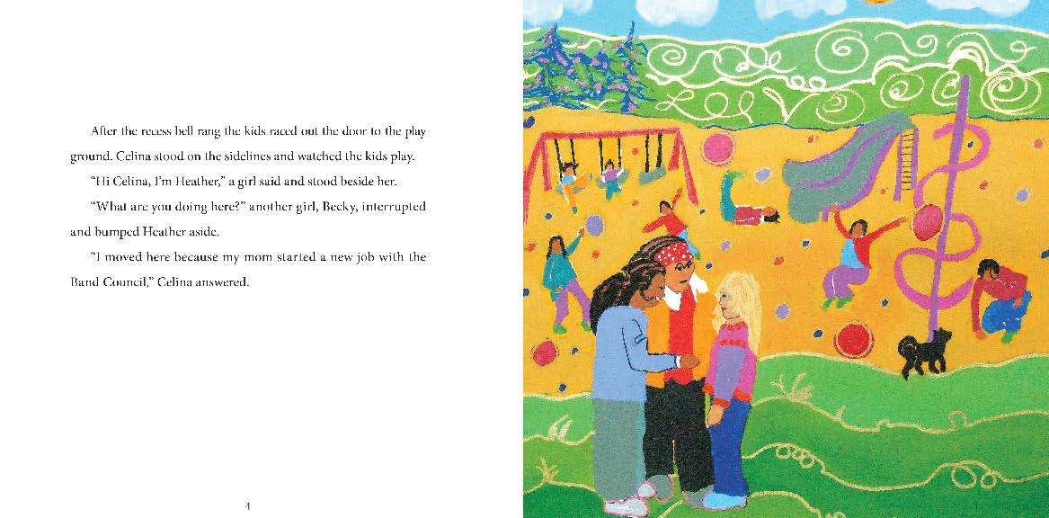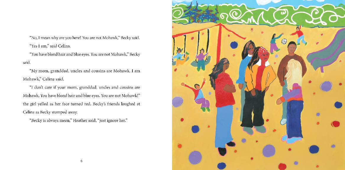 Celina is a young Mohawk girl who moves to her mother's home reserve. She is teased by her classmates who tell her that she is not Mohawk and does not belong because she has blond hair and blue eyes. Celina starts to believe her classmates and decides not to dance at an upcoming Pow Wow. But her great-grandmother helps Celina understand that being Mohawk is not about how she looks but about what she feels in her heart. When the drumming starts at the Pow Wow, Celina decides to dance after all.