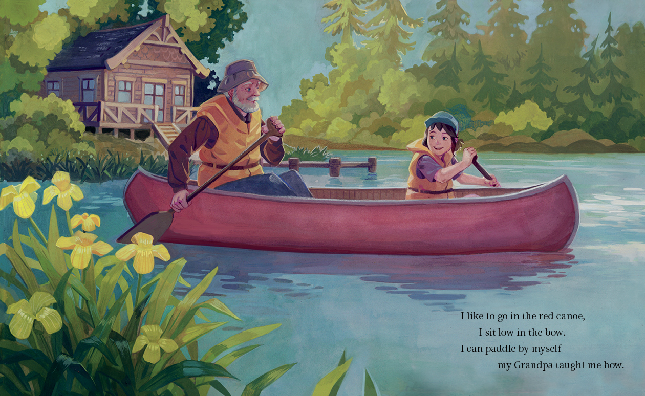 Baby ducklings ride their mama’s back; an osprey rises with a silver fish clutched in her talons; a loon cries in a star-flecked night. Rhythmic, rhyming quatrains carry the story forward in clean paddle strokes of evocative imagery. In the Red Canoe celebrates the bond between grandparent and grandchild and invites nature lovers of all ages along for the ride.