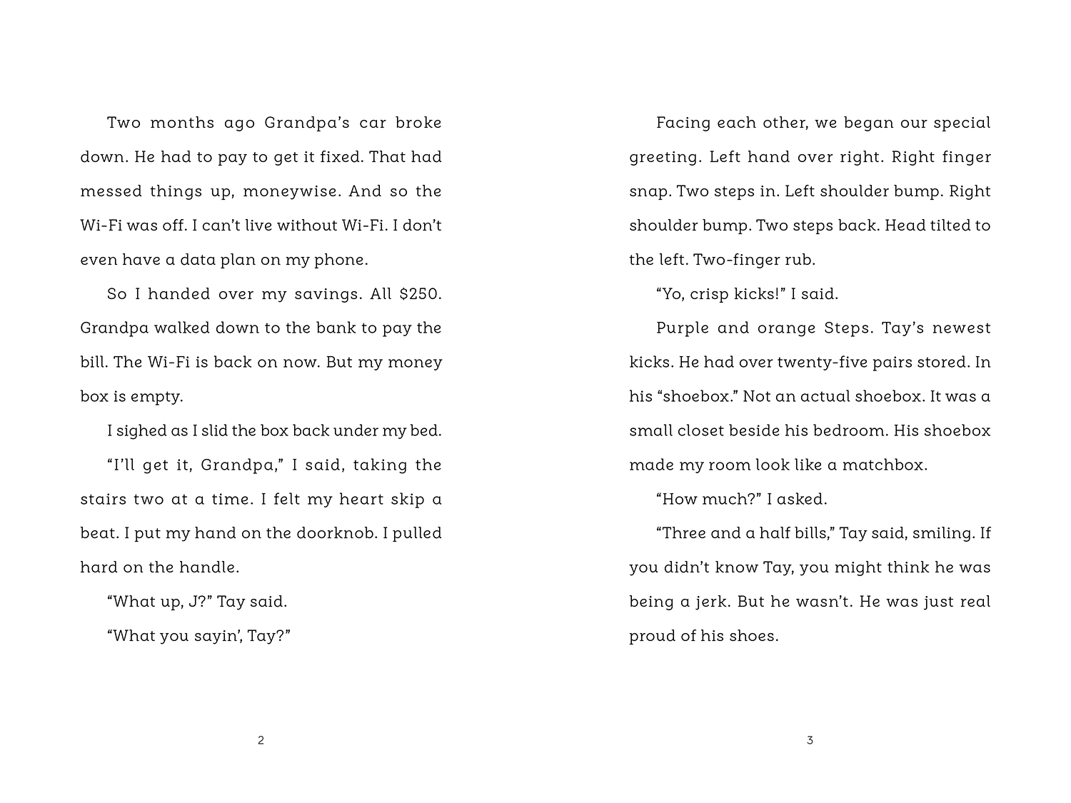 After his parents were killed in an accident three years ago, Jesse went to live with his grandfather, and it wasn’t long before the insurance money ran out. That meant no money for new threads or fresh kicks. Now with summer in swing, Jesse has been saving for new sneakers. He’ll finally be able to keep up with the rest of the kids at his school, especially his best friend, Tay Matthews, whose sneaker collection could be housed in a museum. But then his grandpa’s WiFi is cut off and Jesse has to hand over his savings to pay the bill. It looks like Jesse’s plan for new shoes is trashed. That’s until nineteen-year-old smooth-talking Derick rolls into town. With new threads and a fresh ride, Derick shows the boys there’s more than one way to get what you want. And Jesse must decide how much he is willing to pay.