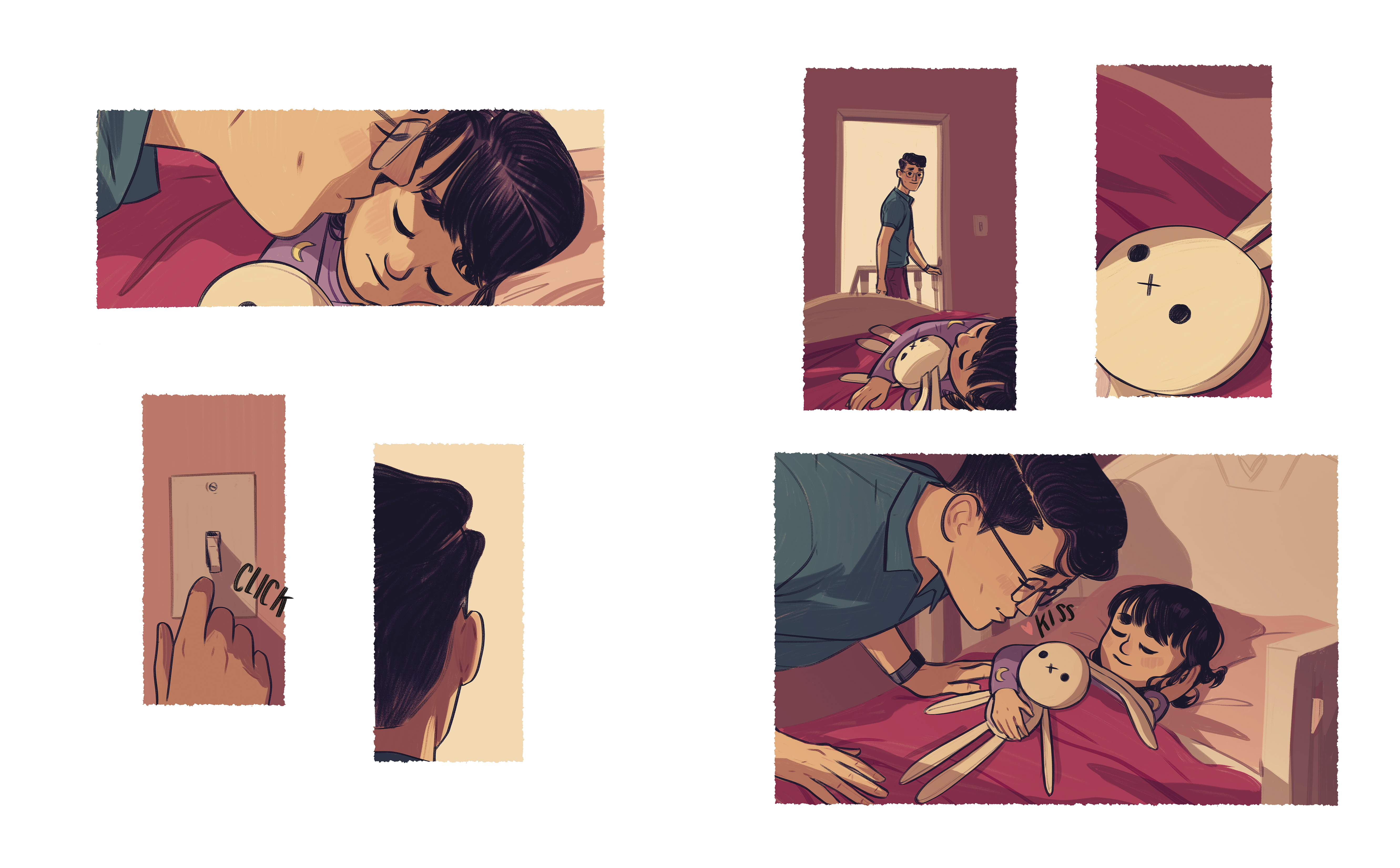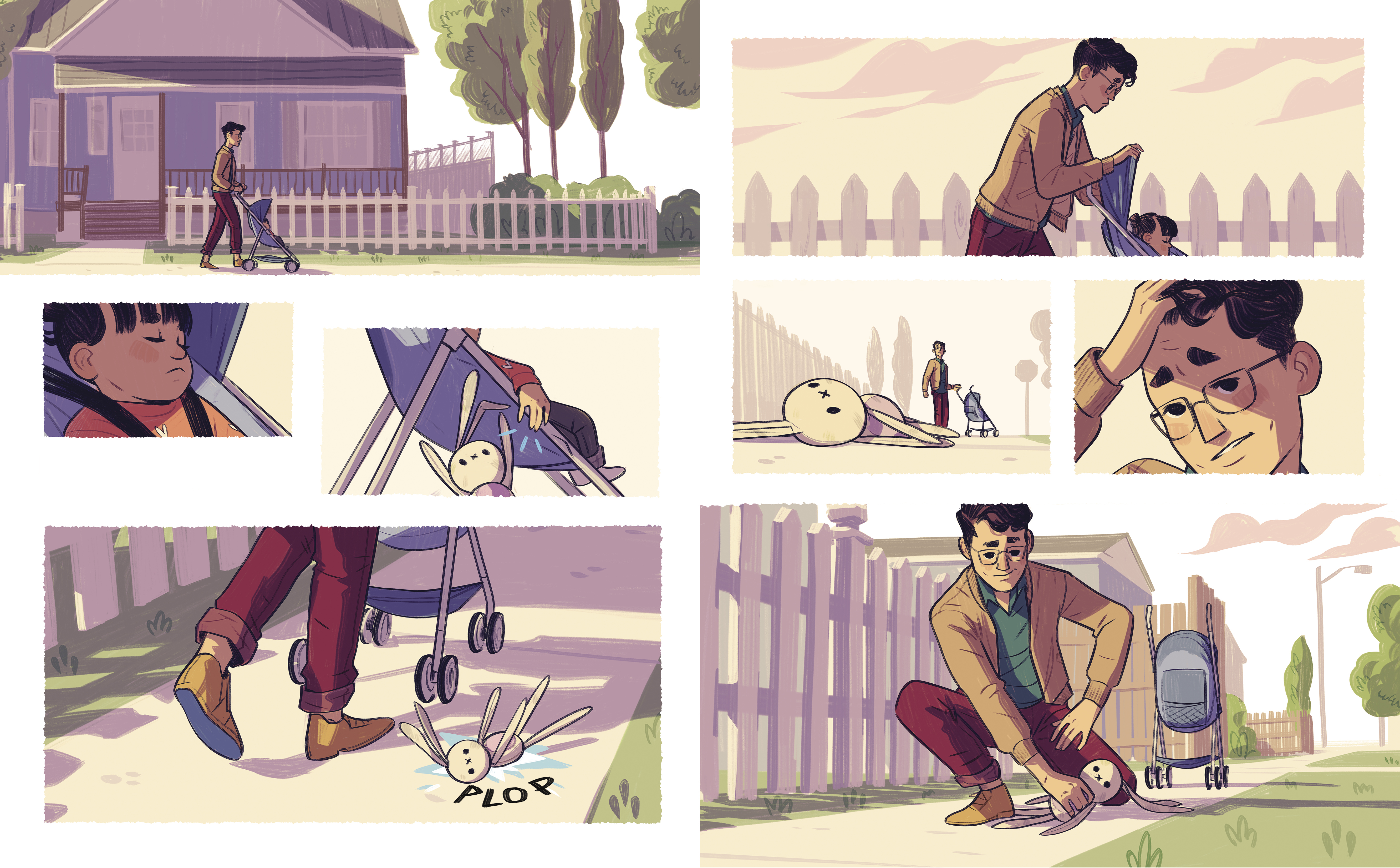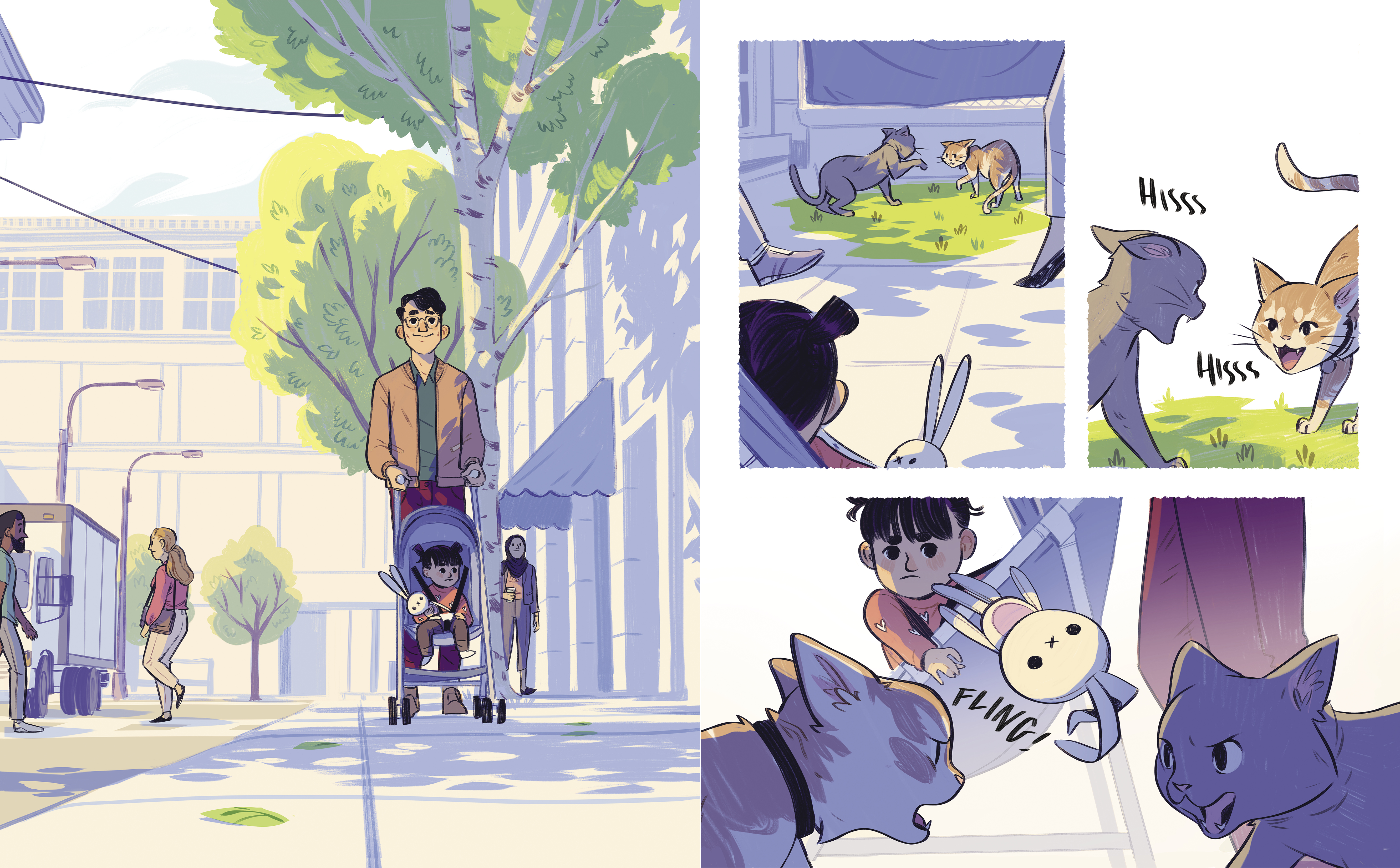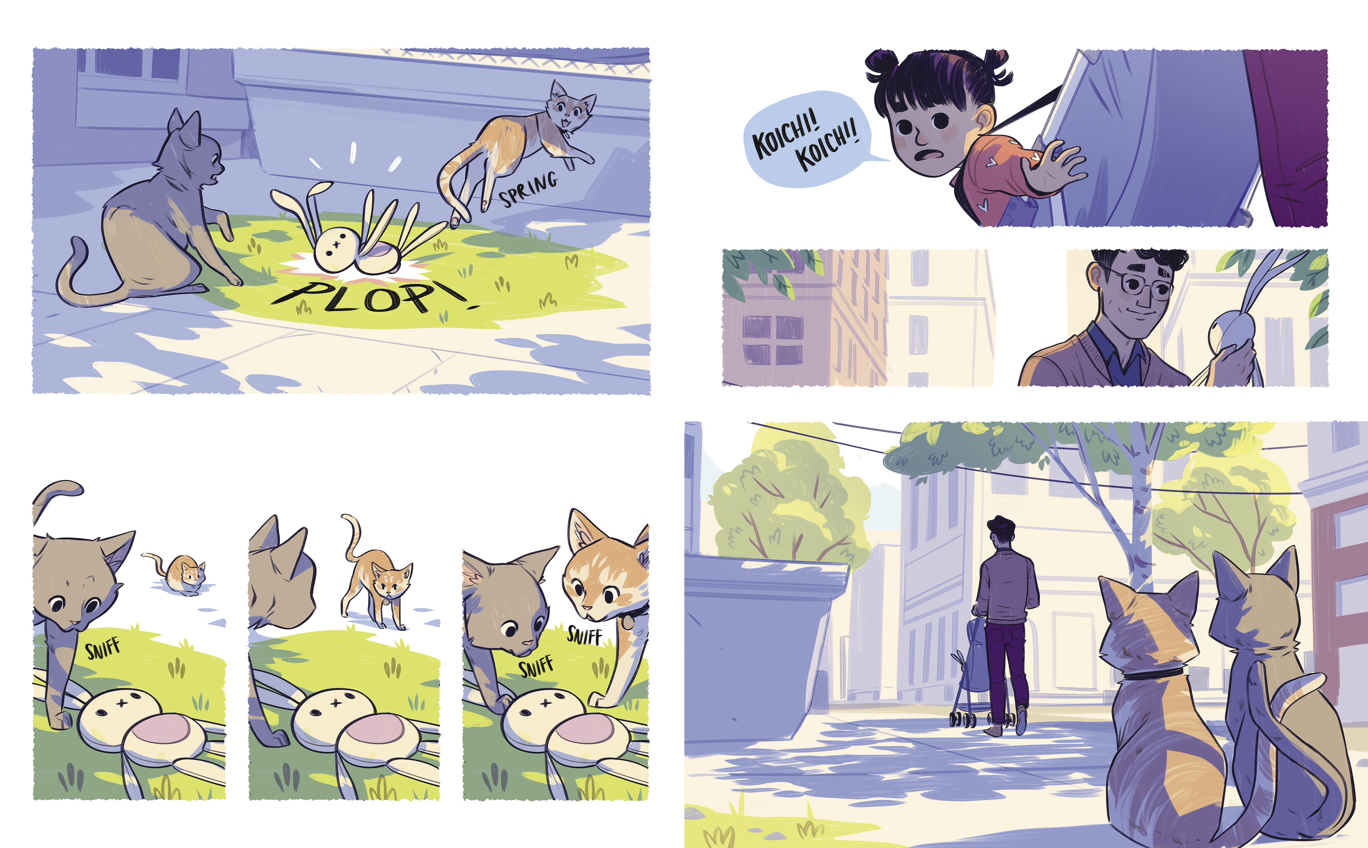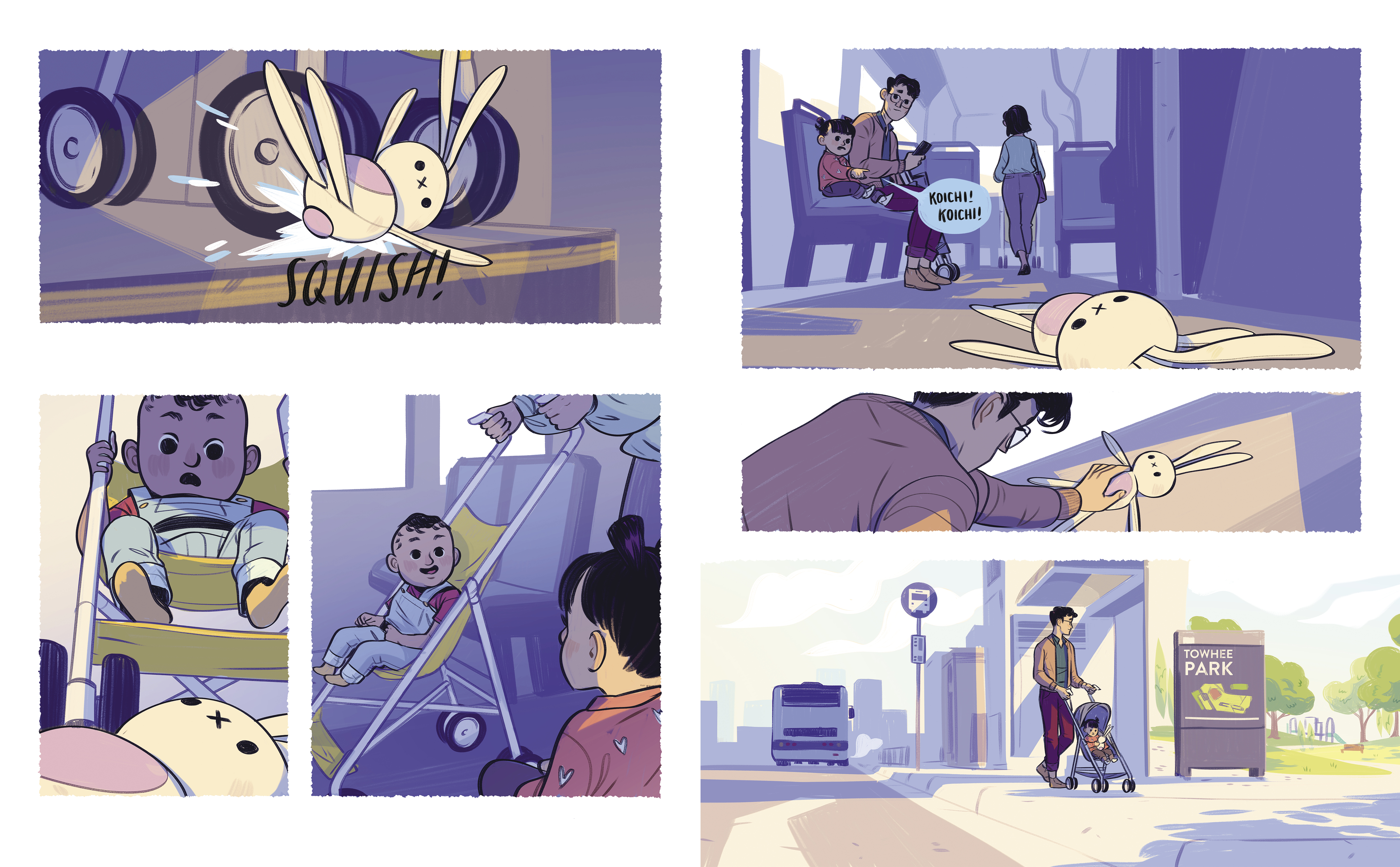 On their way, Saya stealthily stops a fight by flinging her floppy four-legged ninja-bunny between two snarling cats. Later on, on the bus, Saya throws Kunoichi under the wheels of a child’s stroller, halting its dangerous roll toward the stairs. Dad doesn't notice as Saya uses Kunoichi to save the day time and time again on their outing and on the bus home, proving small actions can have a great impact.