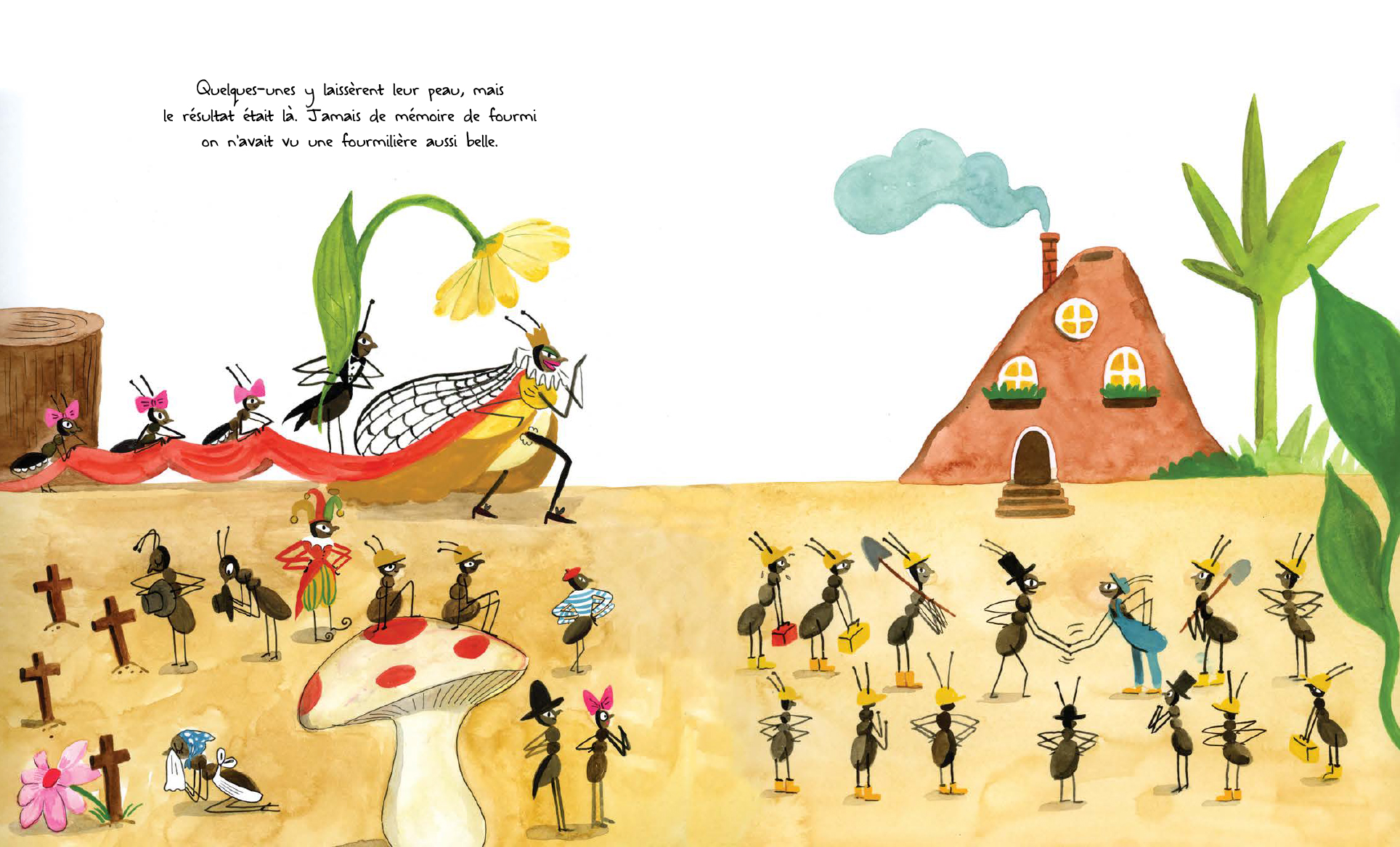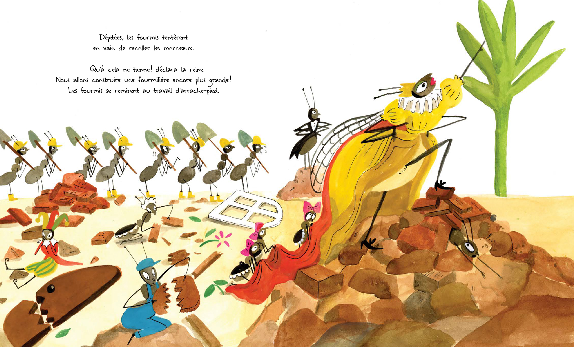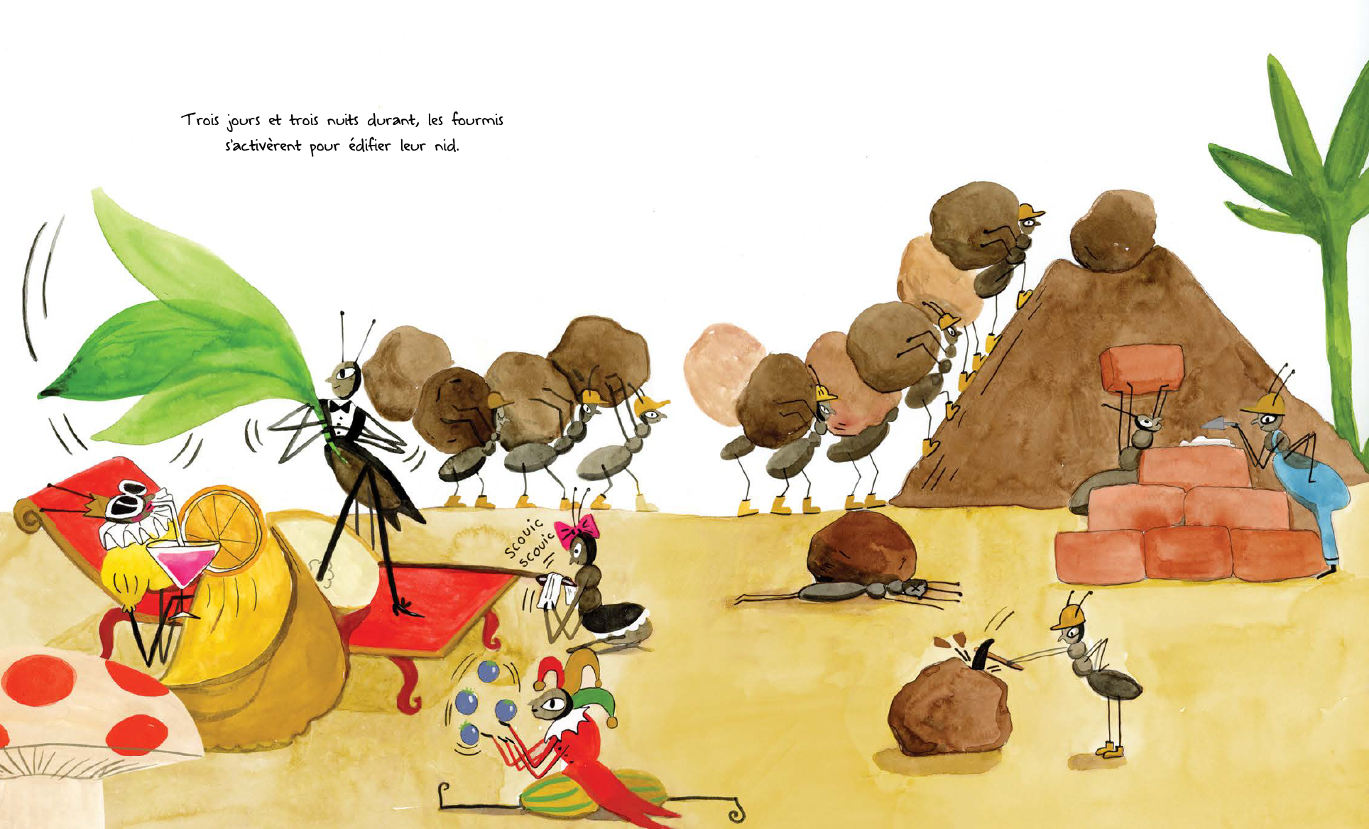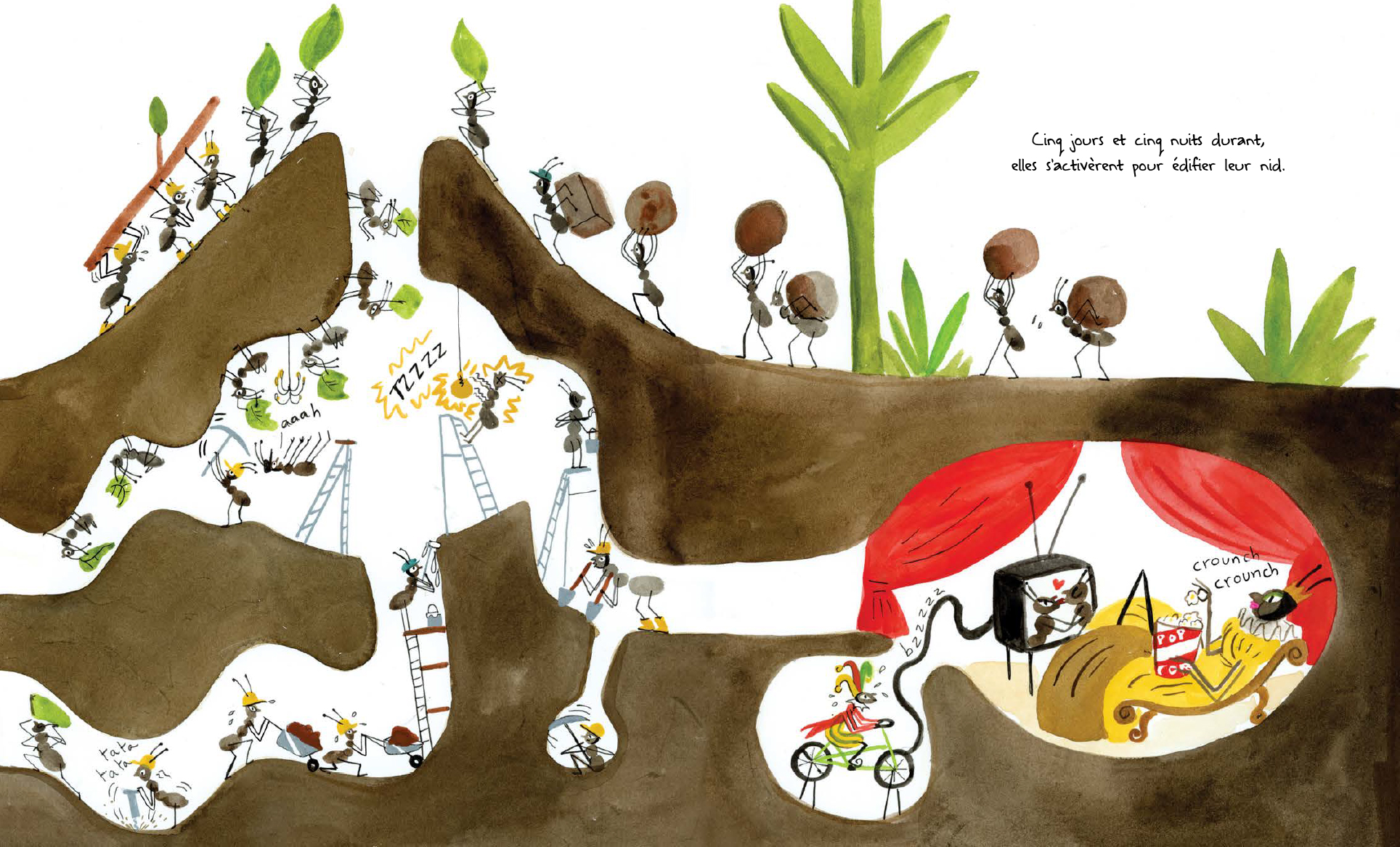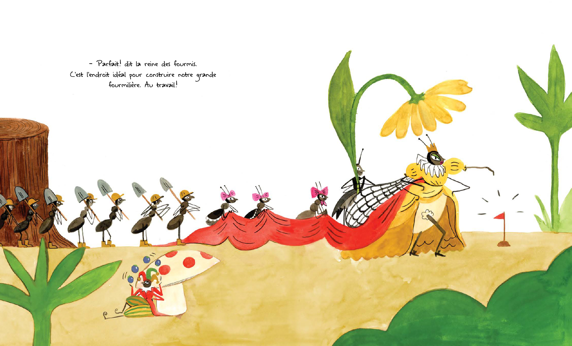 « Parfait! C’est l’endroit idéal pour construire notre grande fourmilière. Au travail! », s’exclame la reine des fourmis. Mais la fourmilière ne tient jamais plus que quelques instants, elle disparaît chaque fois sous la gigantesque patte d’un éléphant qui passe par là… Et si cet endroit idéal ne l’était pas vraiment? Surtout, ne pas contrarier la reine! Les fourmis s’affairent donc, de jour comme de nuit, alors que leur souveraine se prélasse au soleil, écoute la télé et relaxe dans son bain, un verre à la main. «Il est temps de construire la plus grande fourmilière de toute l’histoire des fourmis!» Rien ne les en empêchera! Quoique…