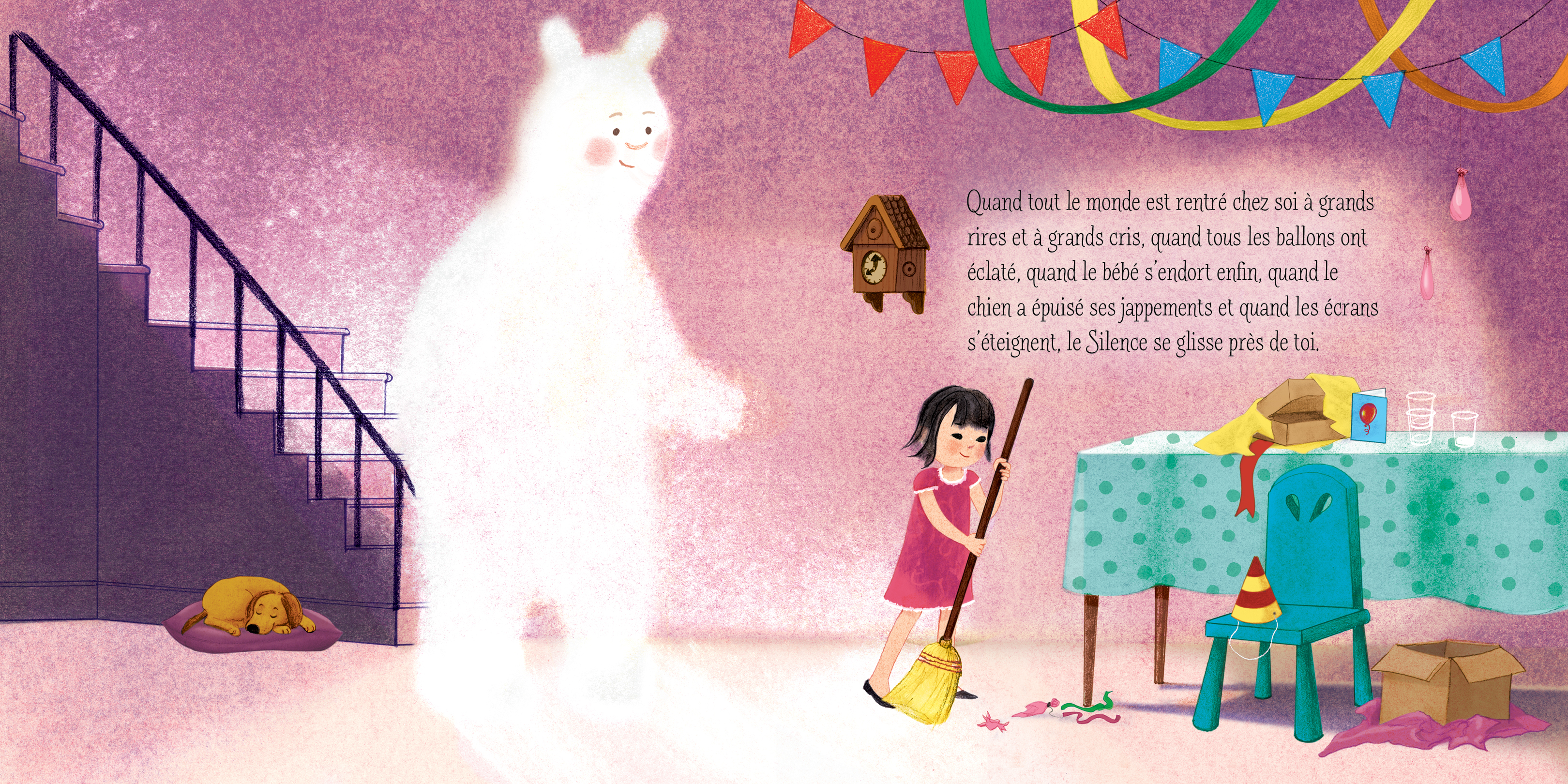 Quand la fête est finie et que le bébé s'endort enfin, quand le chien a épuisé ses jappements et que les écrans sont éteints, le Silence s'avance à pas feutrés sur ses pattes poilues. Le Silence—une présence chaleureuse et réconfortante—se blottit douillettement comme un chat dans un rayon de soleil et nous aide à lire, à réfléchir et àtre calmes. Le Silence est un ami de l’Obscurité. Ensemble, ils adoucissent les contours déchiquetés laissés par le passage du Bruit et relâchent doucement dans la nuit les bateaux chargés de nos rêves. Quand la journée devient pénible ou que certaines émotions prennent trop de place, le Silence se glisse à côté de nous.