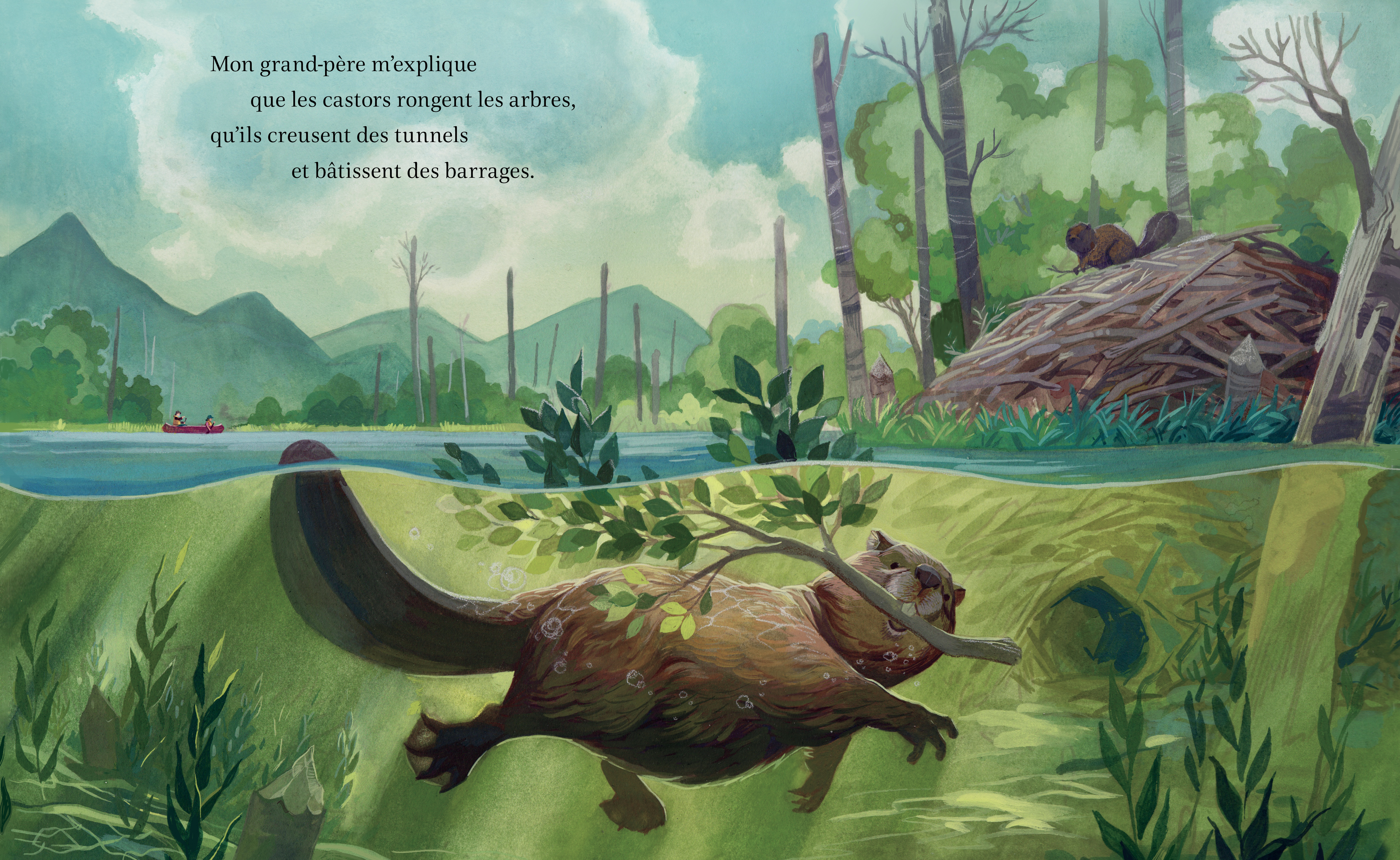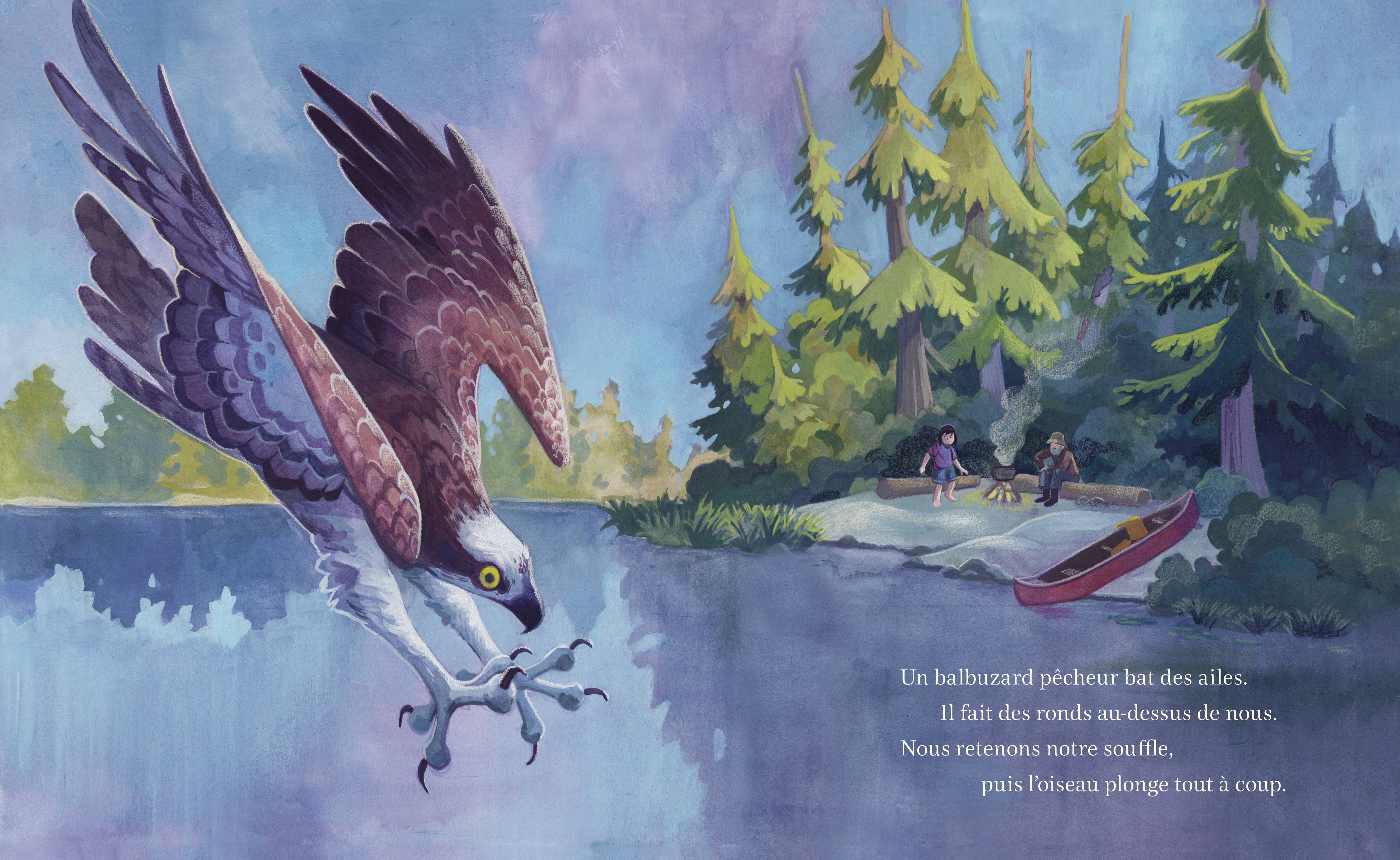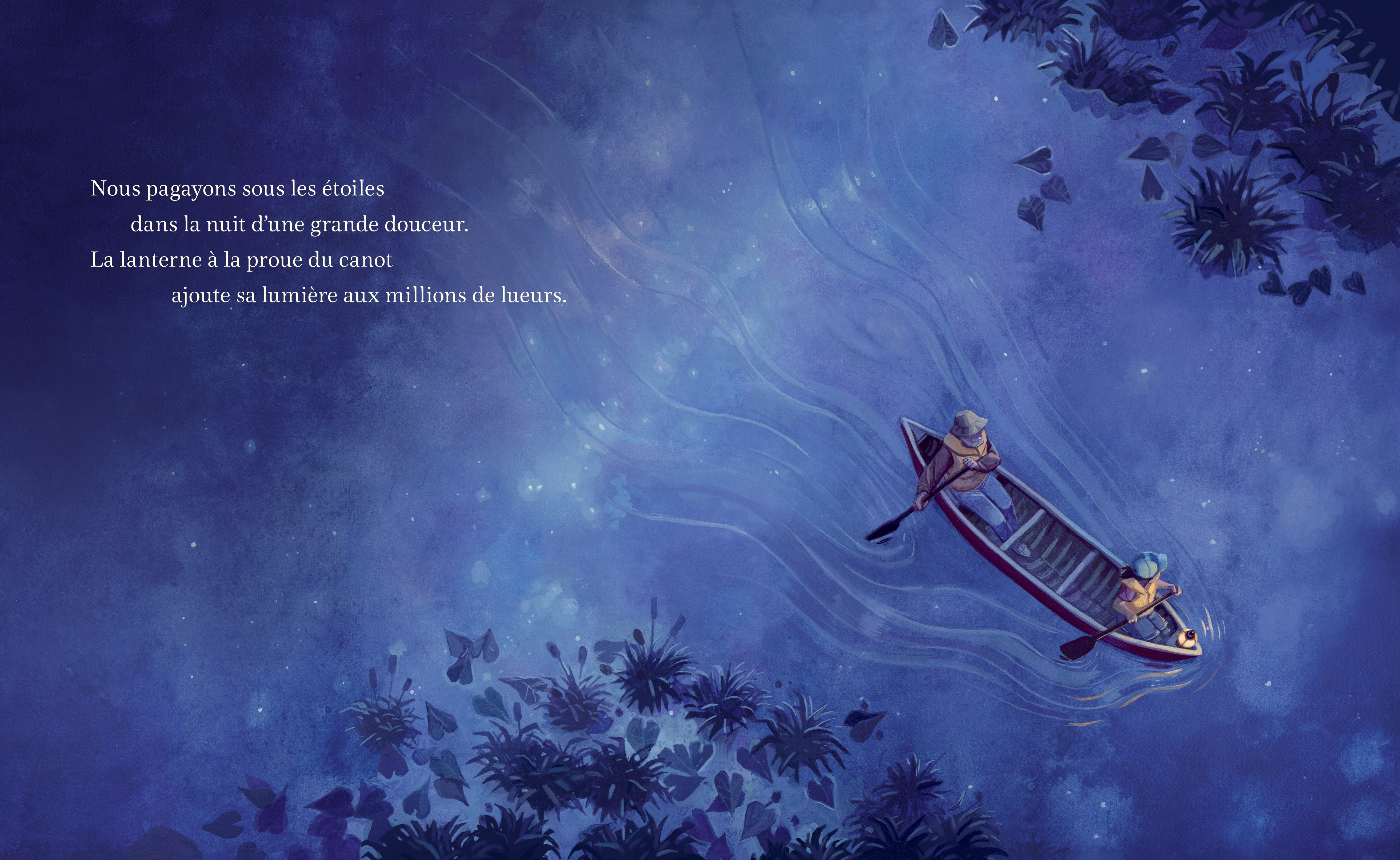 Des poissons et des hérons, des tortues et des libellules, des huttes de castor et des feuilles de nénuphar... Une multitude de merveilles enchantent la jeune narratrice et tous les amoureux de la nature qui seront séduits par cet album tendre et magnifiquement illustré. Les canetons se promènent sur le dos de leur maman; un balbuzard s'élève avec un poisson argenté dans ses serres; le cri du huard s'élève dans la nuit étoilée. Ces images sont évoquées dans des quatrains épousant le rythme des coups de pagaie.