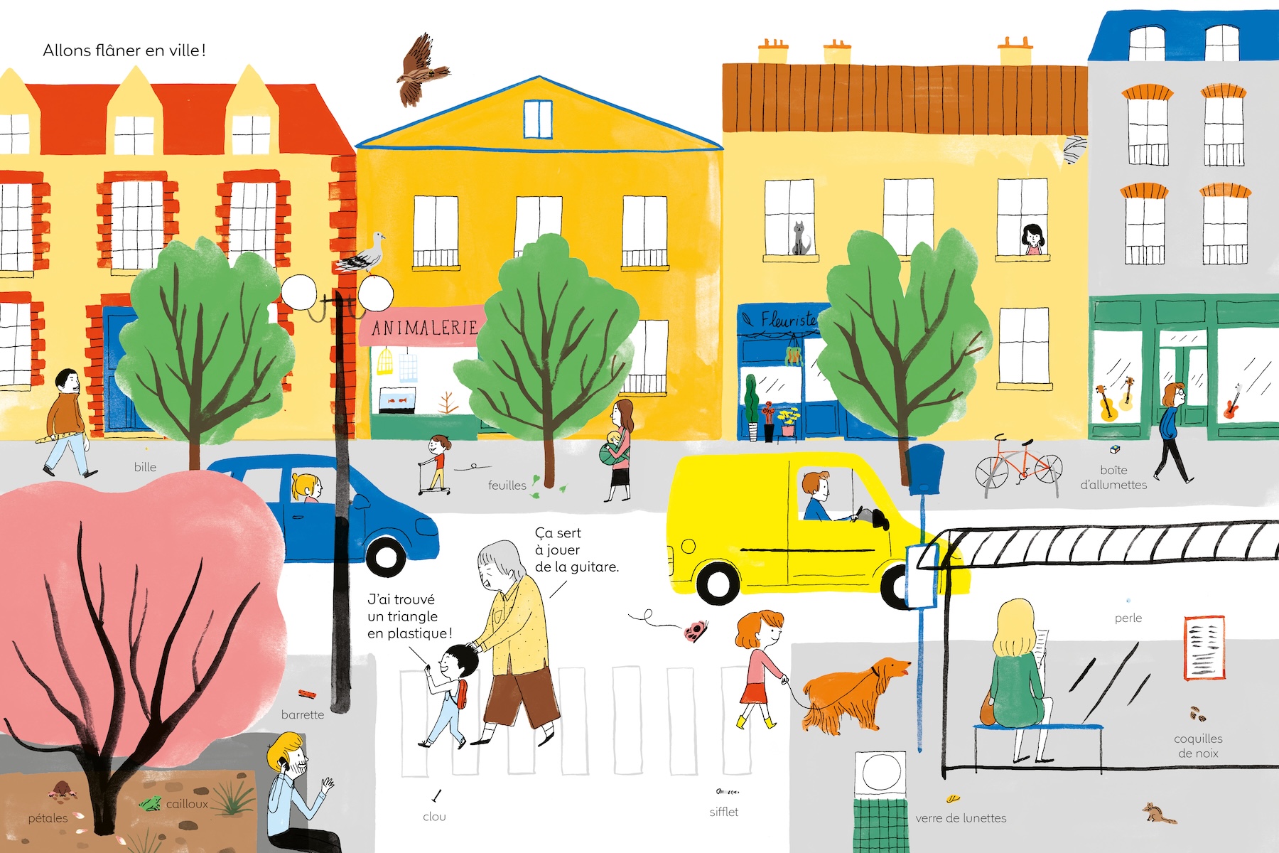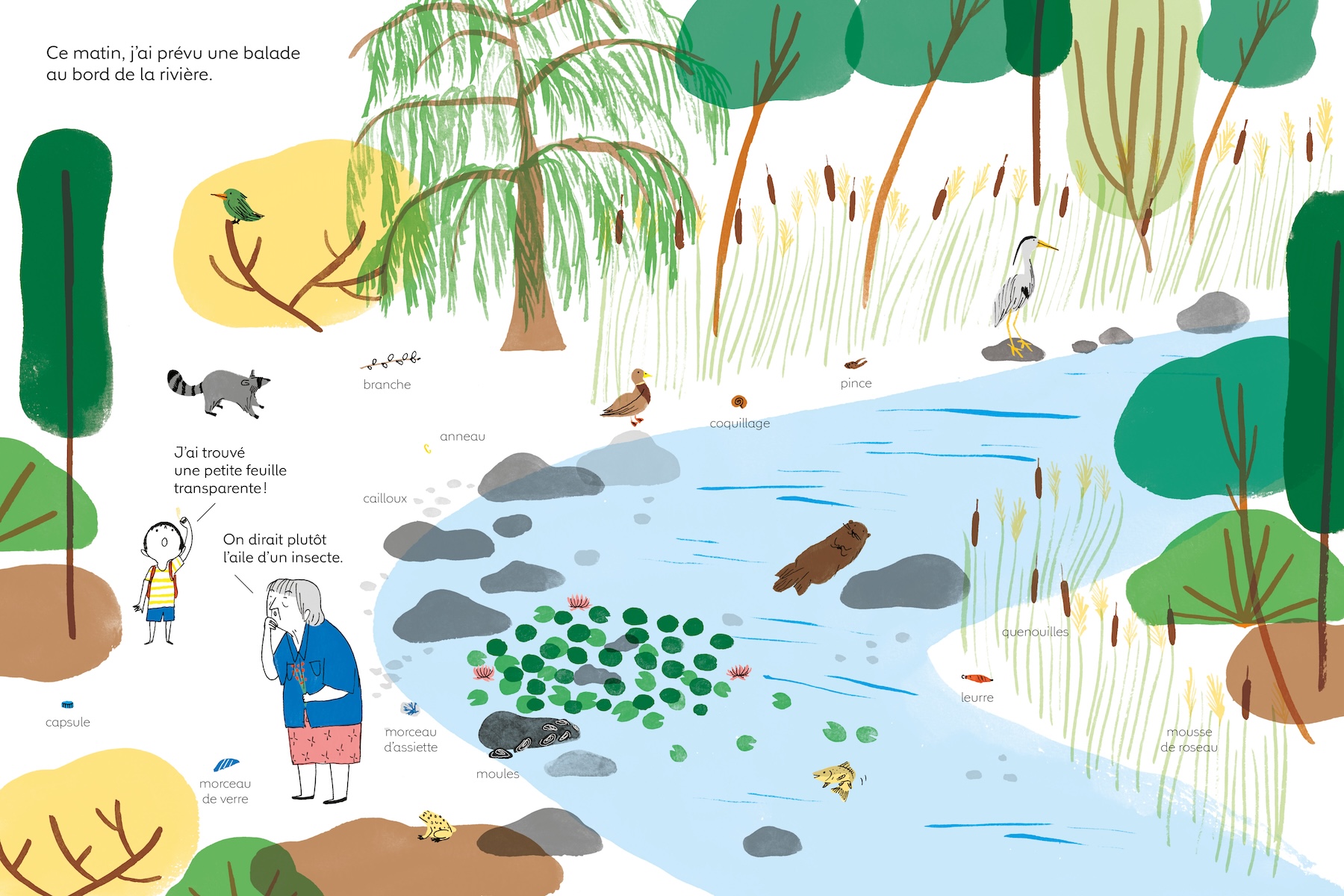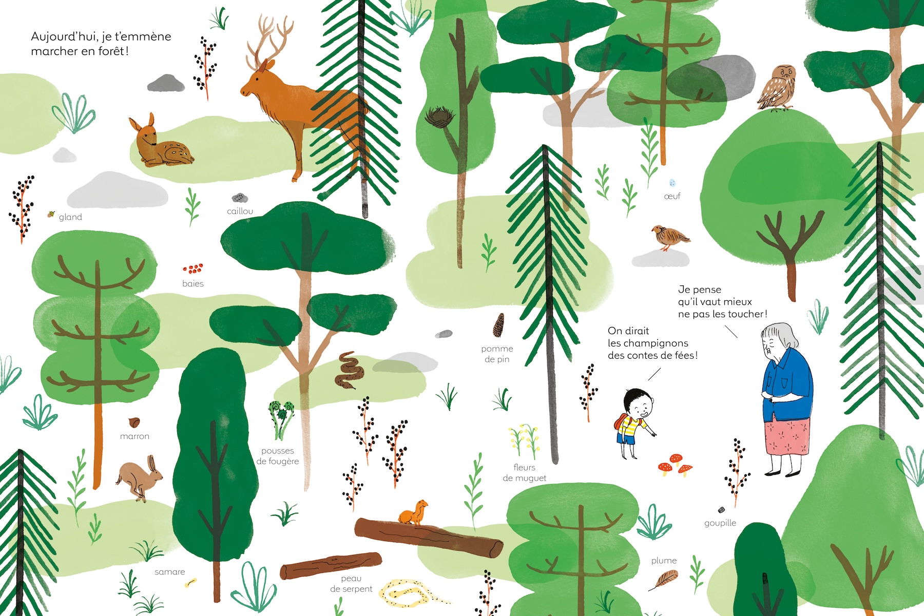 Tatsuo adore ramasser toutes sortes de petits objets qu’il trouve dans la nature. Sa mamie le sait bien. Elle lui offre un beau sac rouge pour y mettre ses trésors. Mamie, elle, adore accompagner Tatsuo dans ses promenades et partager ses découvertes.