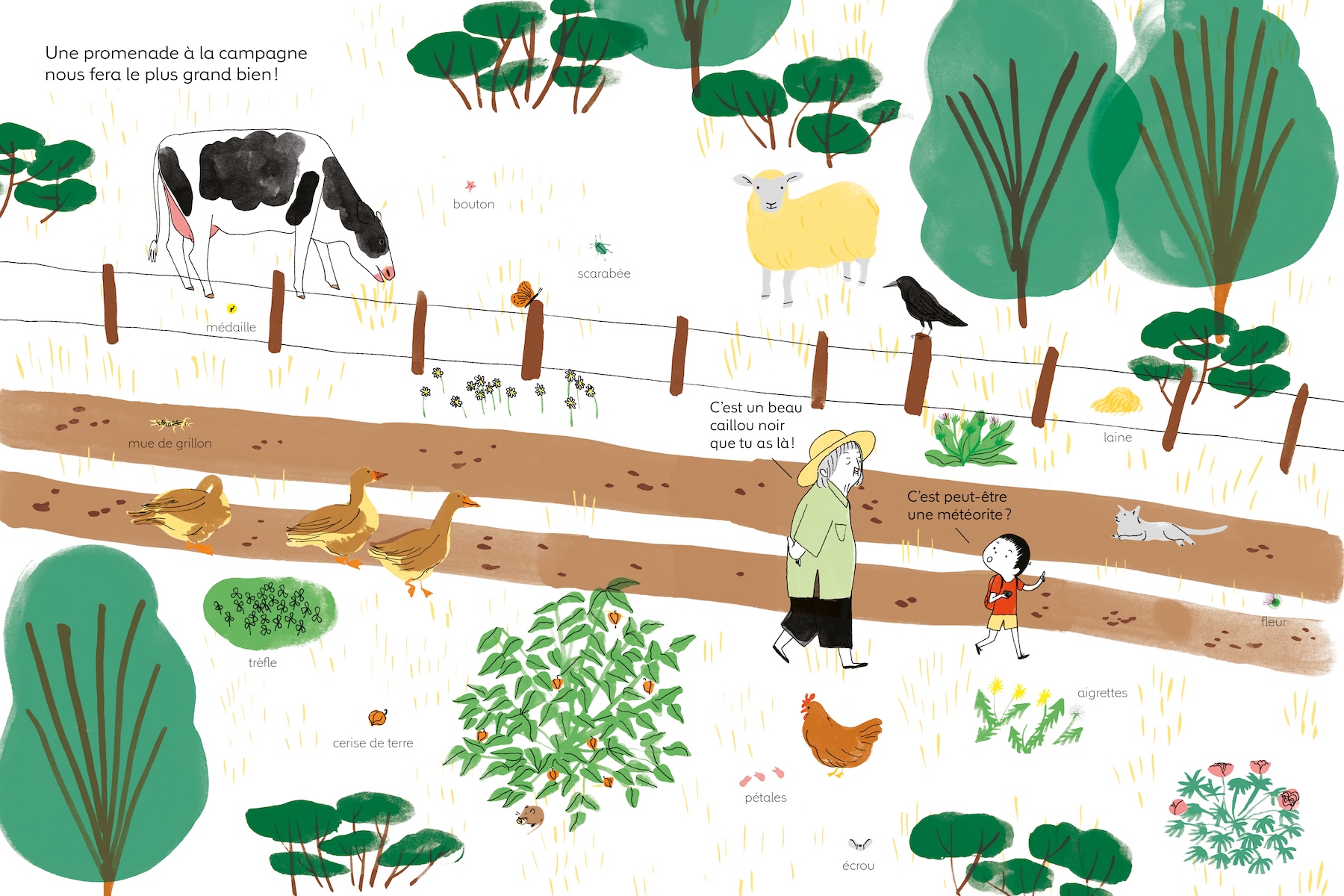 Nos deux promeneurs contemplent ce qui les entoure, s’émerveillent des beautés de la nature et des petites traces laissées par l’Homme.